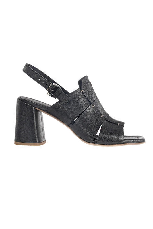 HENRY BEGUELIN Old Iron Leather Heel Sandal in Nero. Classic slingback heeled sandal handcrafted with...