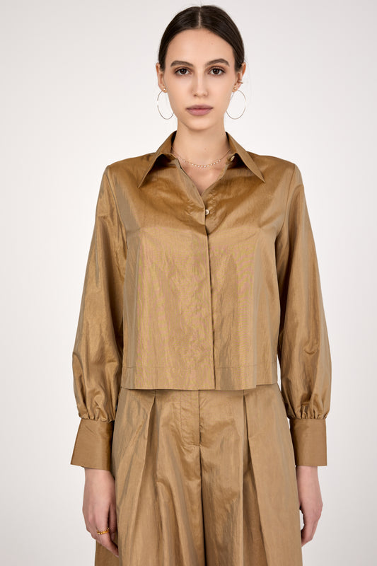The PESERICO Cropped Shirt in Camel, crafted from a lightweight iridescent silk blend, reflects modern...