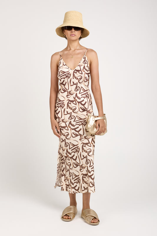 The AERON Prima Maxi Dress in Sienna features an elegant bias-cut design with an abstract...