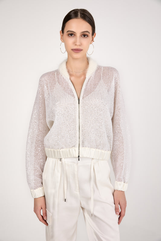 Sequined Mesh Bomber Jacket in Natural White