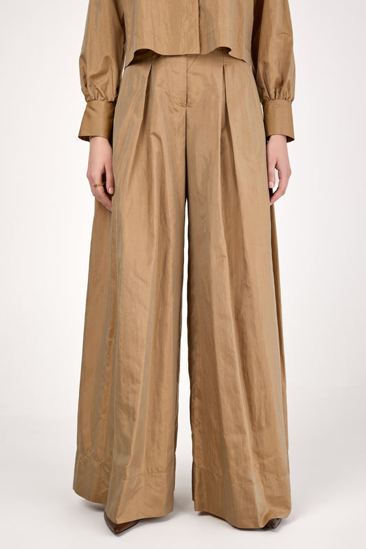 The PESERICO Wide Leg Trouser in Camel, crafted from a lightweight iridescent silk blend, reflect...