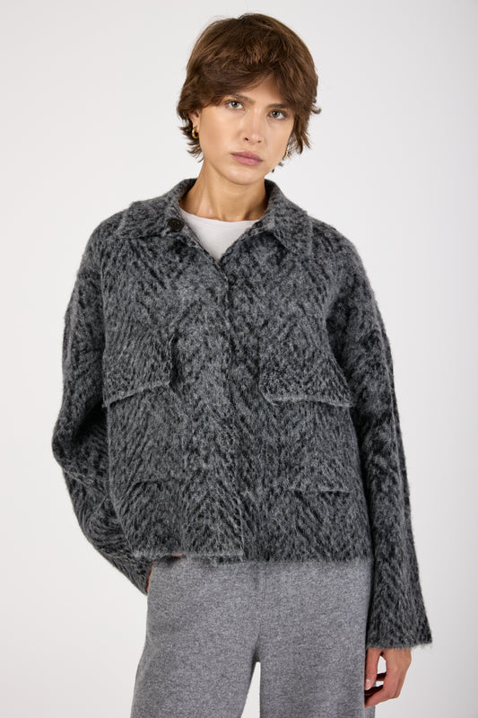 (NUDE) Knit Jacquard Chevron Jacket in Grey Black. A vintage aesthetic, oversized shirt style jacket...