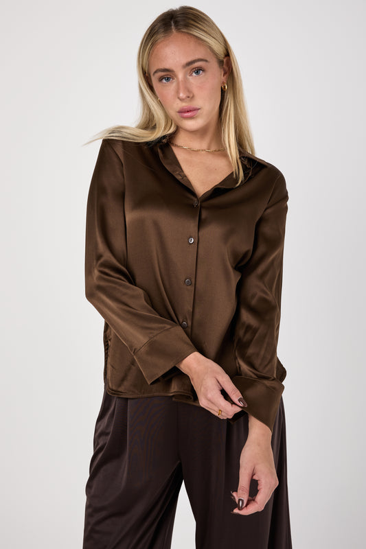 MAX MARA Finire Silk Blouse in Brown. Elegant silk satin blouse featuring a classic button-down design,...
