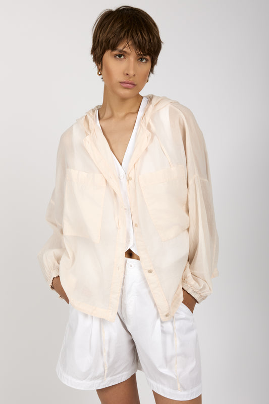 The TANDEM Hooded Cotton Jacket in Cream offers lightweight comfort with a relaxed, minimalist design....