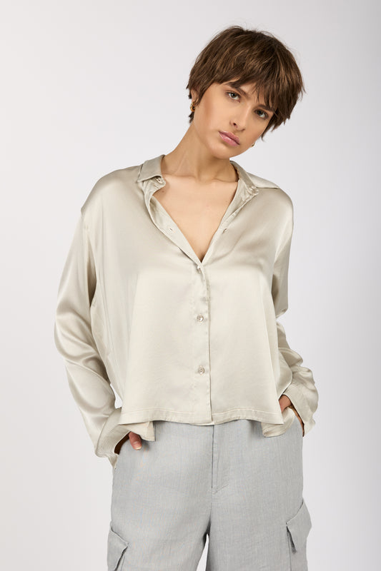 Button-Down Stretch Silk Shirt in Pearl Grey