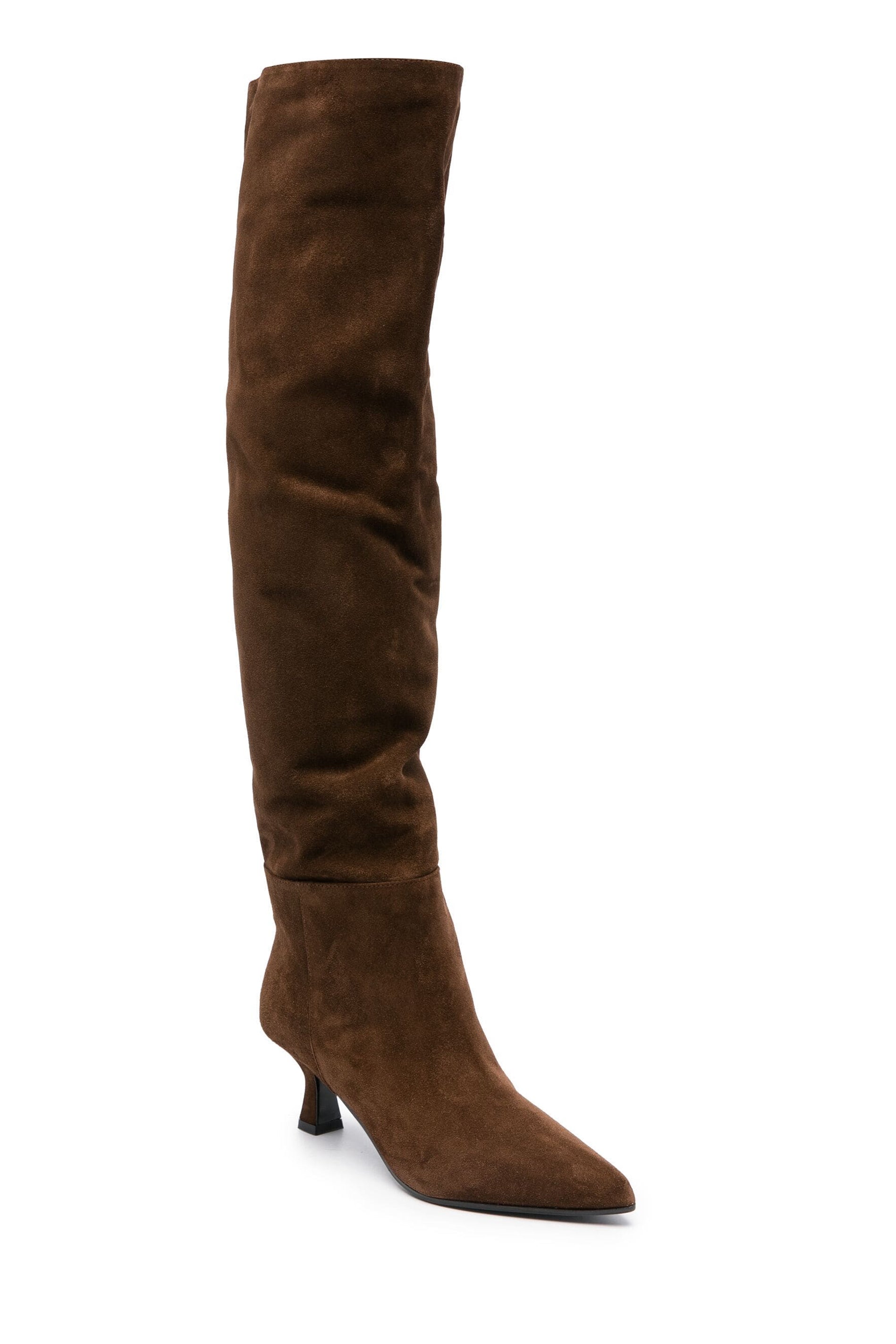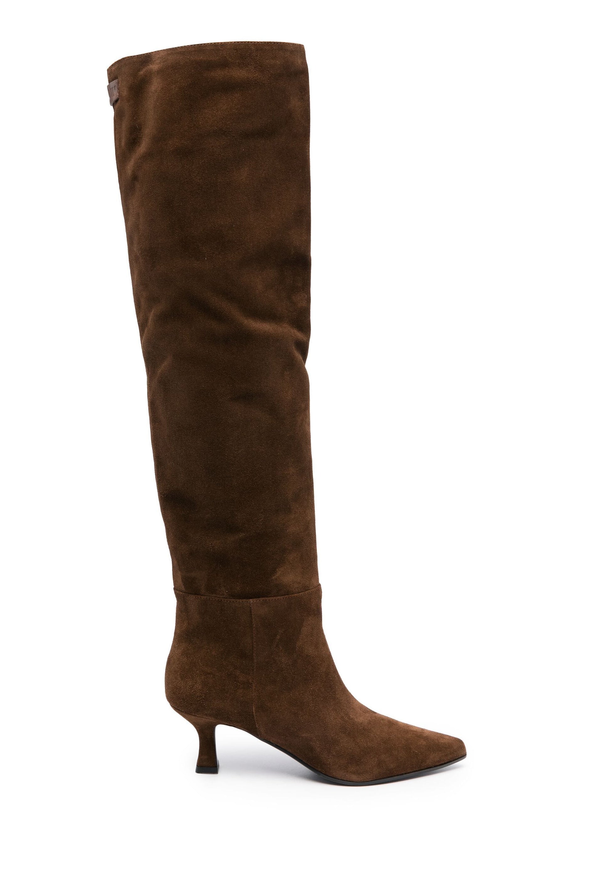 3JUIN Bea May Boot in Touch Coffee. Sleek and versatile tall boot crafted from premium calf leather. Featuring a rich coffee-brown hue, pointed toe, and a kitten heel. Modern elegance for an elevated casual and refined look.
