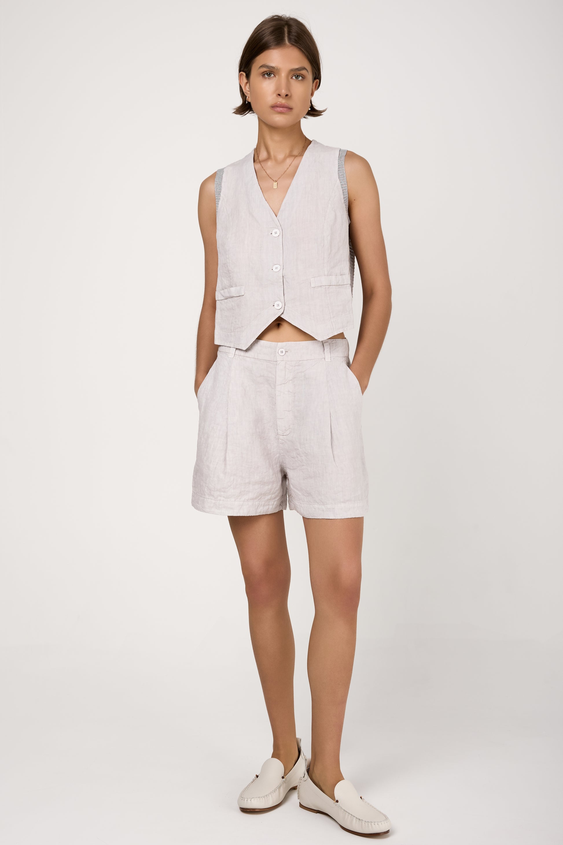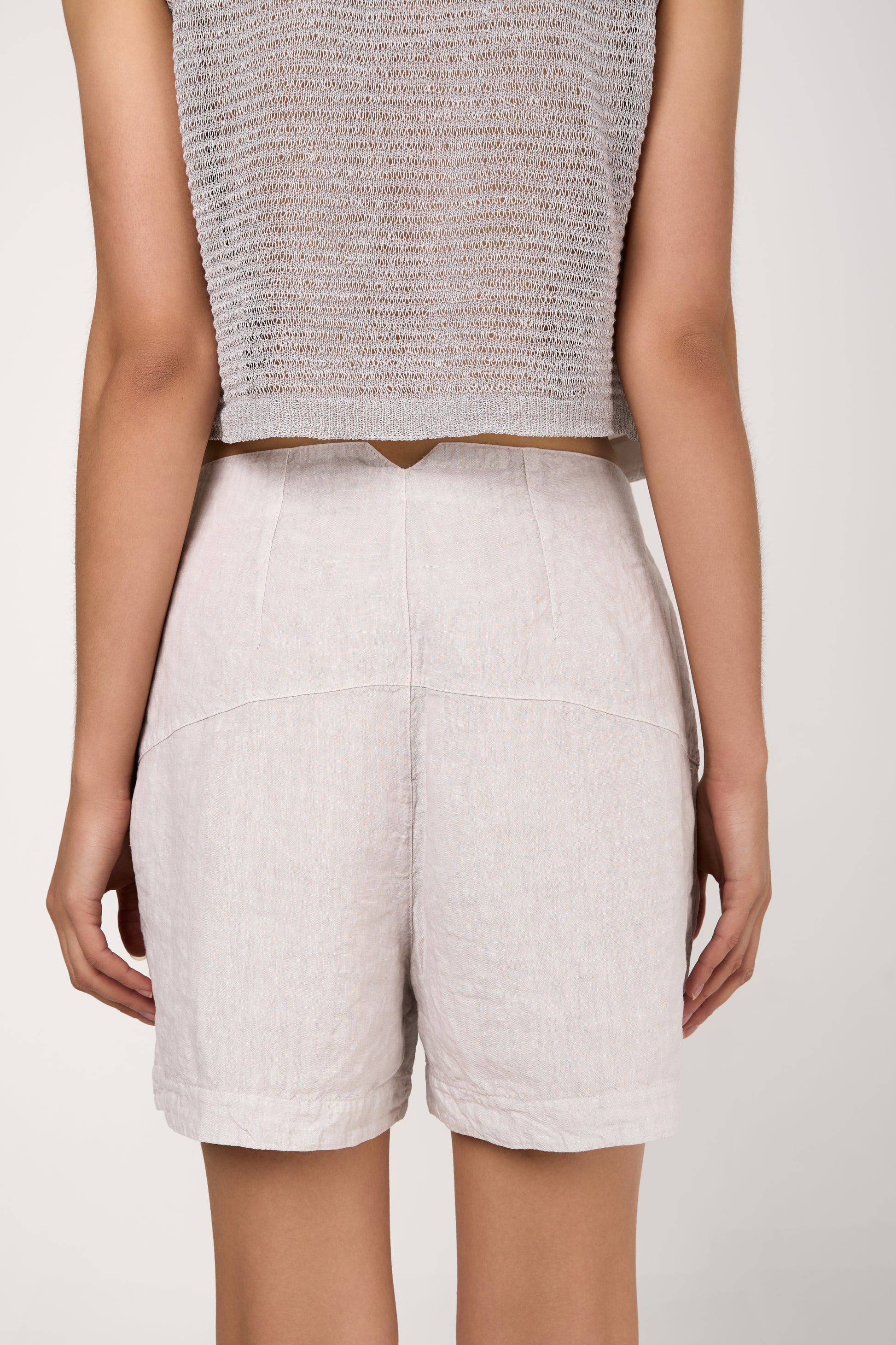 The TANDEM Linen Bermuda Shorts in Ice offer a sophisticated twist on a summer essential. Expertly made in Italy from high-quality linen in a soft, icy hue, these shorts feature a structured mid-rise waist, subtle pleats, and a relaxed leg that grazes just above the knee. They include discreet side pockets and a clean front closure.