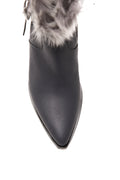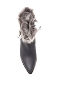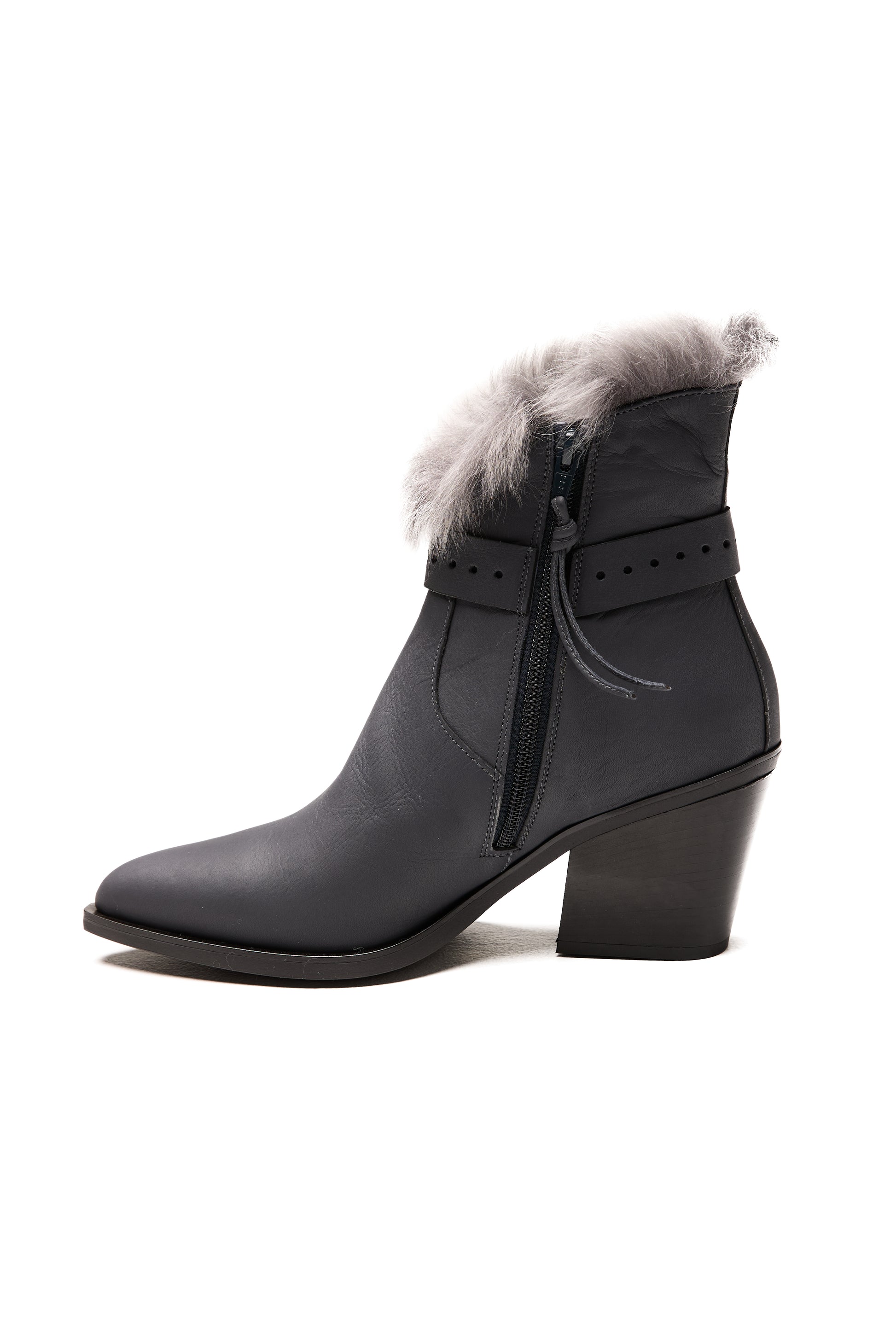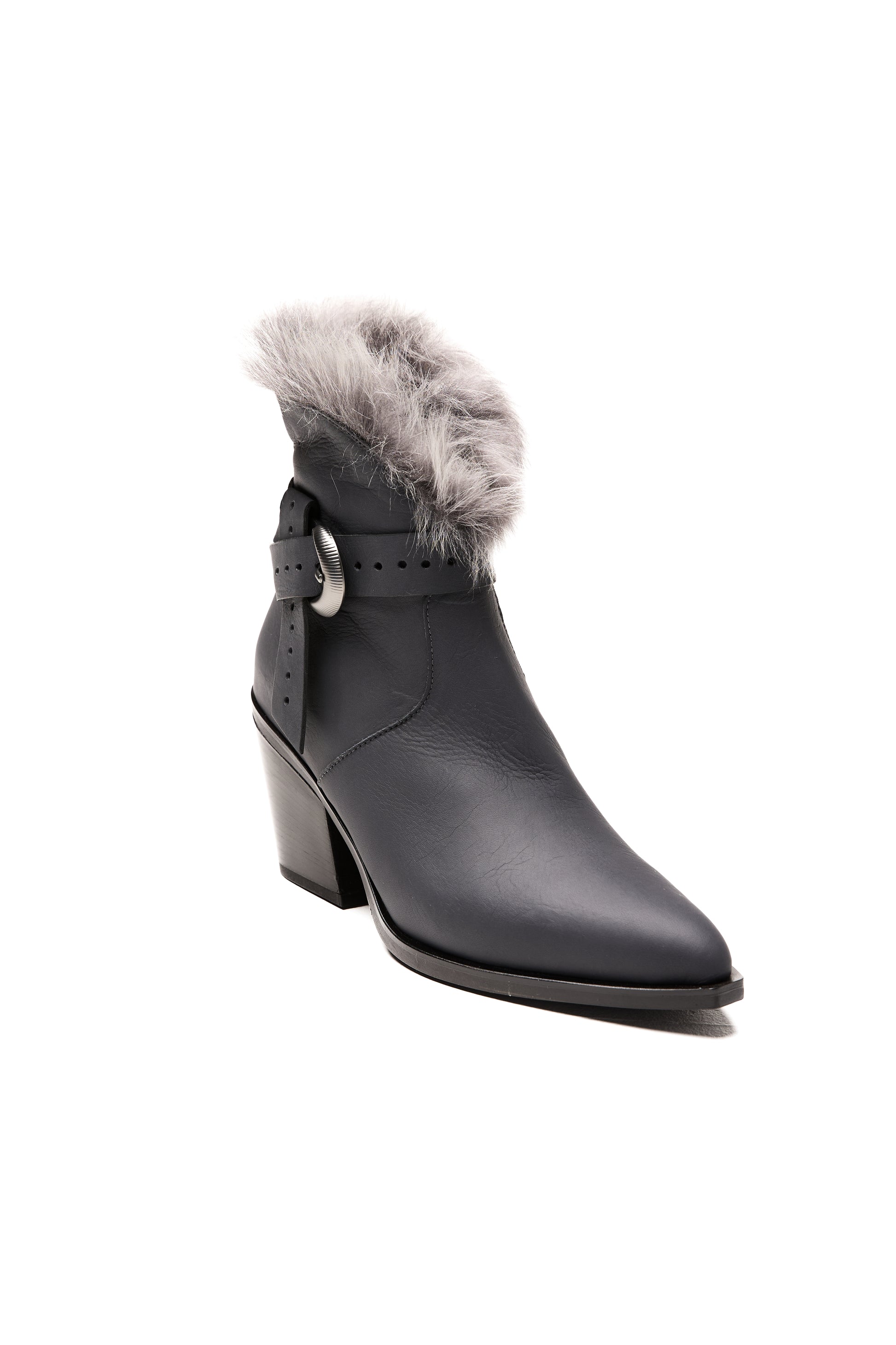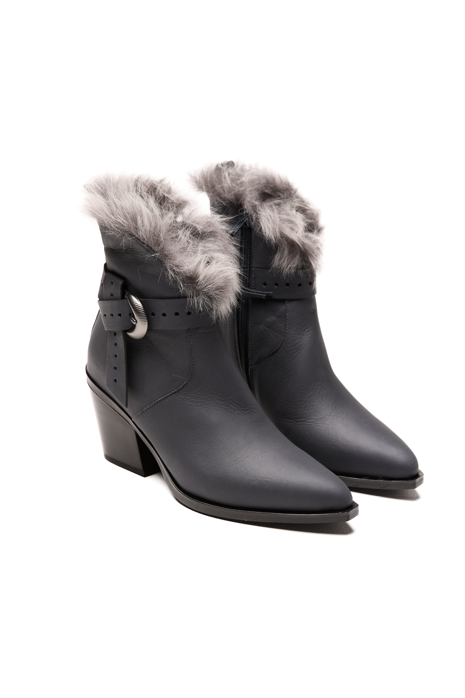The HENRY BEGUELIN Norton Toscana Leather Ankle Boot in Notte and Brisa Antracite is handcrafted in Italy from supple leather in rich tones of notte and brisa antracite. This Texan-inspired silhouette features a refined side zipper for effortless wear and a decorative leather strap with a statement buckle for a touch of modern edge. A plush Toscana fur trim crowns the design, adding warmth and luxurious texture.Ā