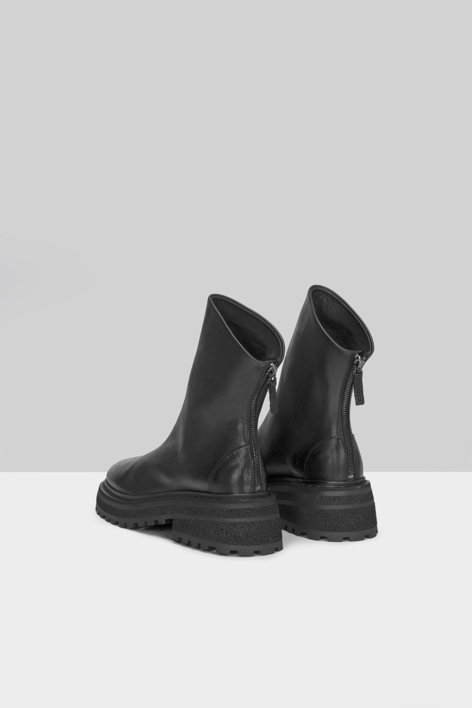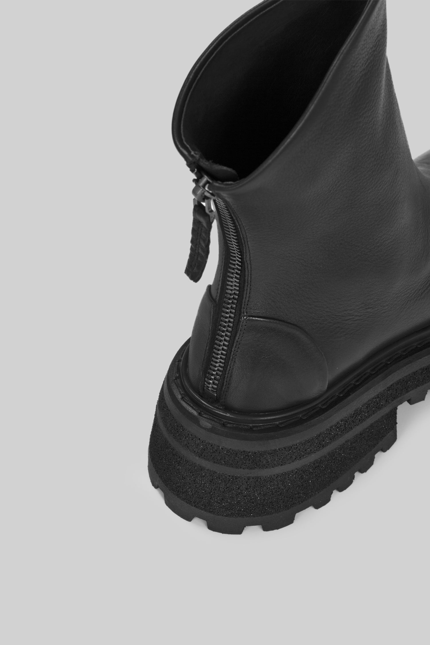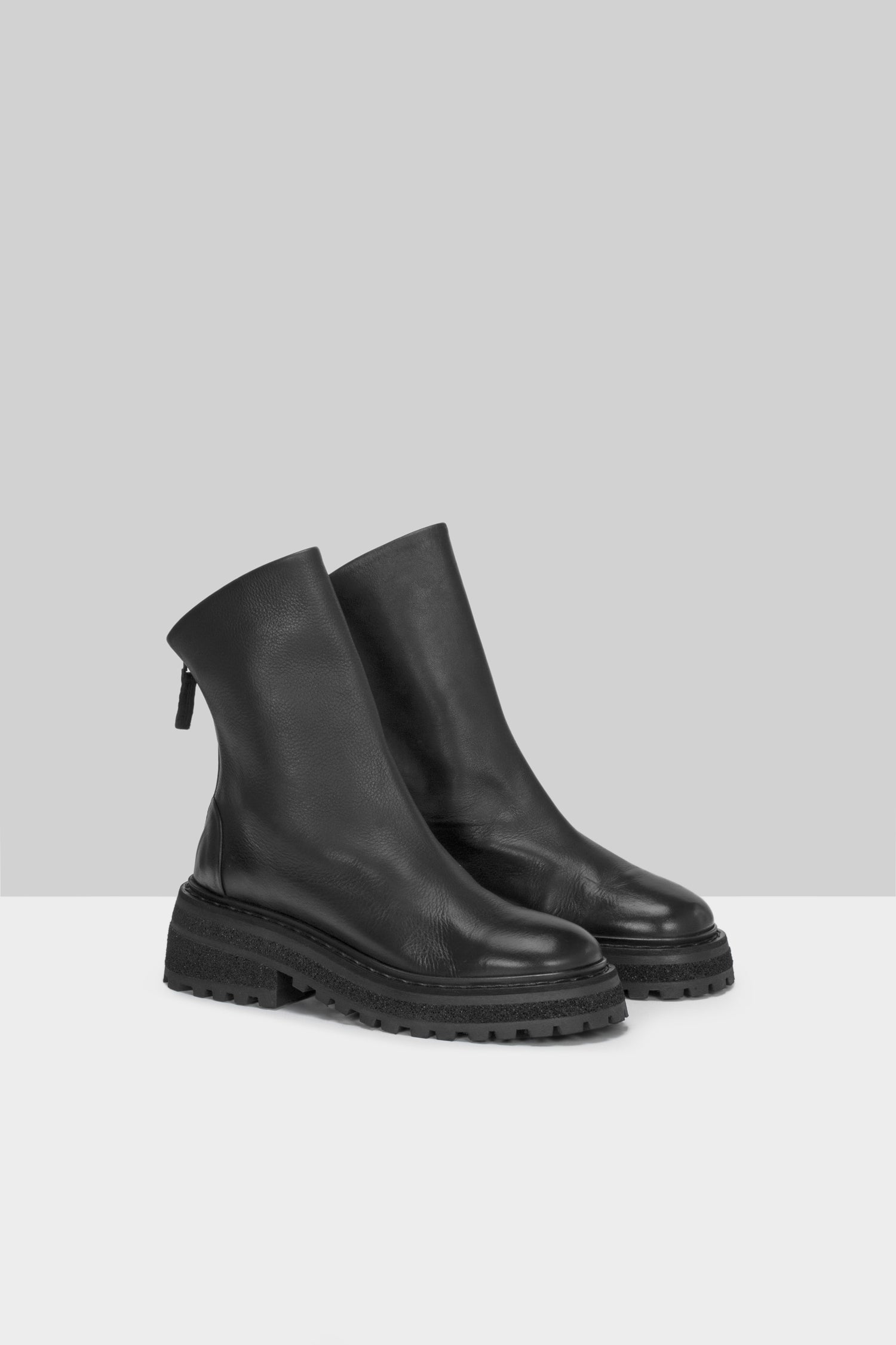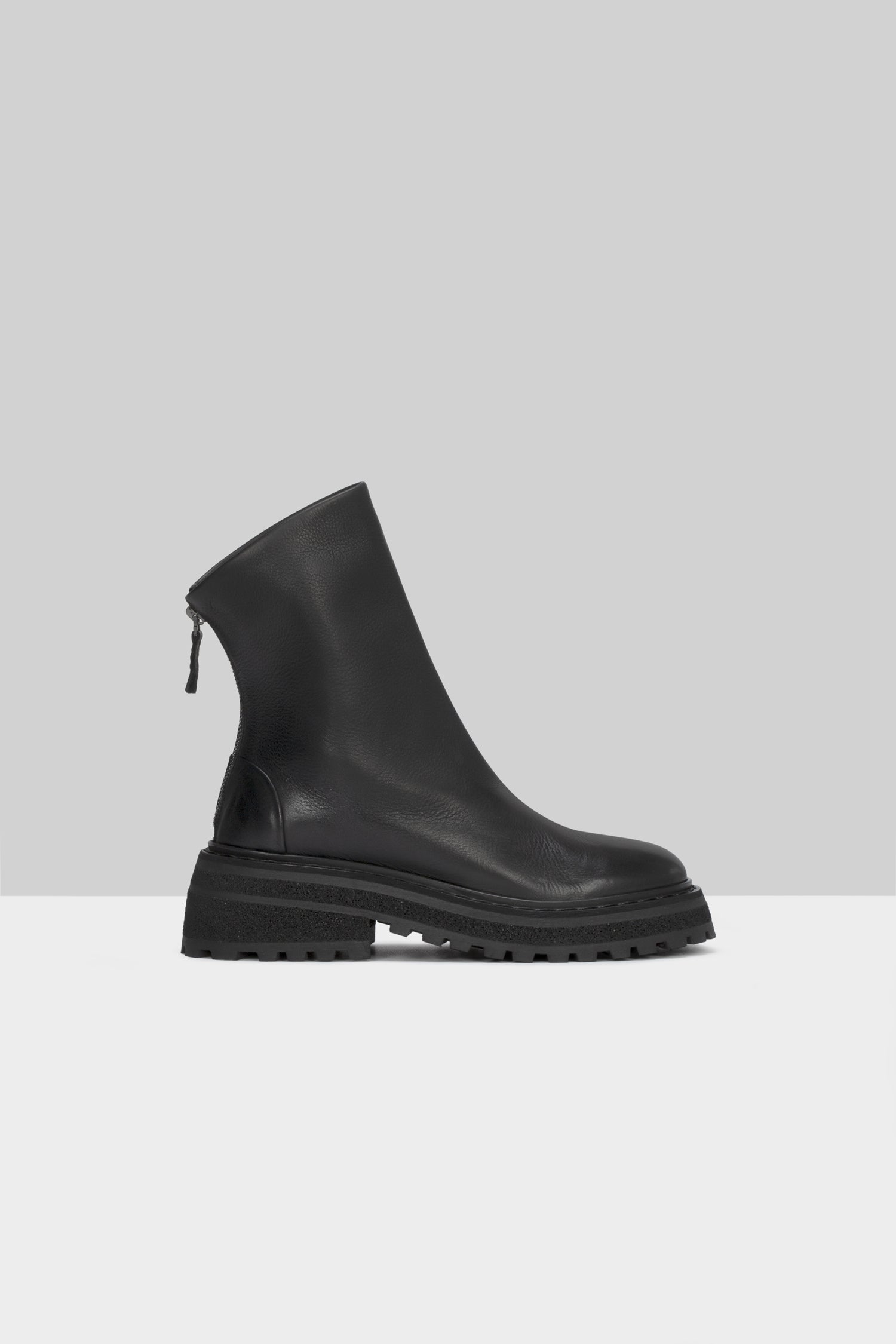 The MARSÈLL Carro Leather Ankle Boot in Black combines luxury and edge. Handmade in Italy, this ankle boot features premium leather, a unique multilayered sole, and a low wedge heel. The rear zip and Carrucola closure add style and convenience, making it a versatile choice for day-to-night looks.