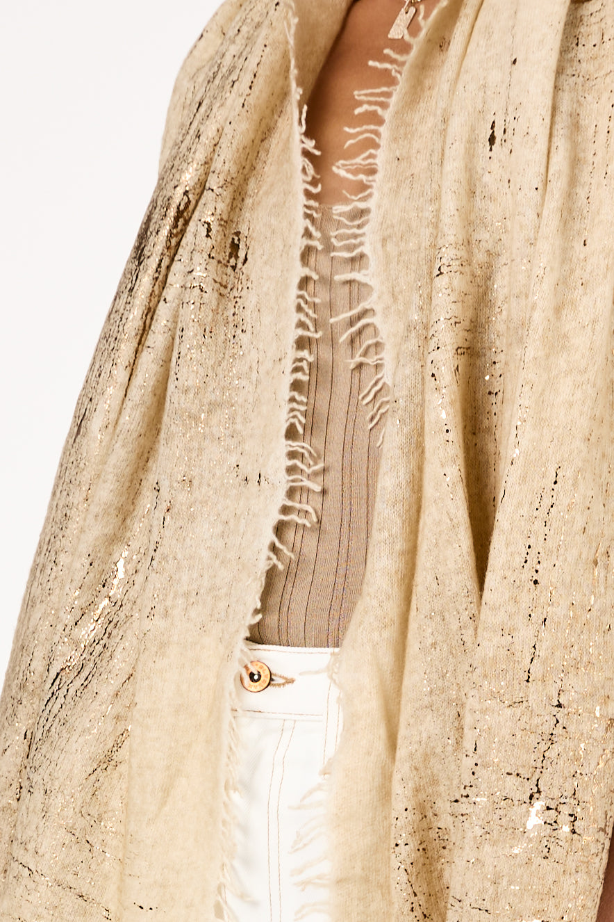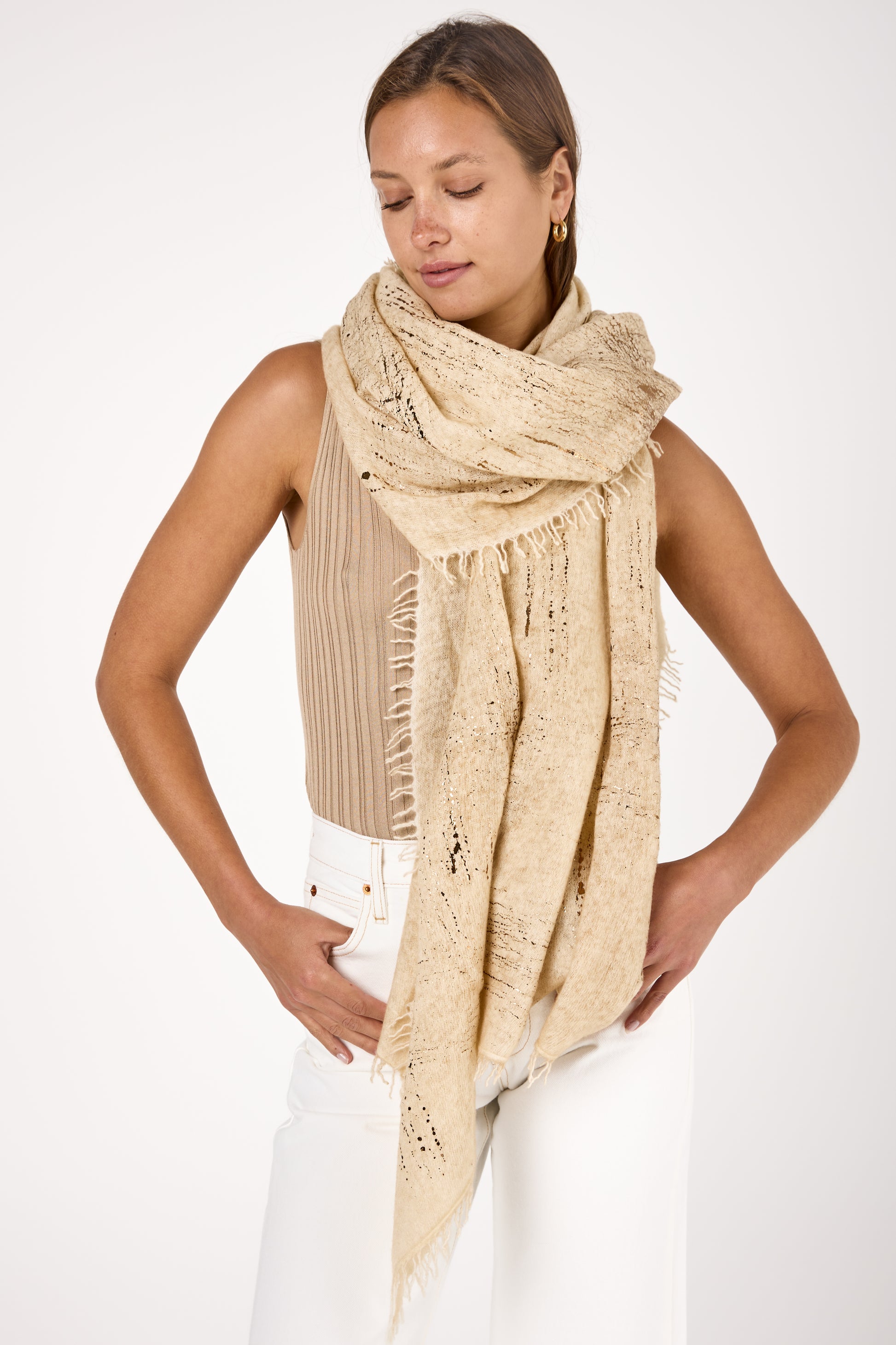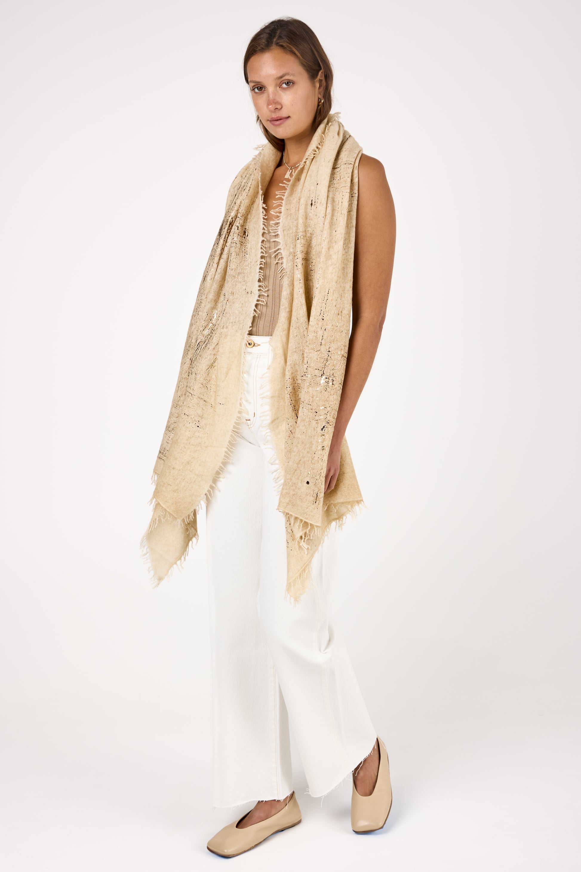 Experience the unparalleled luxury of Avant TOI with the Cashmere Scarf featuring Bronze Lamination in Burro. Crafted from the finest cashmere, this scarf is enhanced with a unique bronze lamination, lending a modern and sophisticated edge to any outfit. The Burro shade, a versatile warm neutral, effortlessly complements both casual and formal looks. A statement piece for those with a discerning taste, it combines supreme softness, warmth, and contemporary style. Discover the exquisite craftsmanship of Avant TOI and add a distinctive touch to your collection with this exceptional accessory.