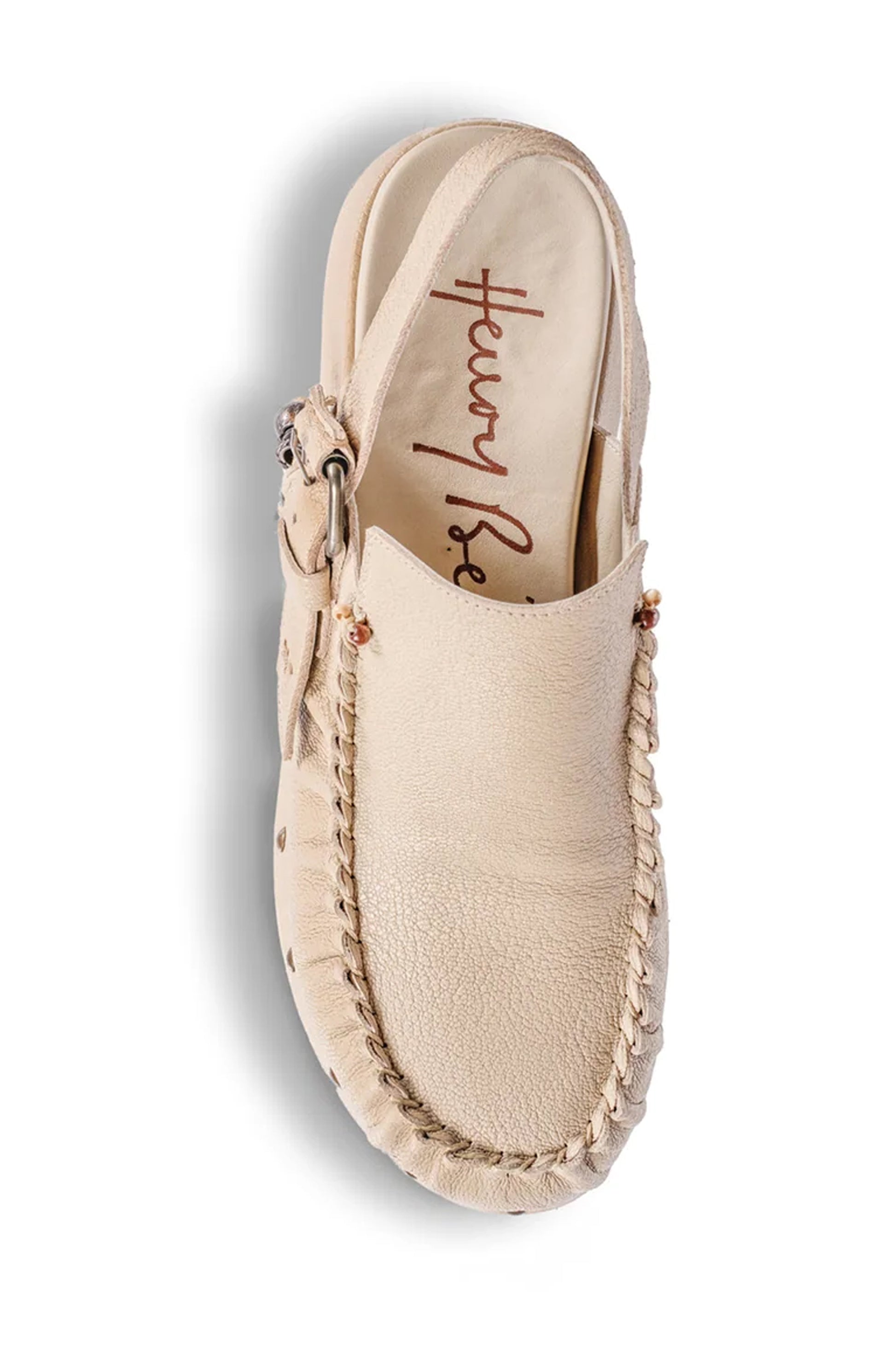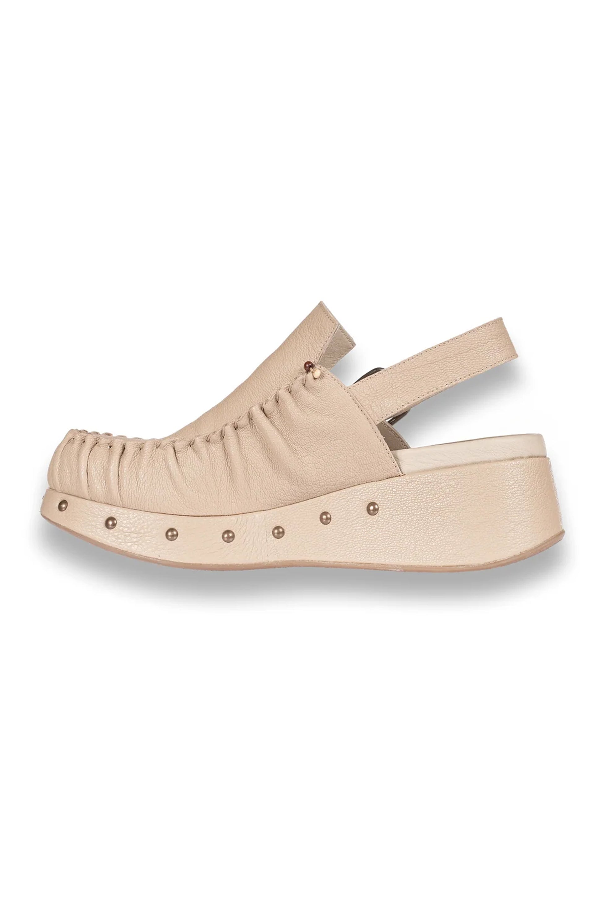 HENRY BEGUELIN Chanel Leather Wedge Loafer Shoe in Sabbia. Slip-on moccasin with a slingback design. Featuring a rounded toe, decorative studs on the sole, and an adjustable back strap. Handcrafted with timeless, martellato hammered leather for added style and comfort.Ā
