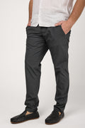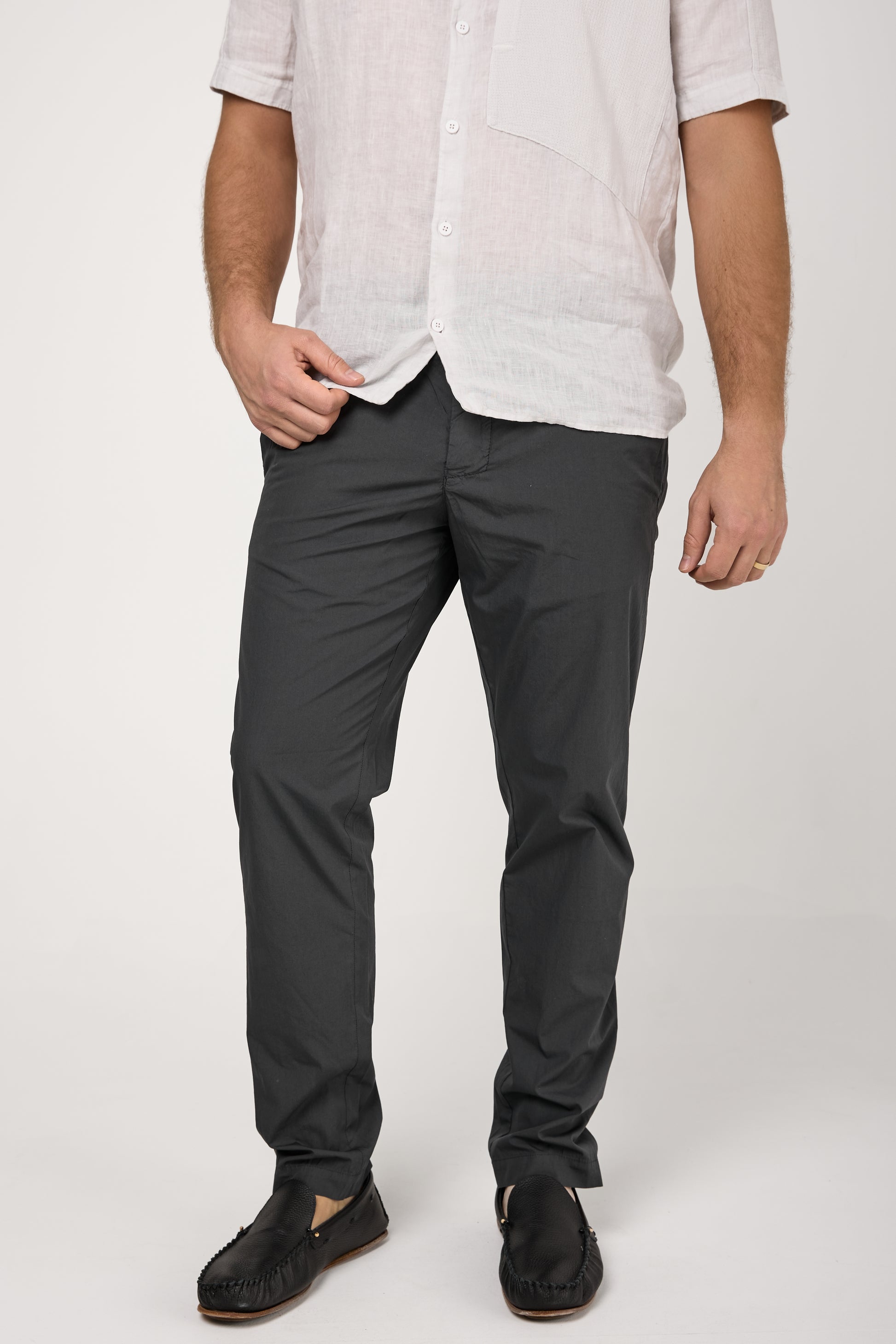 The TRANSIT Cotton Chino Trousers in Charcoal are expertly crafted in Italy from pure cotton and garment dyed for rich, dimensional color. Designed for comfort with an elasticated waistband, belt loops, and a button closure, they feature side seam pockets and yoke-aligned back pockets. Subtle thick thread detailing and cotton fibre buttons add a refined touch to this everyday essential.
