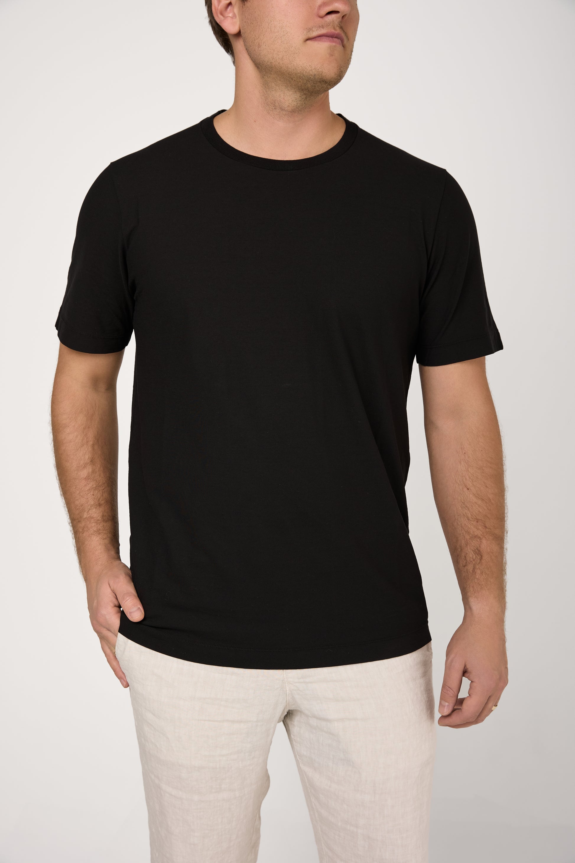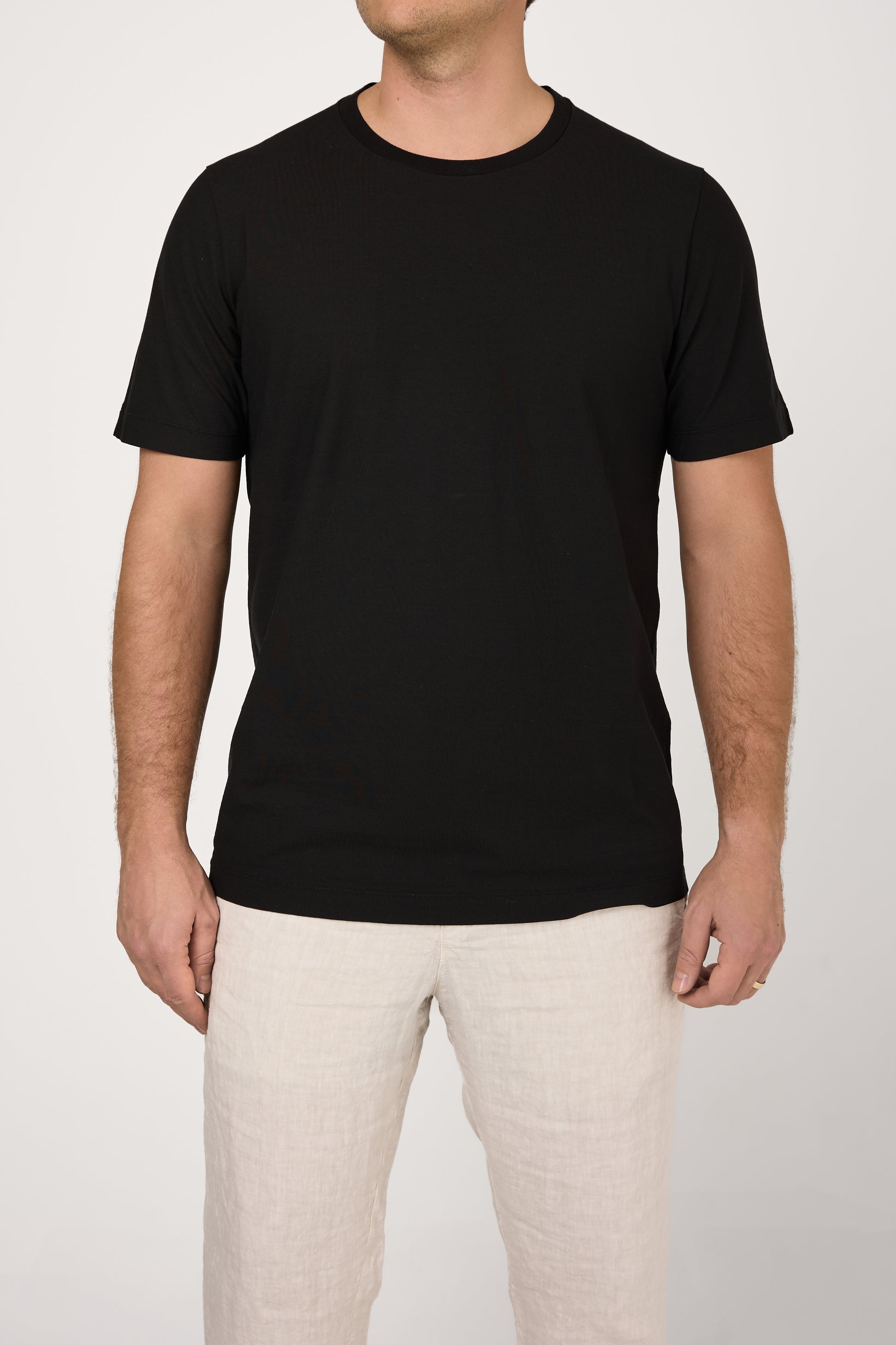 The TRANSIT Cotton Crepe Jersey T-Shirt in Black is crafted in Italy from soft cotton crepe jersey with a clean, regular fit. A round neckline is framed by a fine knitted trim, while a contrasting insert at the yoke adds texture and understated detail.