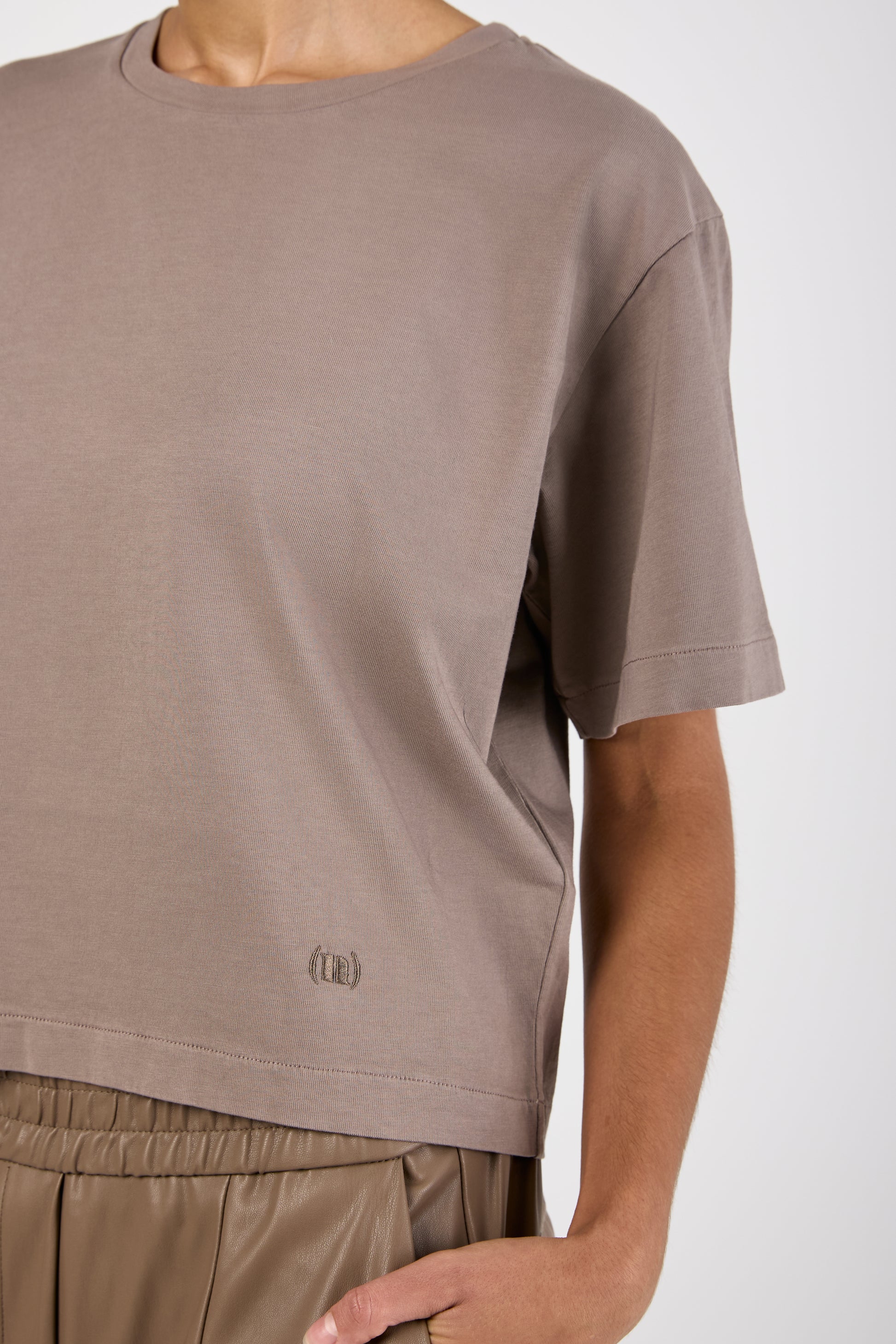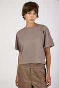 (NUDE) Cotton Crewneck Jersey T-Shirt in Mink. Classic cotton T-shirt design cut from soft organic cotton jersey. Featuring a cropped hem and a boxy silhouette with wider cut sleeves. Brand logo above the hem.