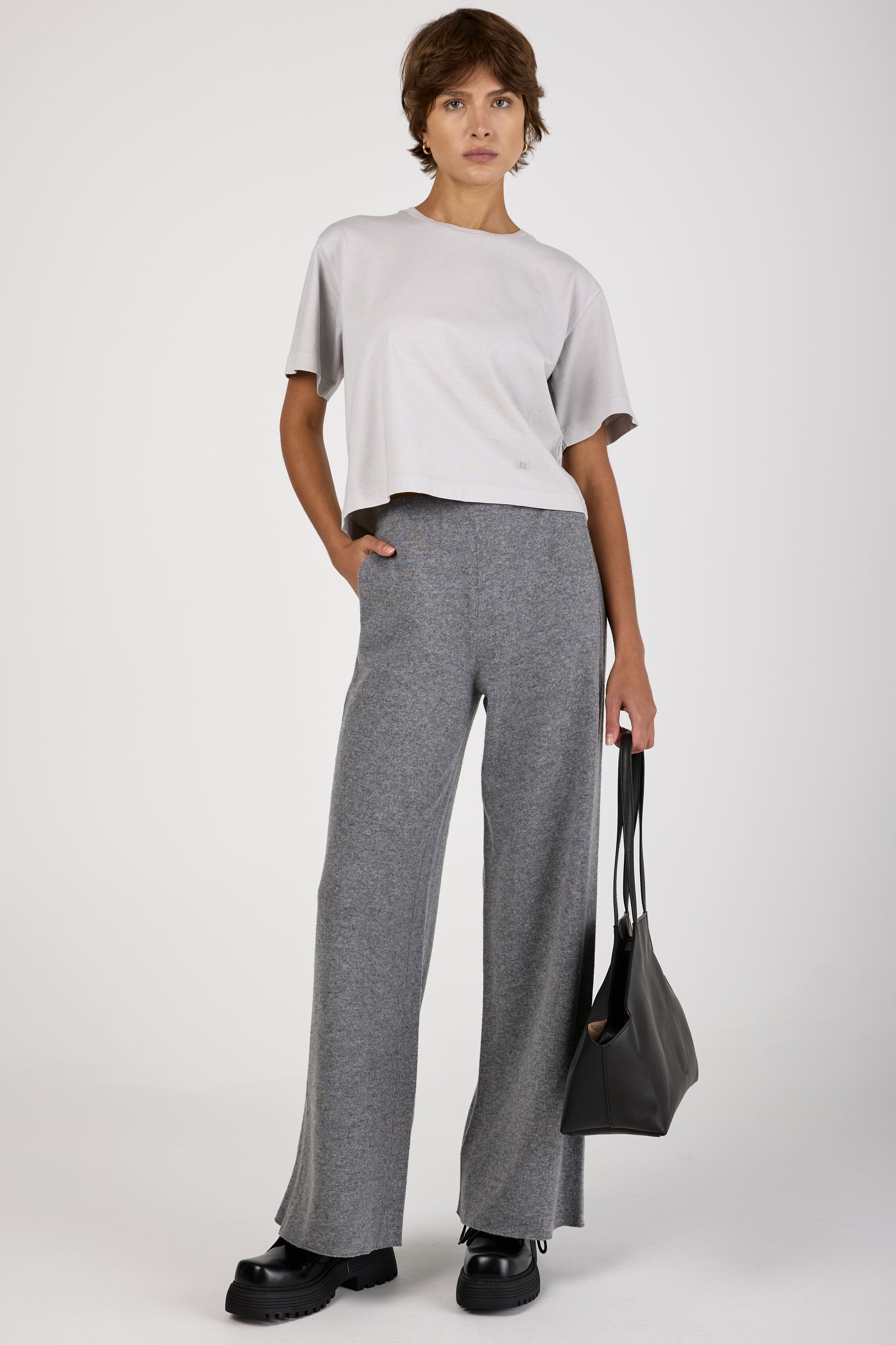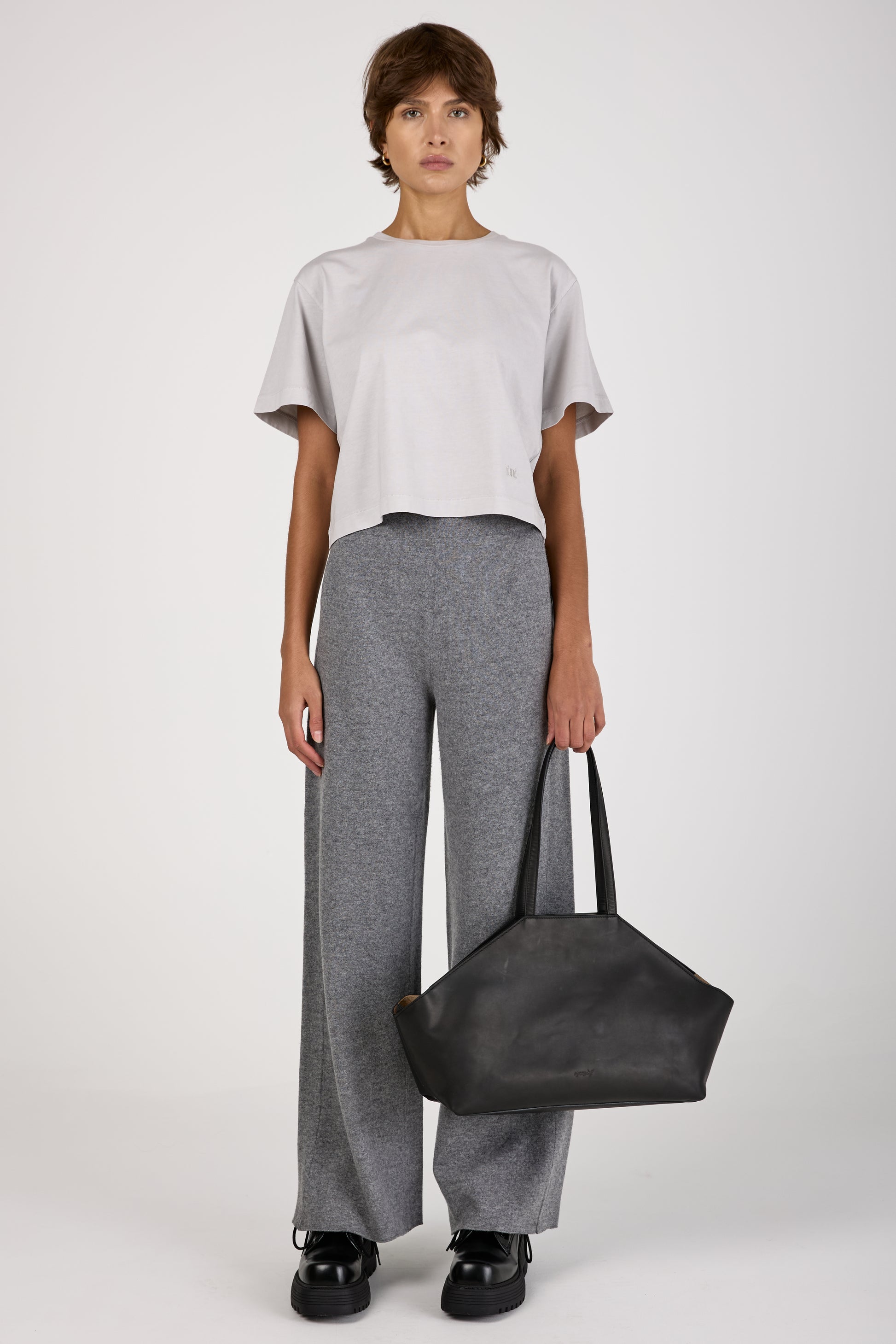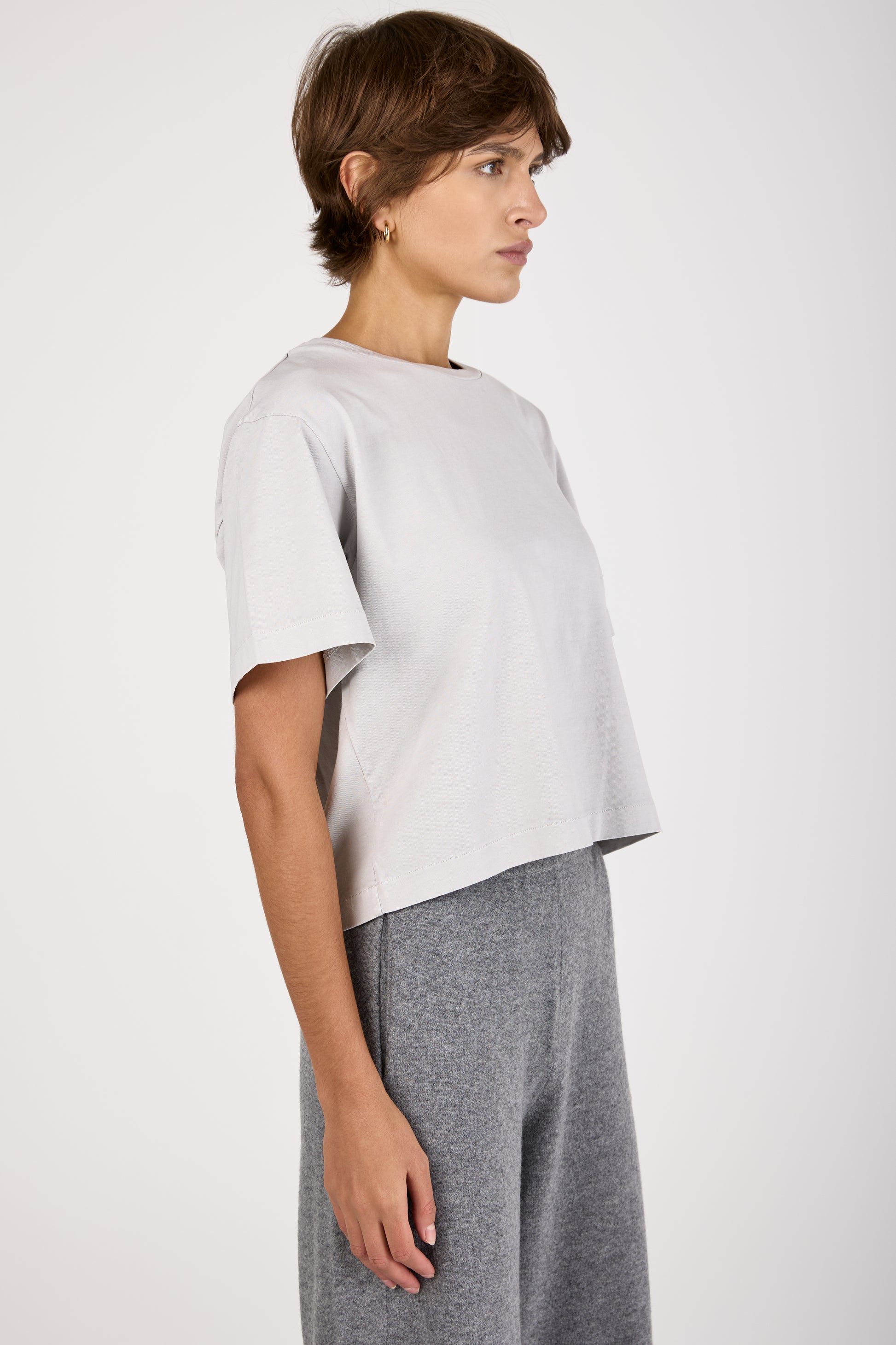 (NUDE) Cotton Crewneck Jersey T-Shirt in Ice. Classic cotton T-shirt design cut from soft organic cotton jersey. Featuring a cropped hem and a boxy silhouette with wider cut sleeves. Brand logo above the hem.