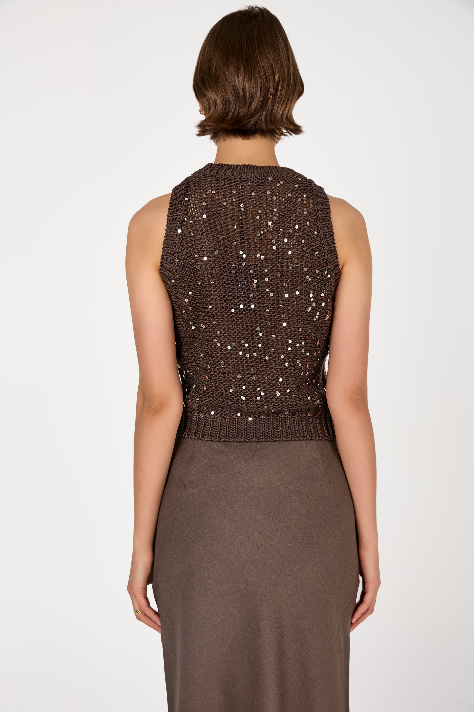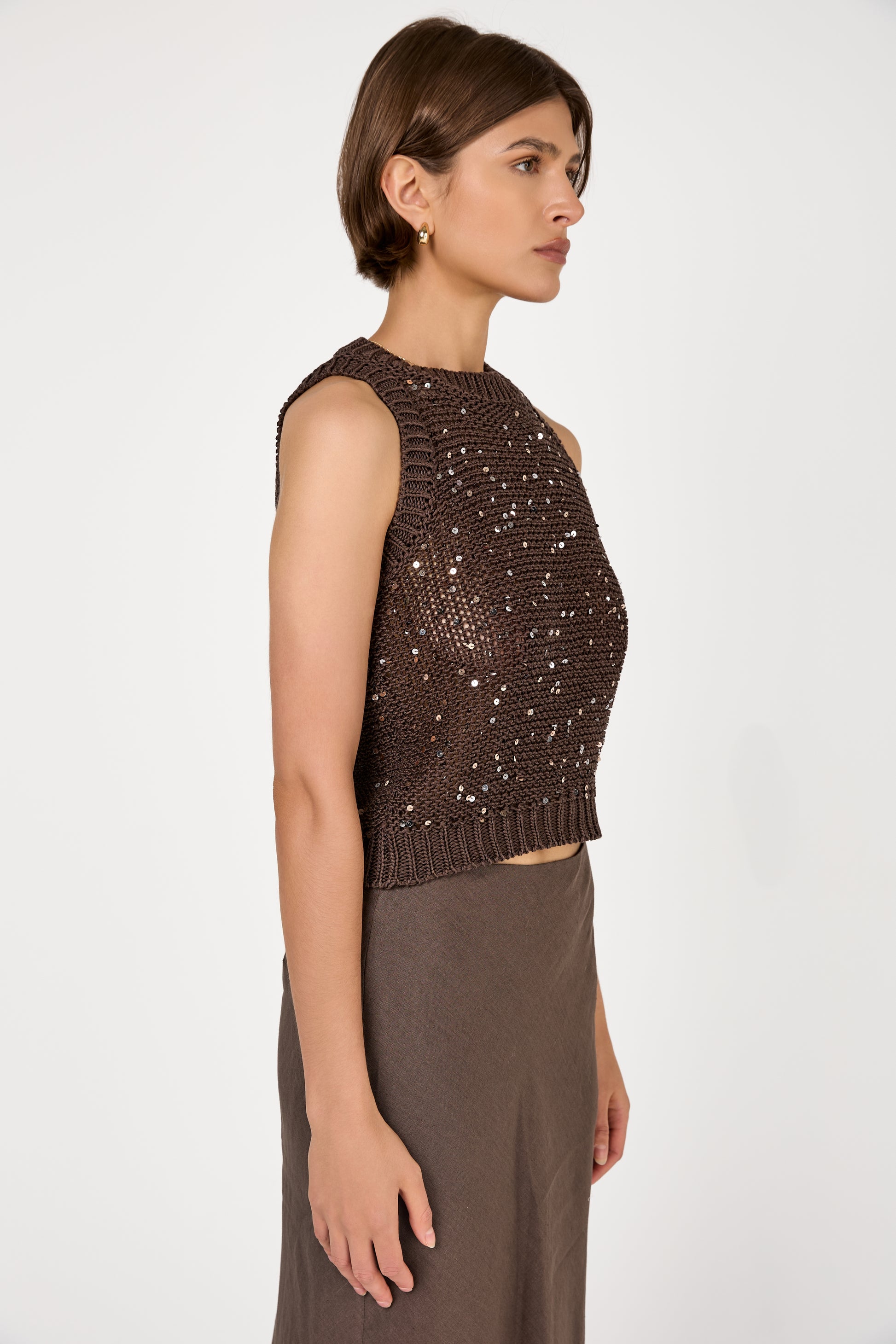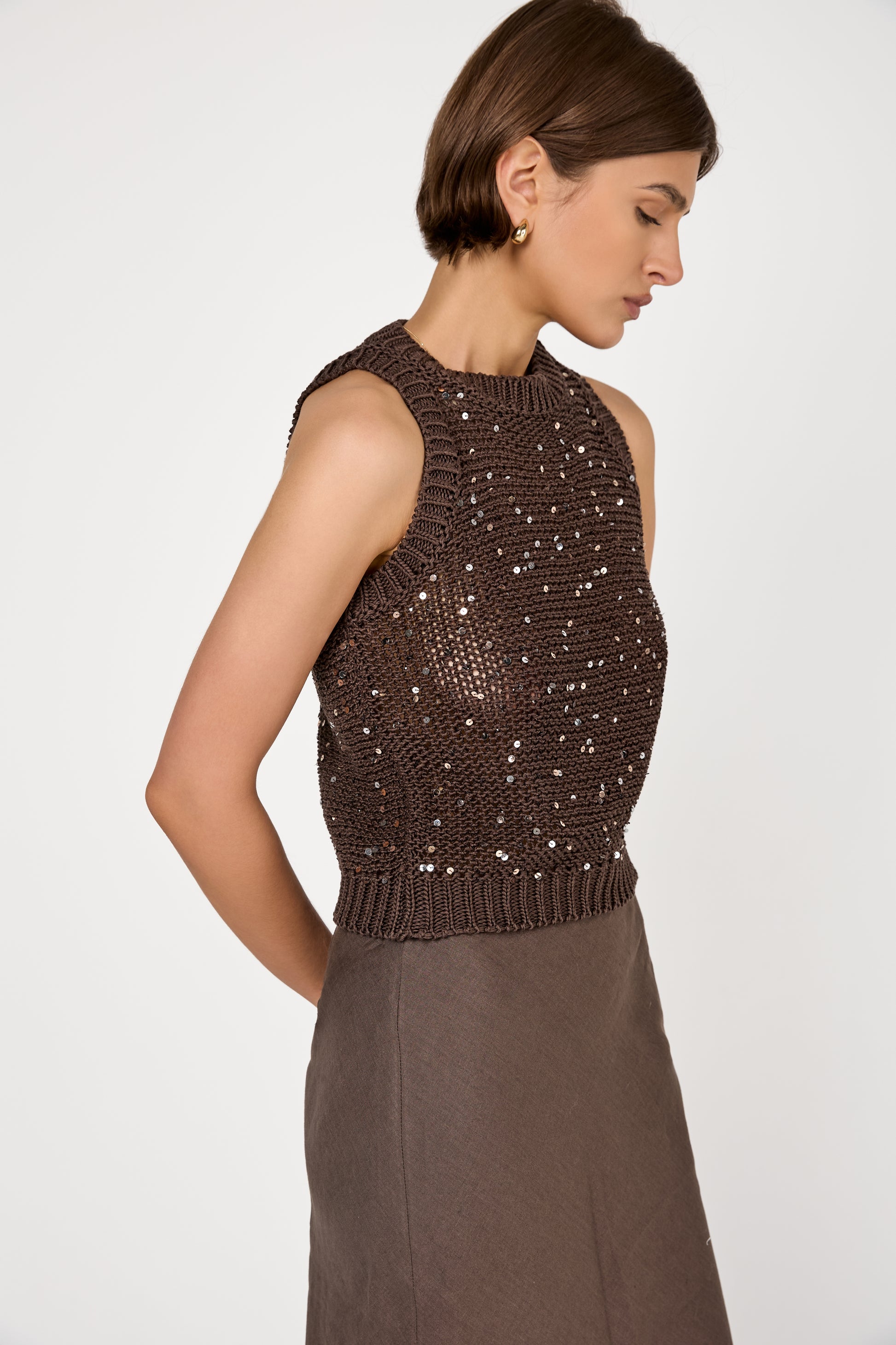 The PESERICO Cotton Knitted Top in Ebony, crafted in Italy from 100% premium cotton yarn, features a delicate stocking stitch knit, creating a soft, flowing texture. Designed with a cropped silhouette, this piece flatters the figure with a contemporary edge, while the cotton ribbon adorned with maxi sequins captures the light from every angle.Ā