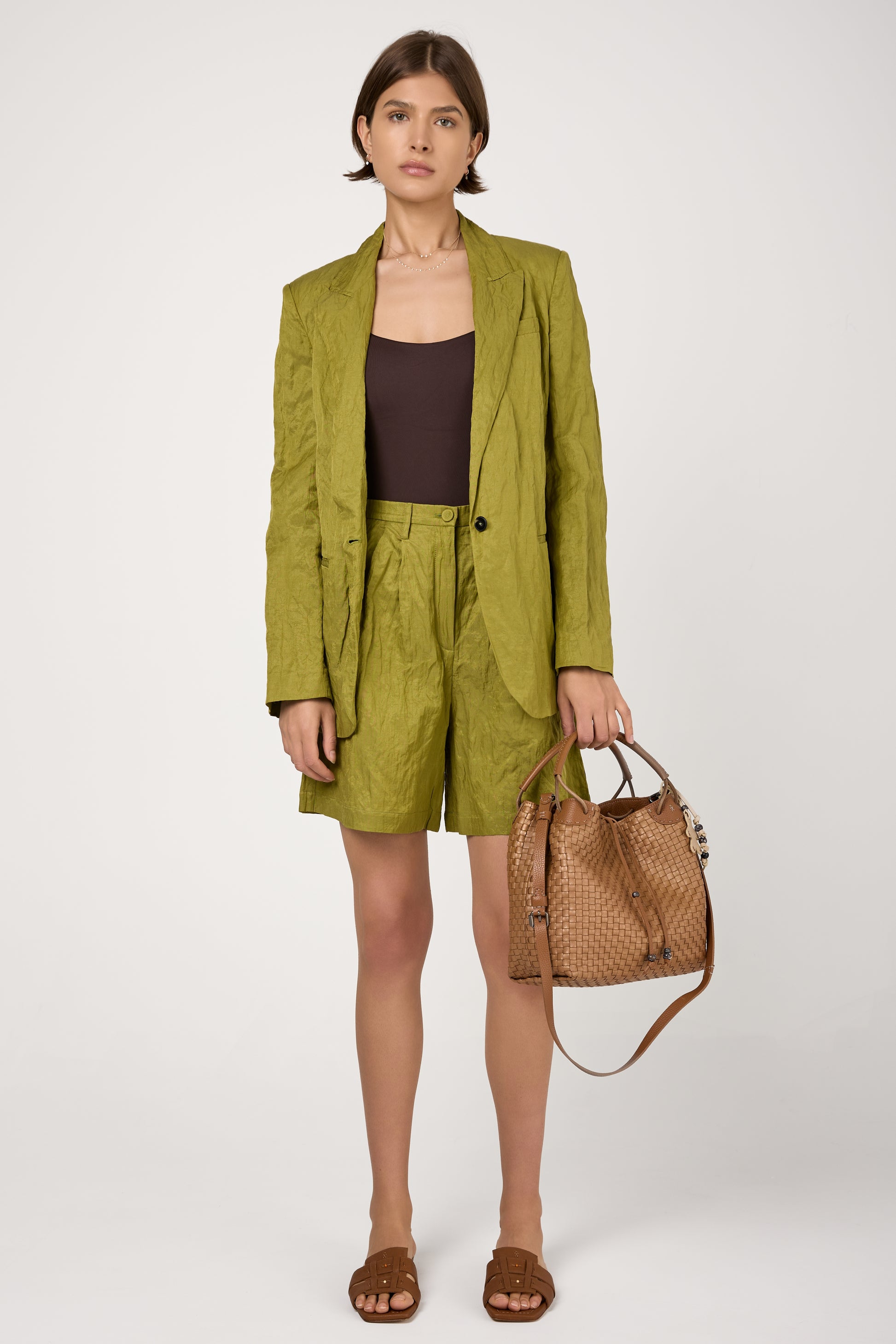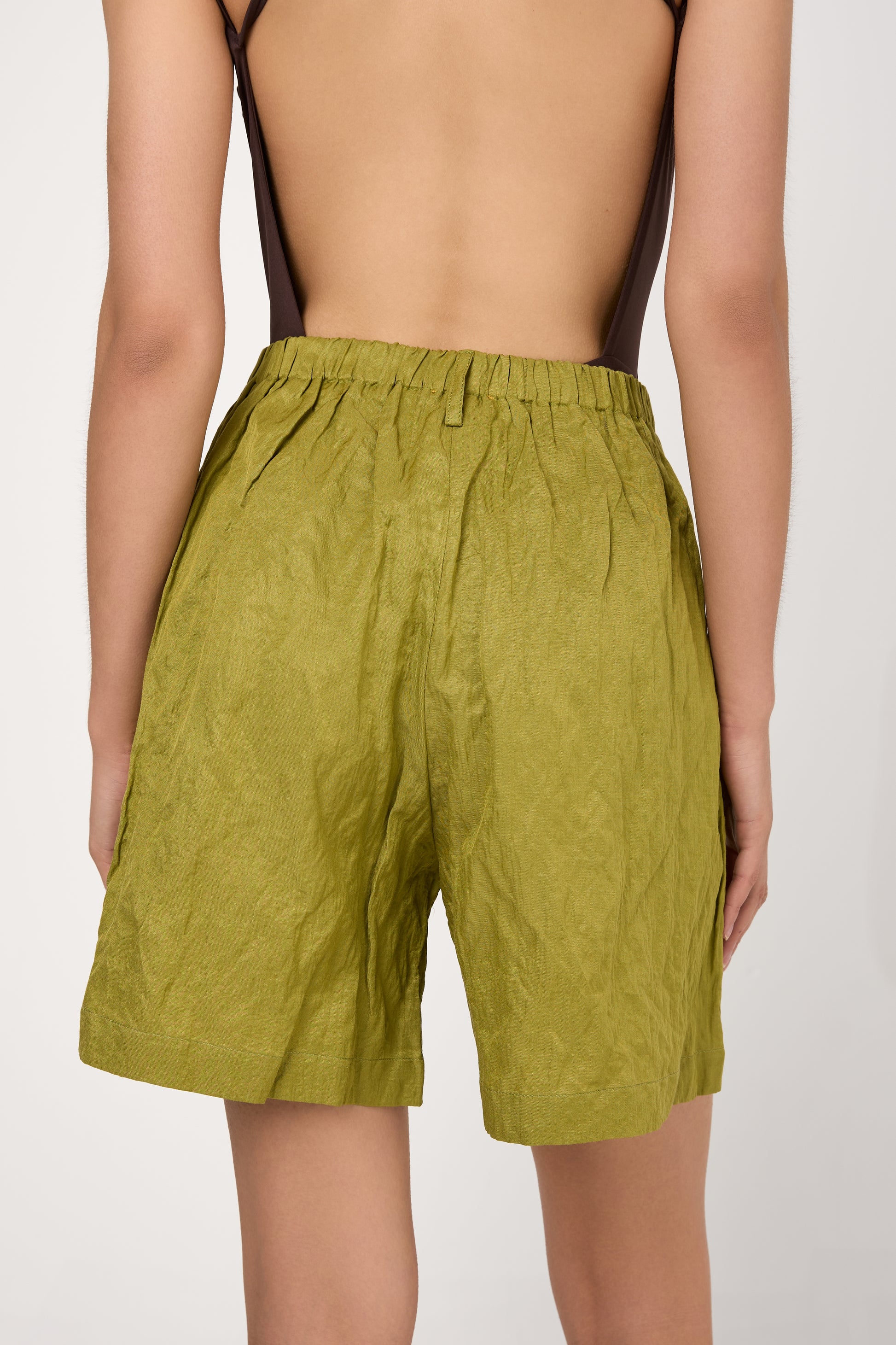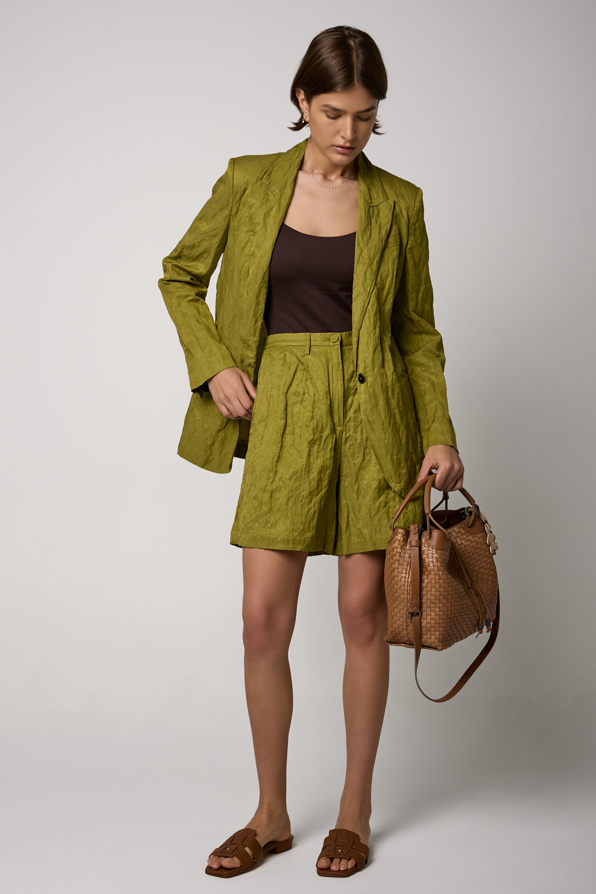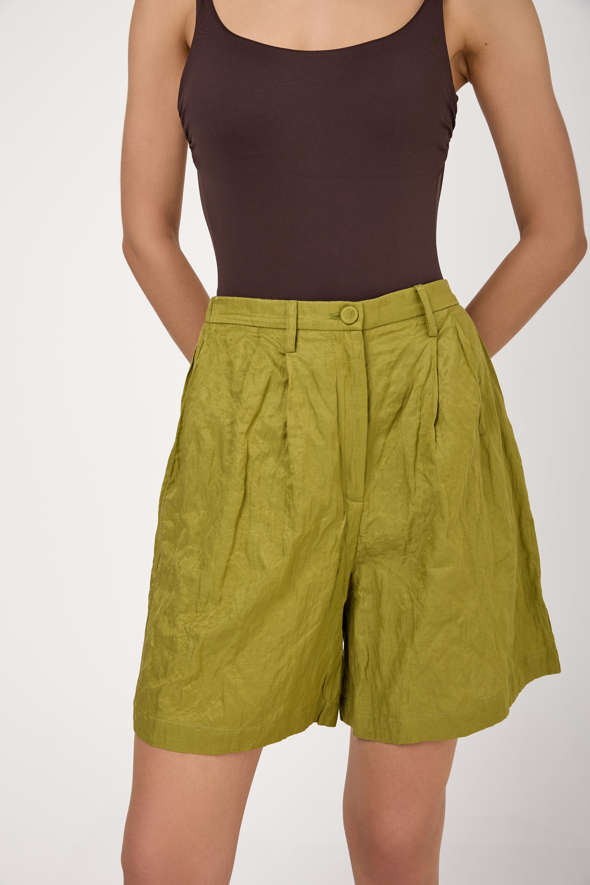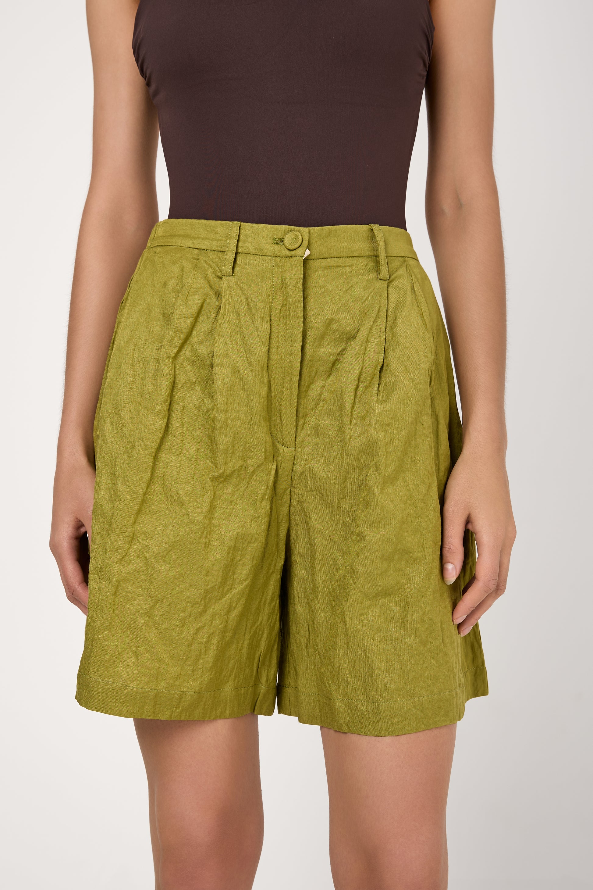 The FORTE FORTE Crinkled Cotton Bermuda Shorts in Aloe are designed with subtle pleats and a relaxed fit. These soft cotton shorts feature a button and zip closure, and neatly cuffed hems. The crinkled texture adds depth and charm, making them perfect for both casual and refined summer looks.