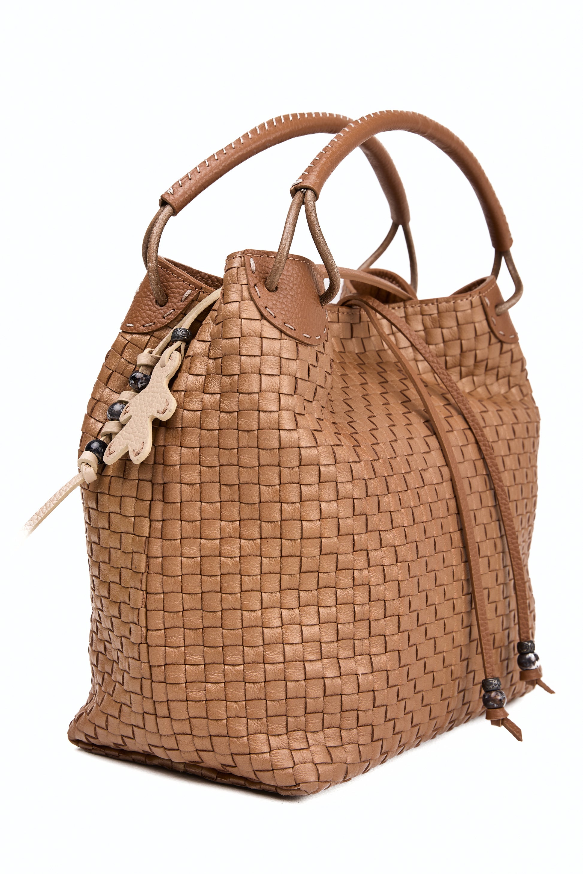HENRY BEGUELIN Daria Woven Intreccio Leather Bag in Dama Lamination Caramel. Tote bag design in calfskin leather. Featuring a pearly laminated finish.