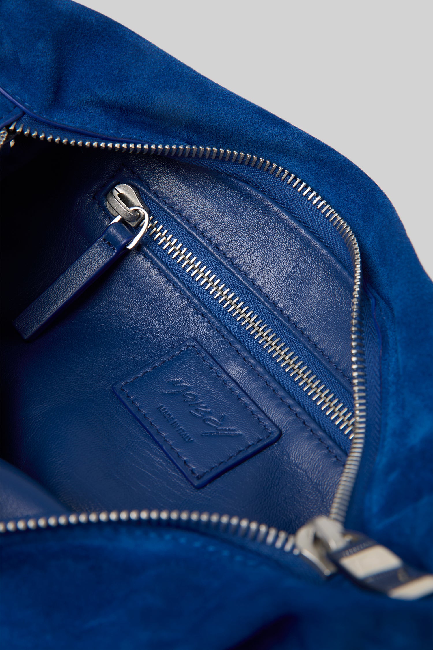 The MARSÈLL Dipi Reversed Leather Clutch Bag in Electric Blue features an elegant hourglass silhouette with a concealed zipper closure and an interior zip pocket. Designed with a short removable shoulder strap for versatile wear, it is expertly crafted in Italy and finished with handcrafted silver hardware, reflecting Marsèll's signature artisanal sophistication.