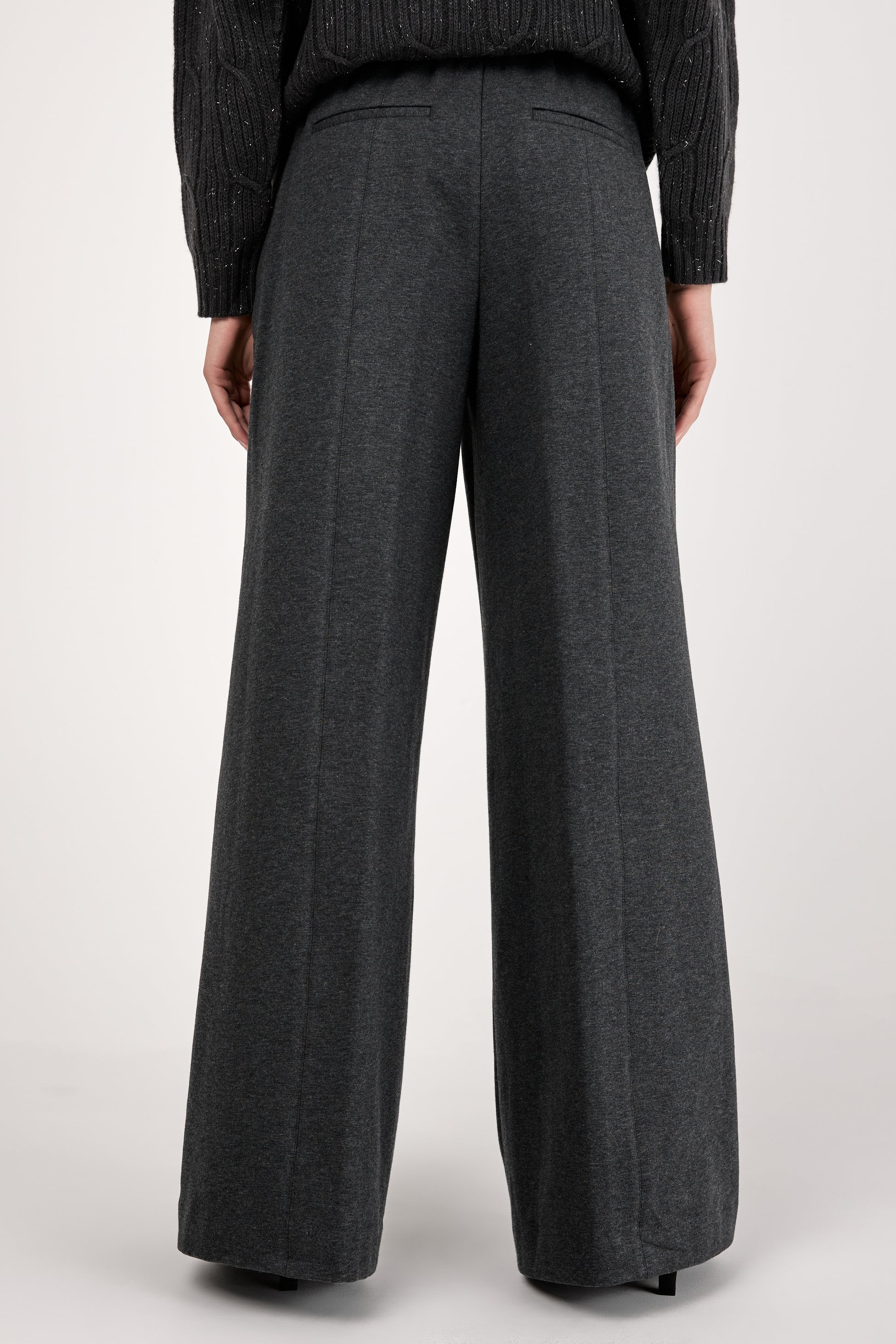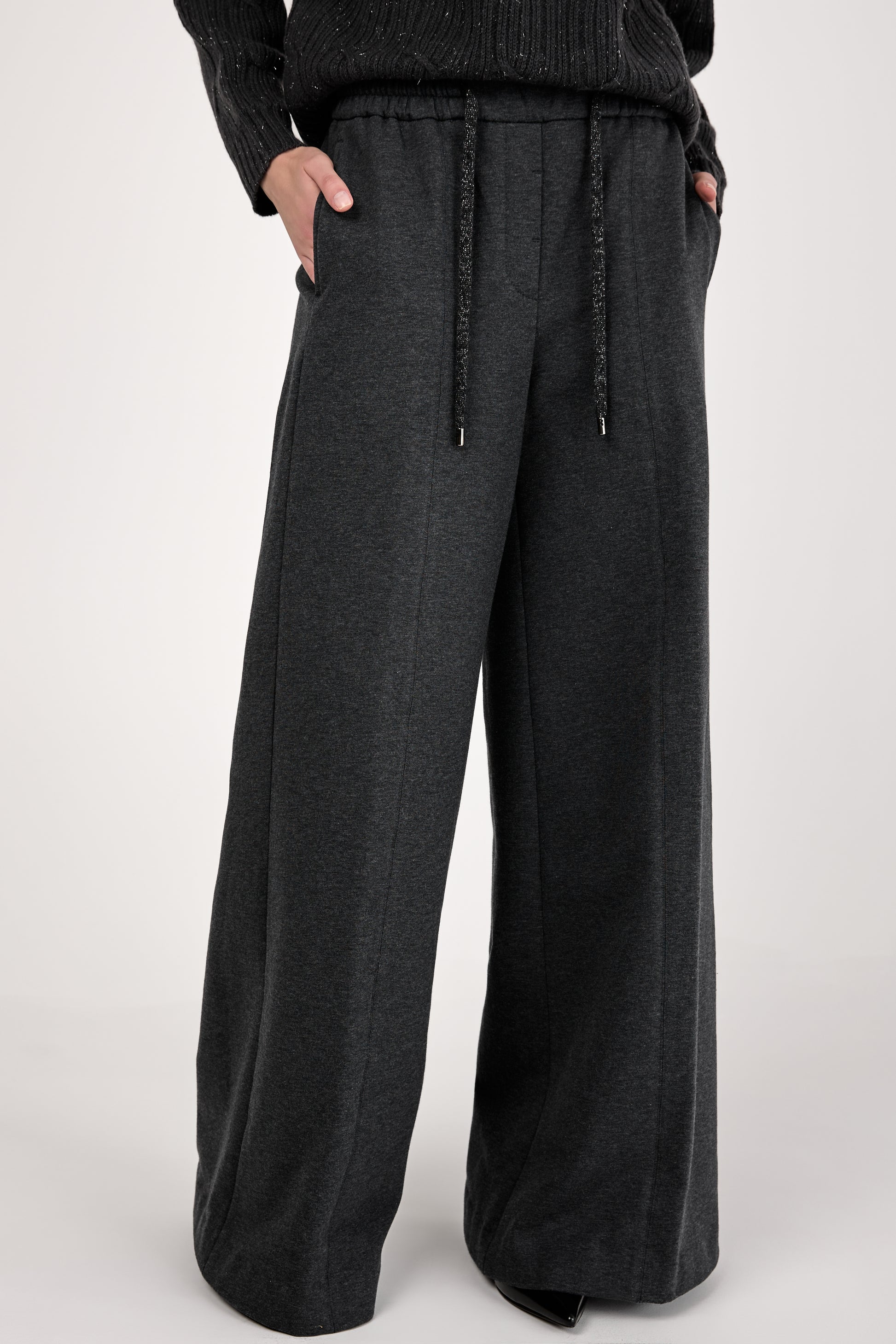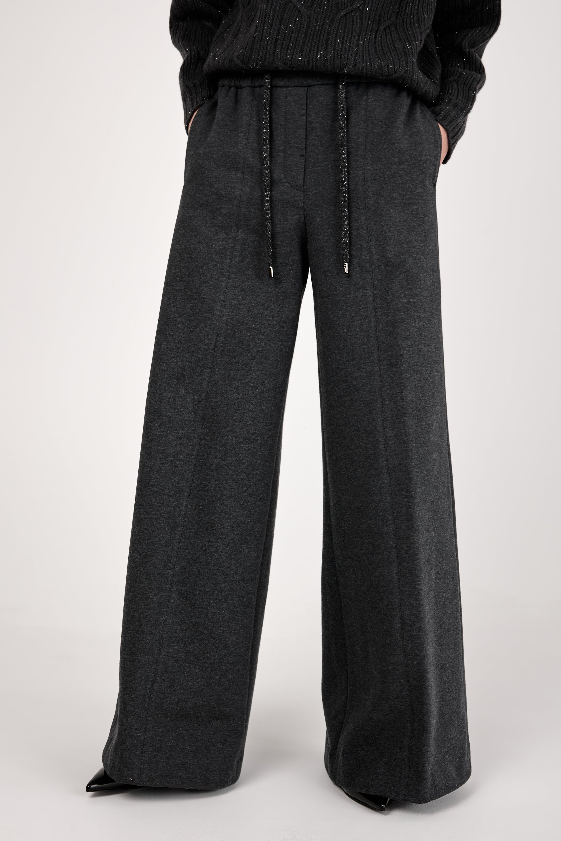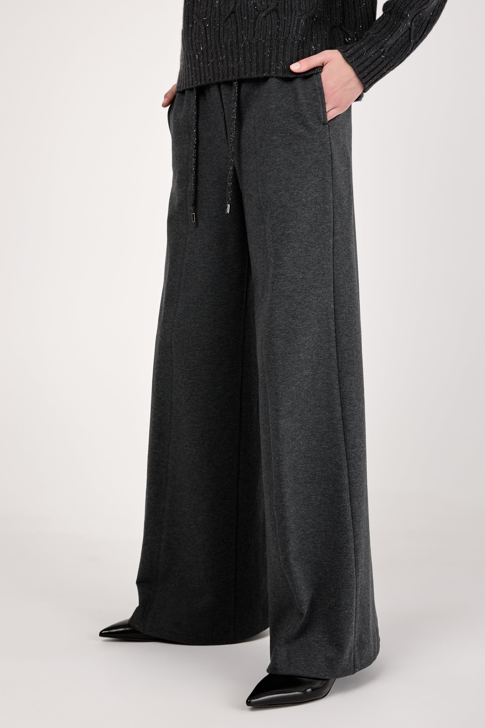 The PESERICO Emery Cotton Stretch Pant in Graphite redefines comfort with a luxurious edge. Made in Italy from soft cotton stretch fleece, these high-waisted trousers feature a wide-leg silhouette and an adjustable drawstring waistband.Ā