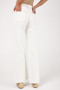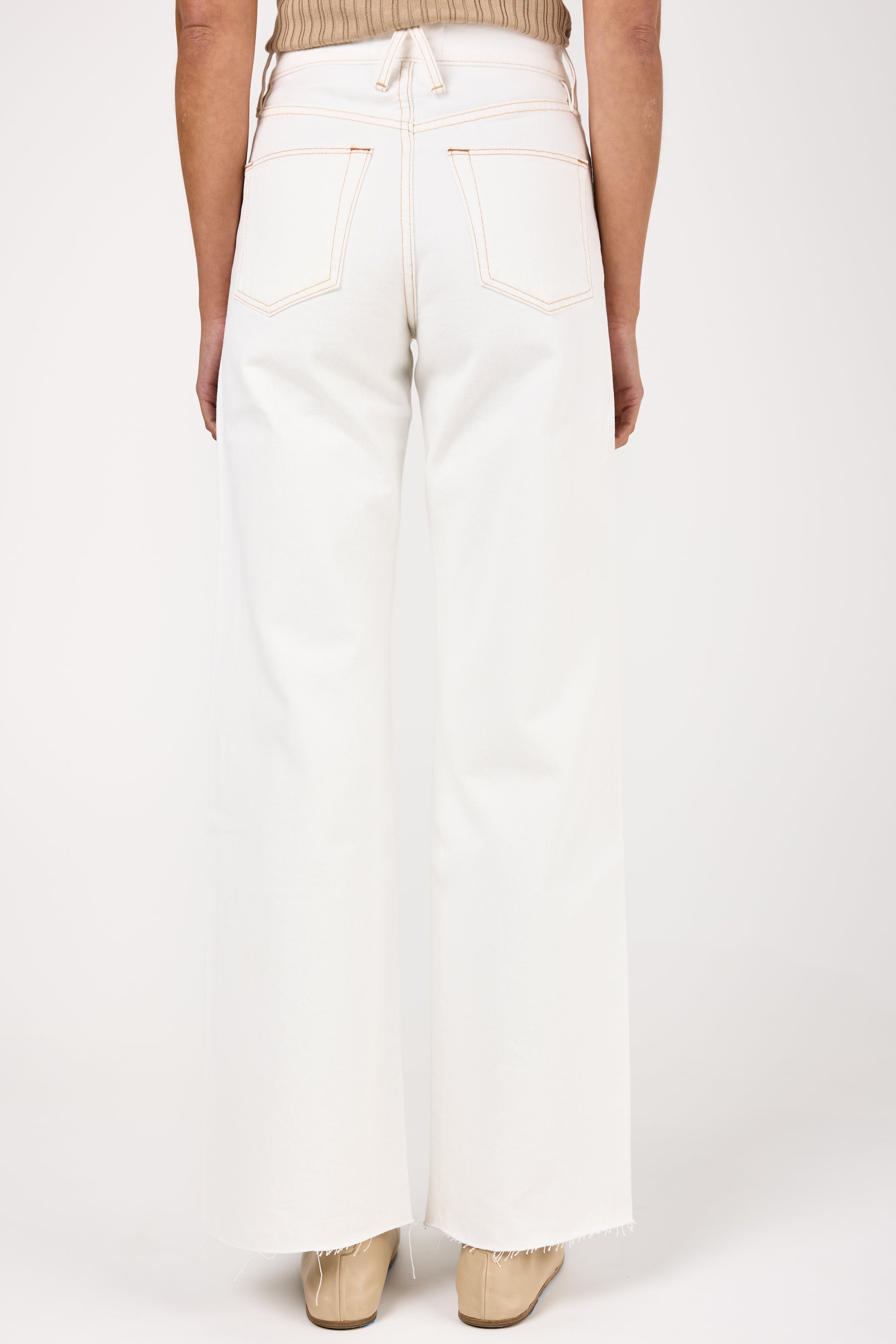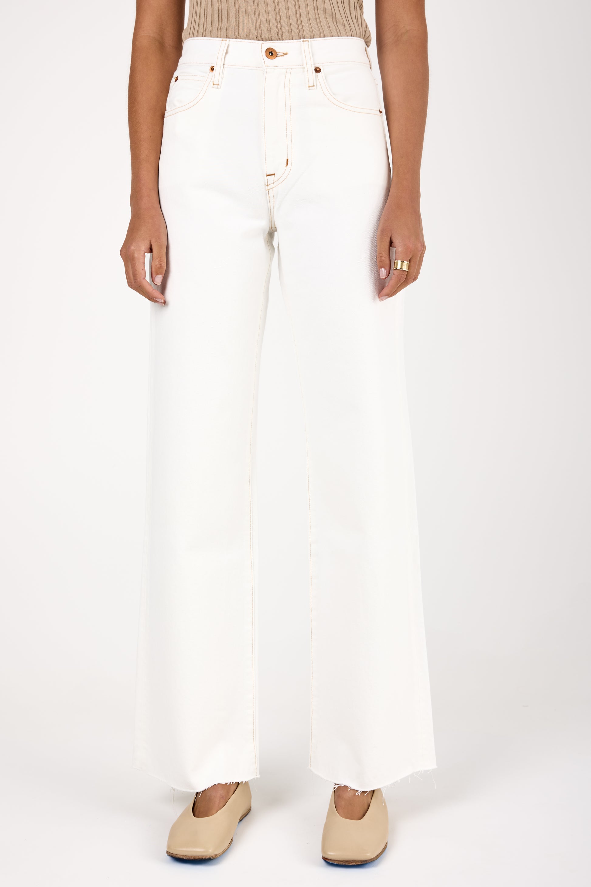 SLVRLAKE Grace Jean in Natural White. Cut from mid-weight, structured white denim with contrast stitching. Featuring a wide leg silhouette with a retro high-rise design and subtly distressed hems for a lived-in feel and contemporary style.