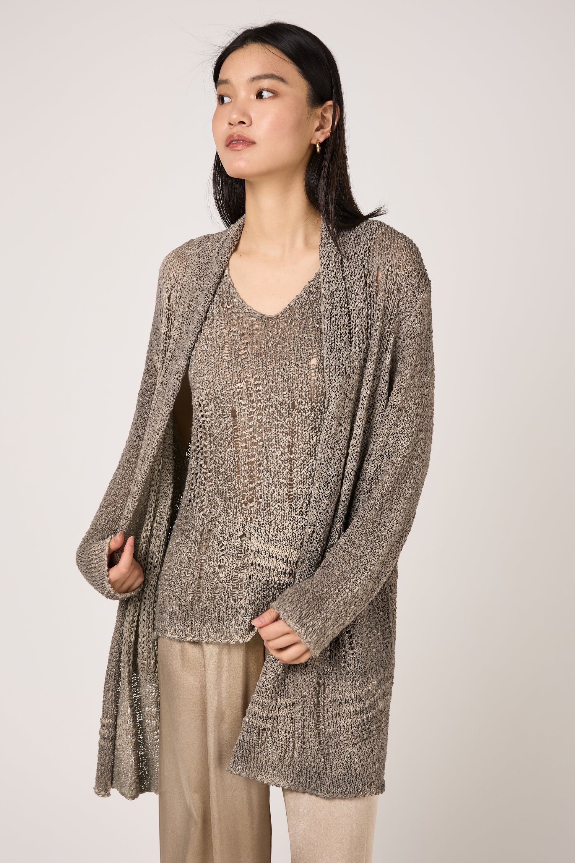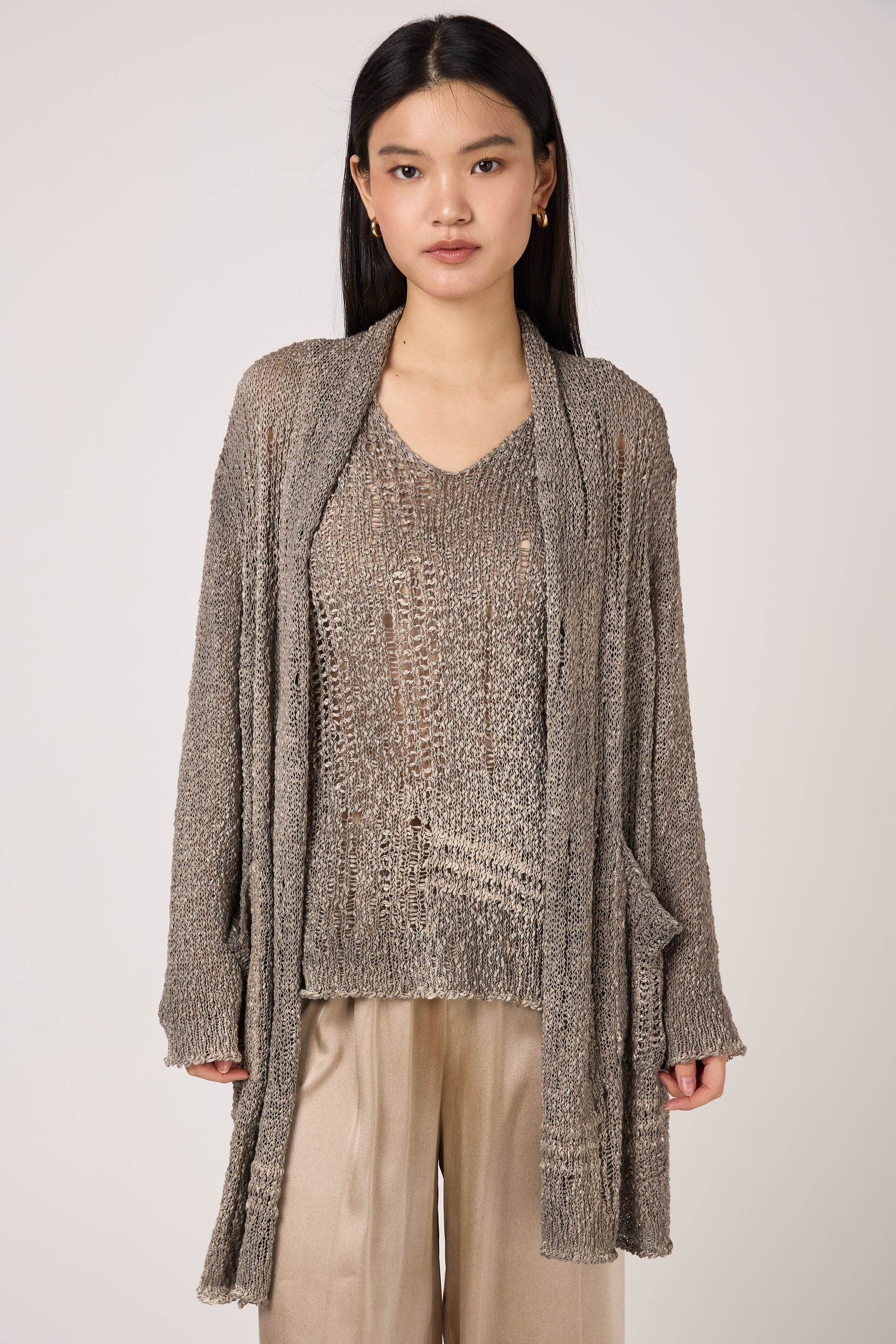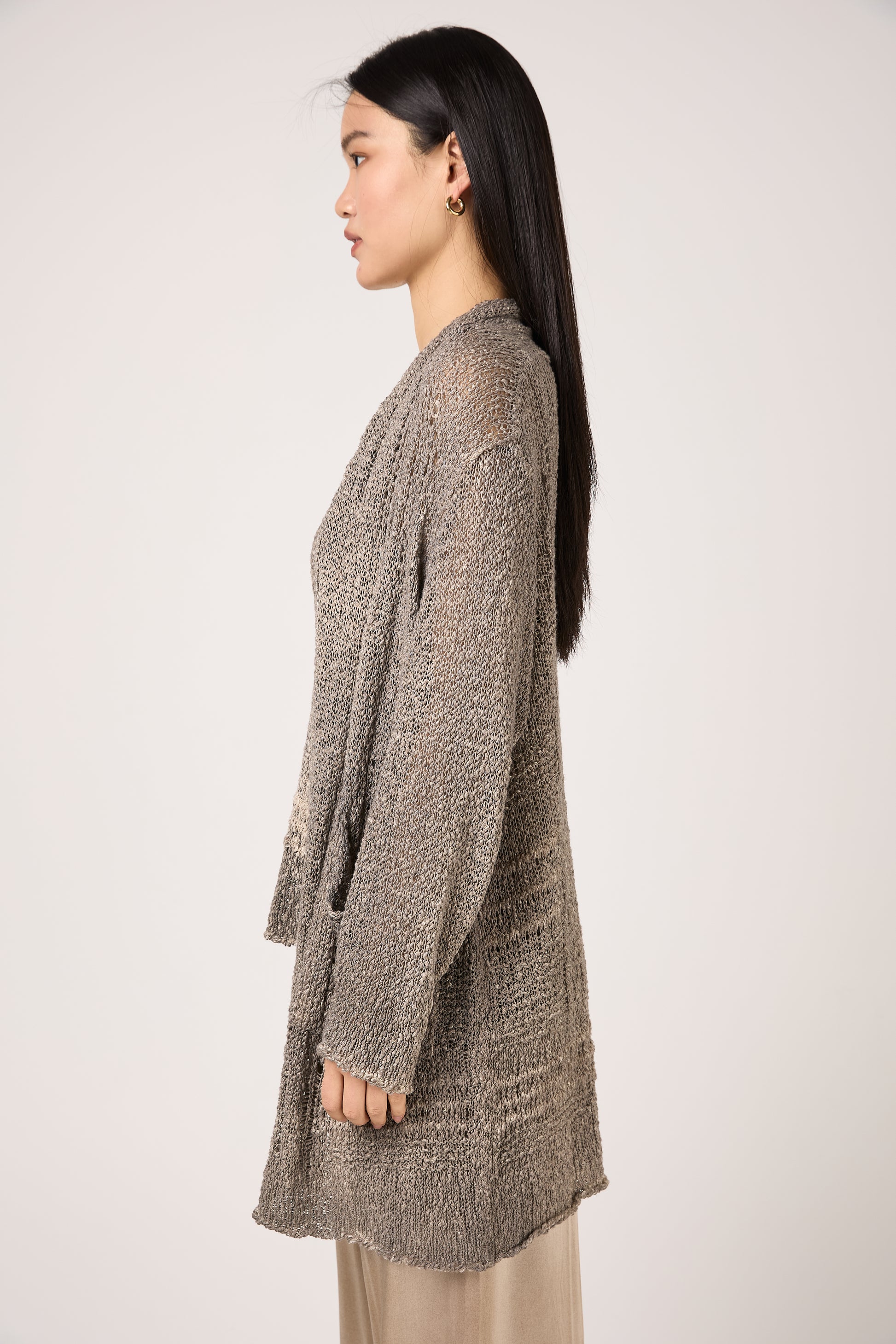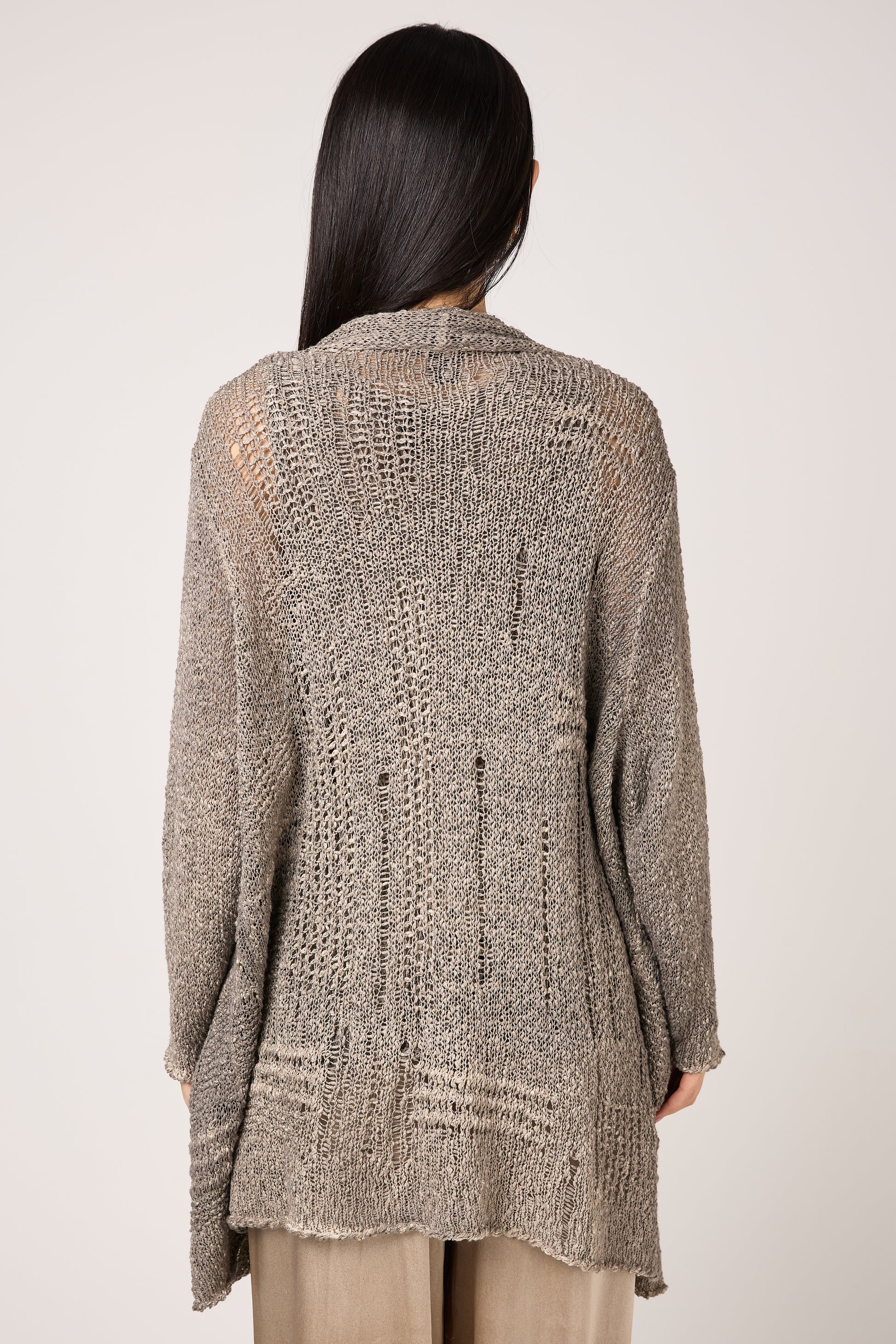 Hand Painted Openwork Knit Shawled Cardigan in Fango