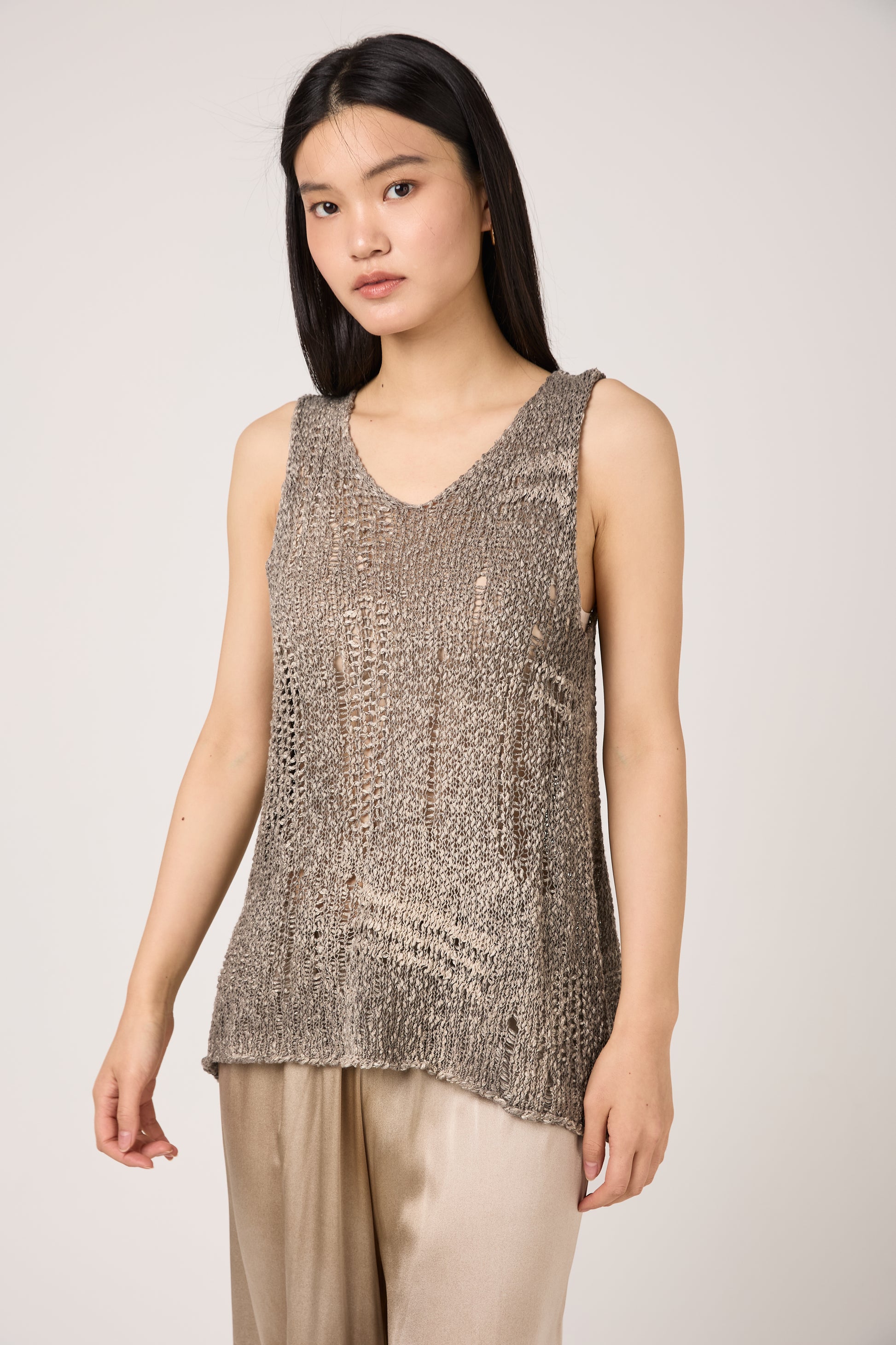 The AVANT TOI Hand Painted Openwork Knit Tank Top in Fango features a striking, perforated weave that creates a unique, textured transparency. Expertly crafted in Italy, this round-neck silhouette is defined by its artisanal distressed details and airy construction. The hand-painted Fango earth tones add organic depth to the fibers, ensuring each piece is a one-of-a-kind work of art.