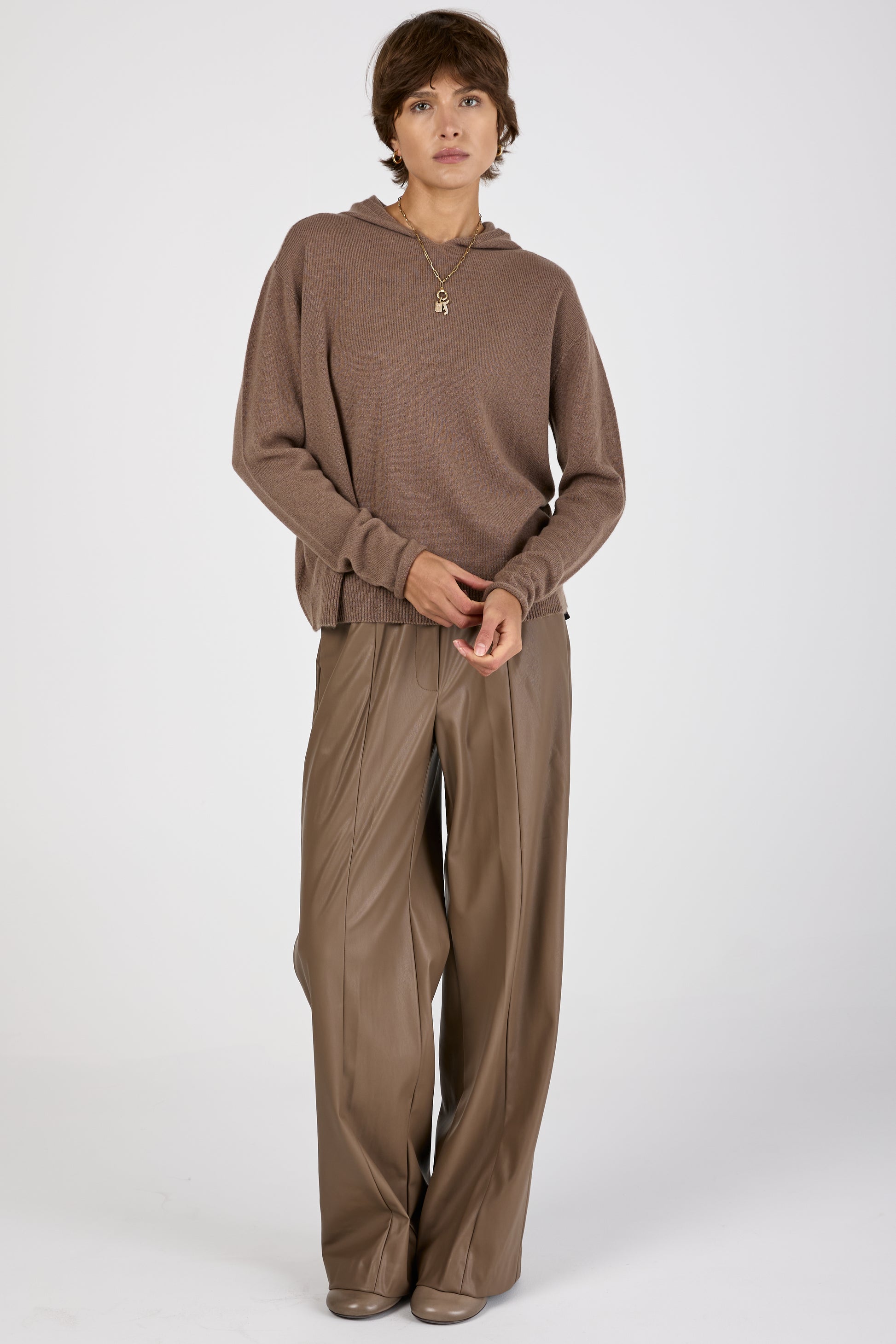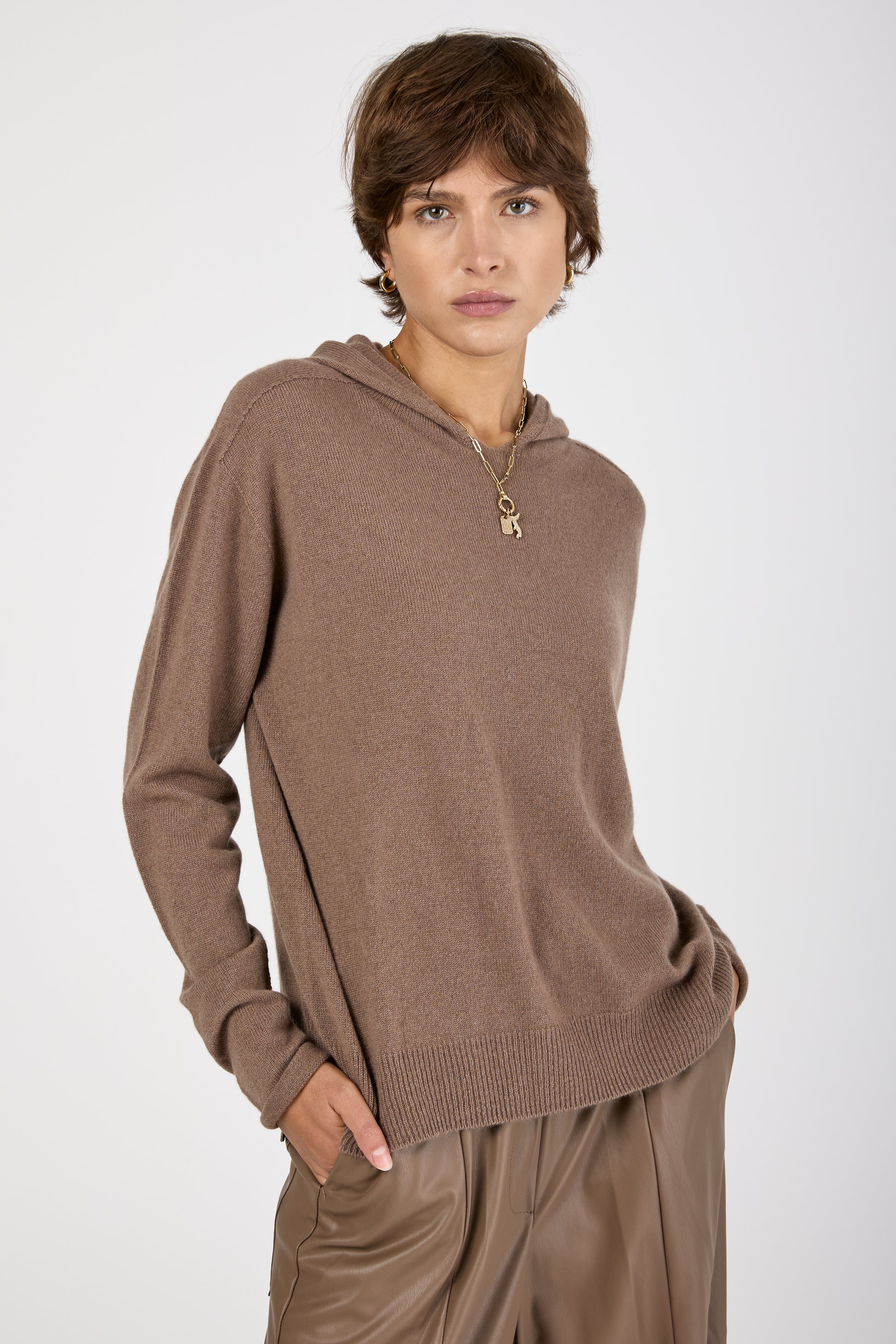 (NUDE) Hooded Cashmere Sweater in Mink. Oversized 100% cashmere hooded sweater with an attached pocket on the top left side. Made in Italy.