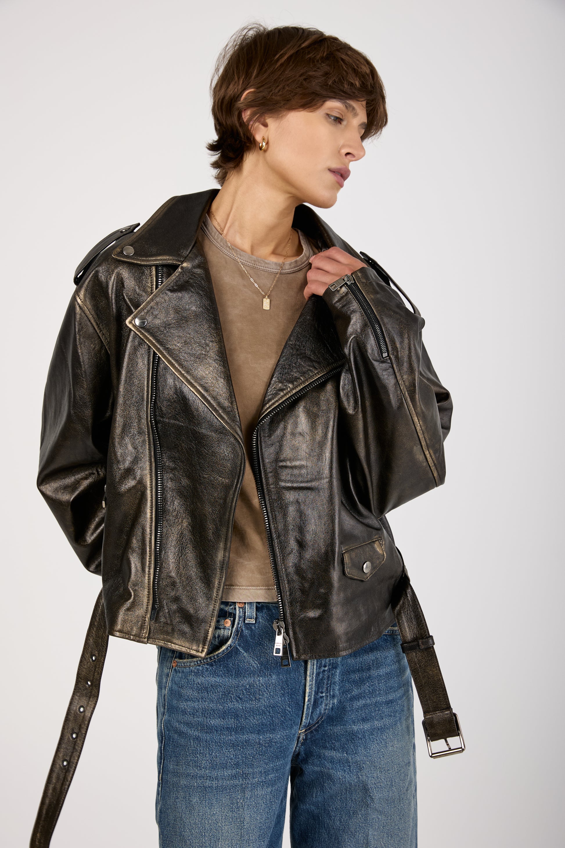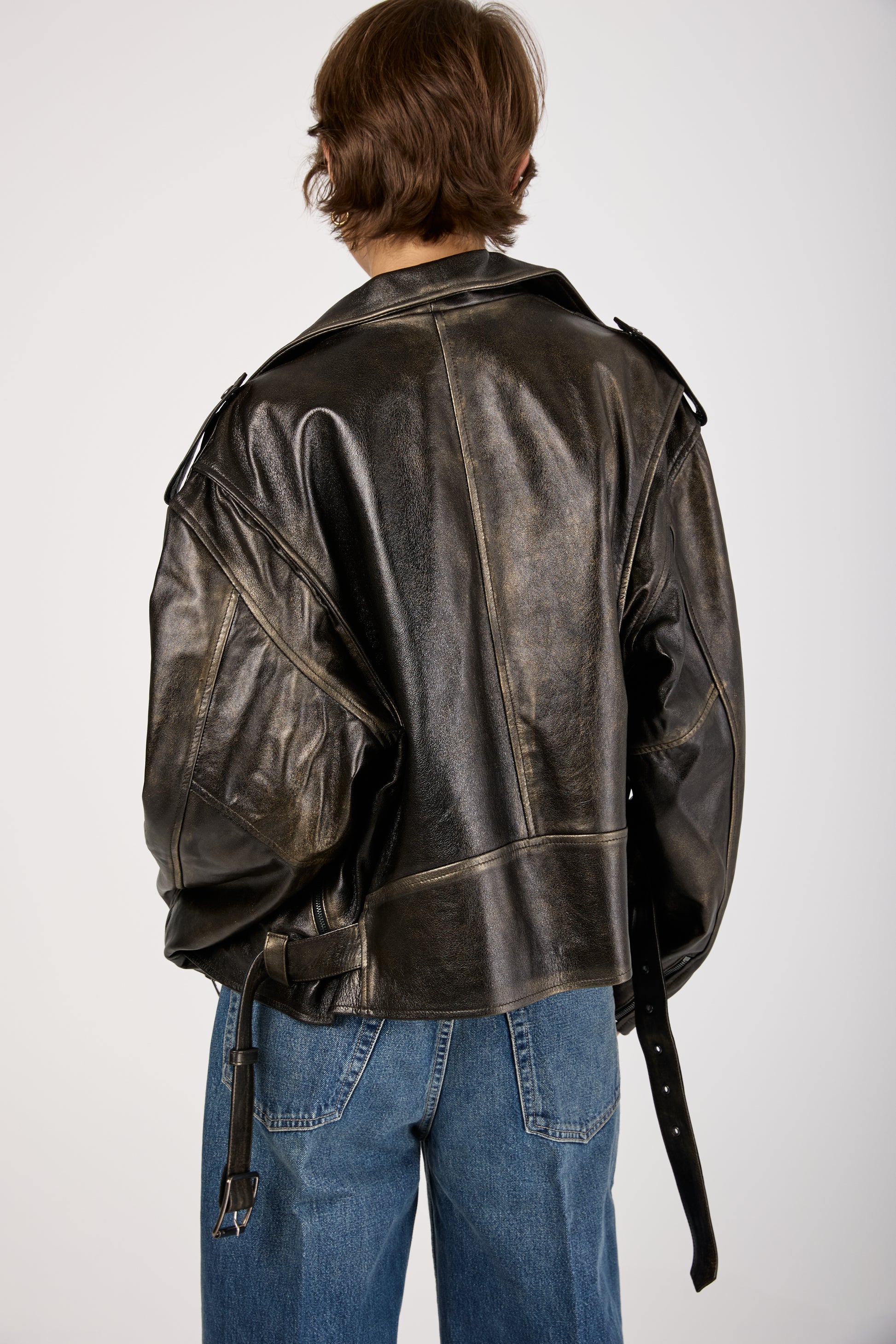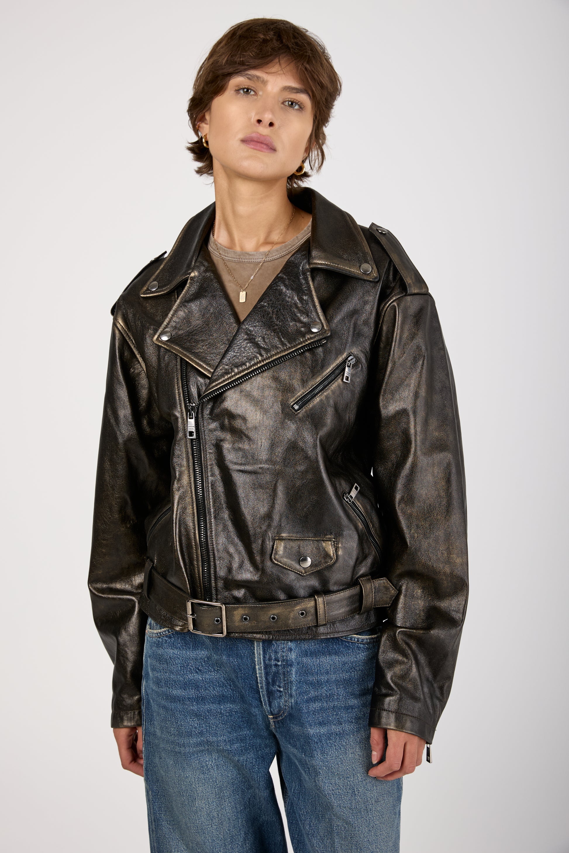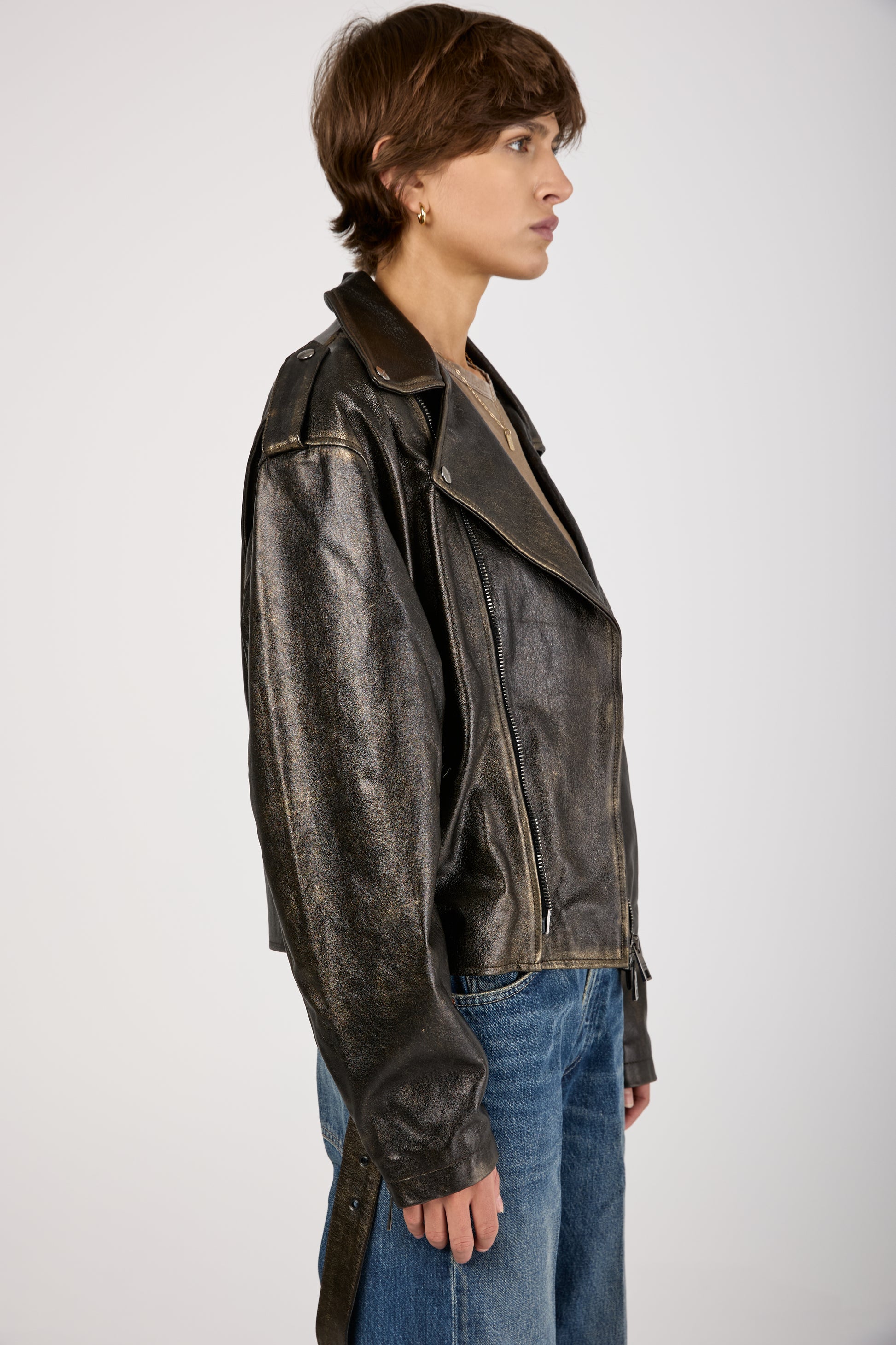 The GIORGIO BRATO Lamb Leather Jacket in Black with Gold Lamination is a bold statement piece. Crafted in Italy from 100% lamb leather, this oversized jacket features a sleek black base with shimmering gold accents.