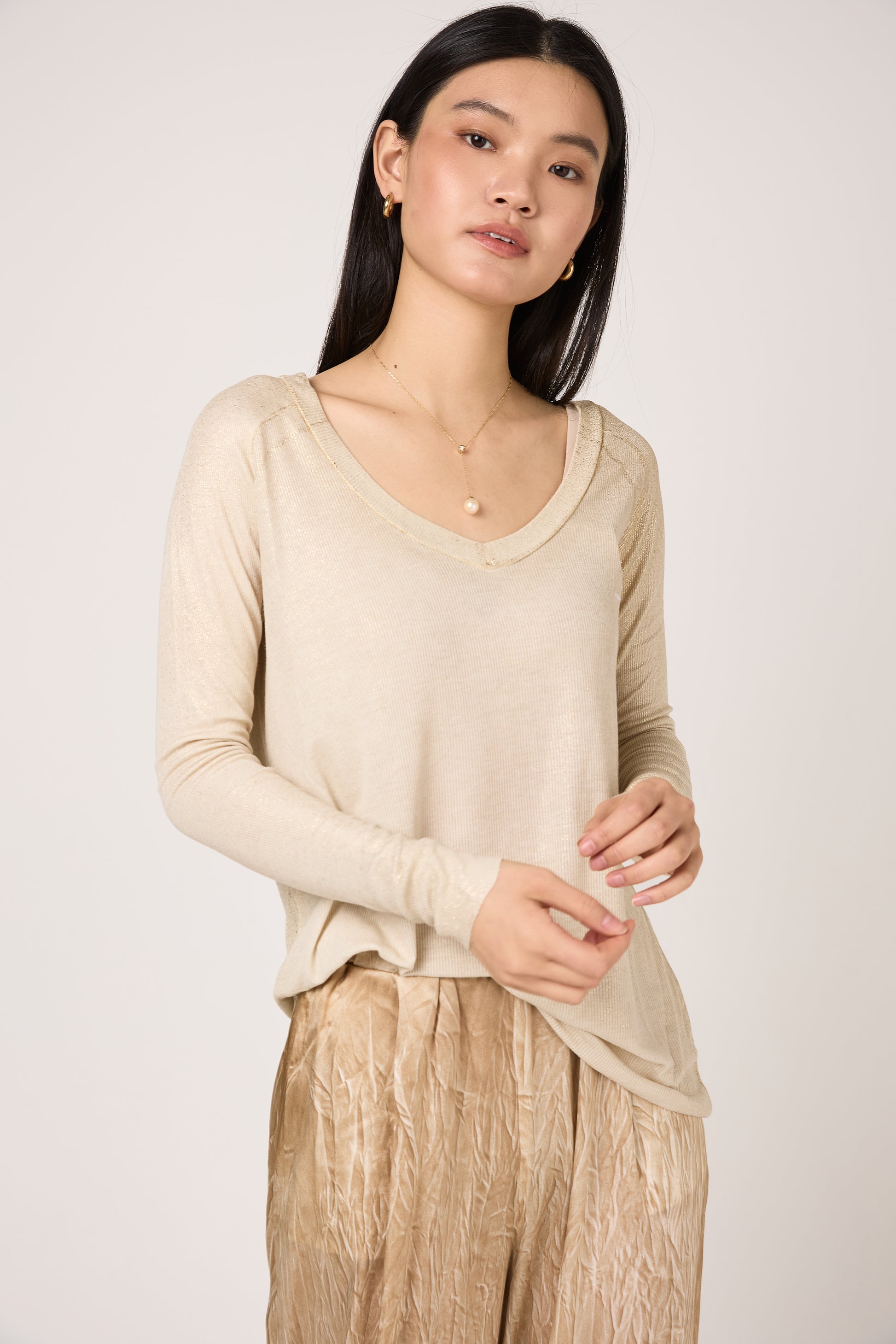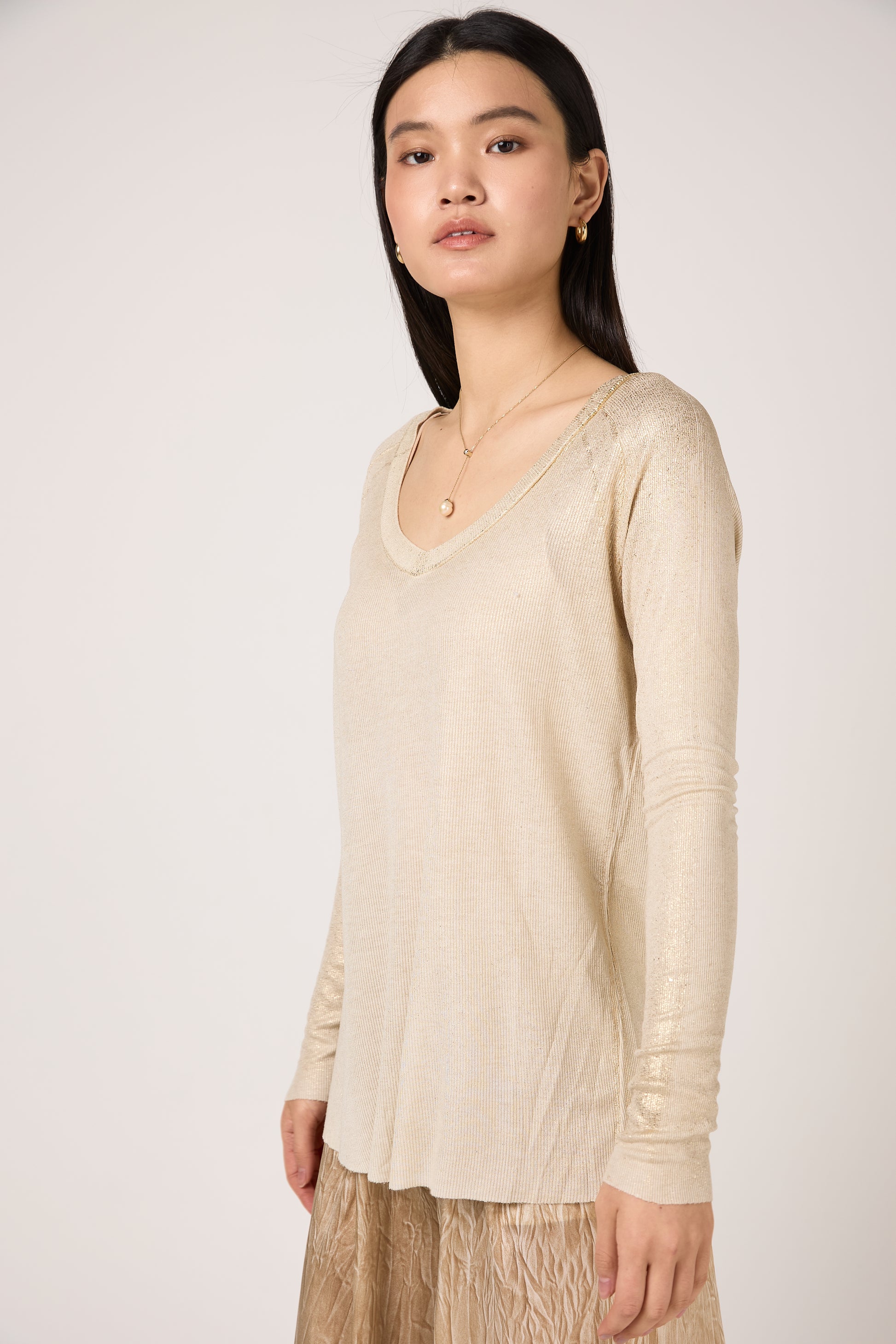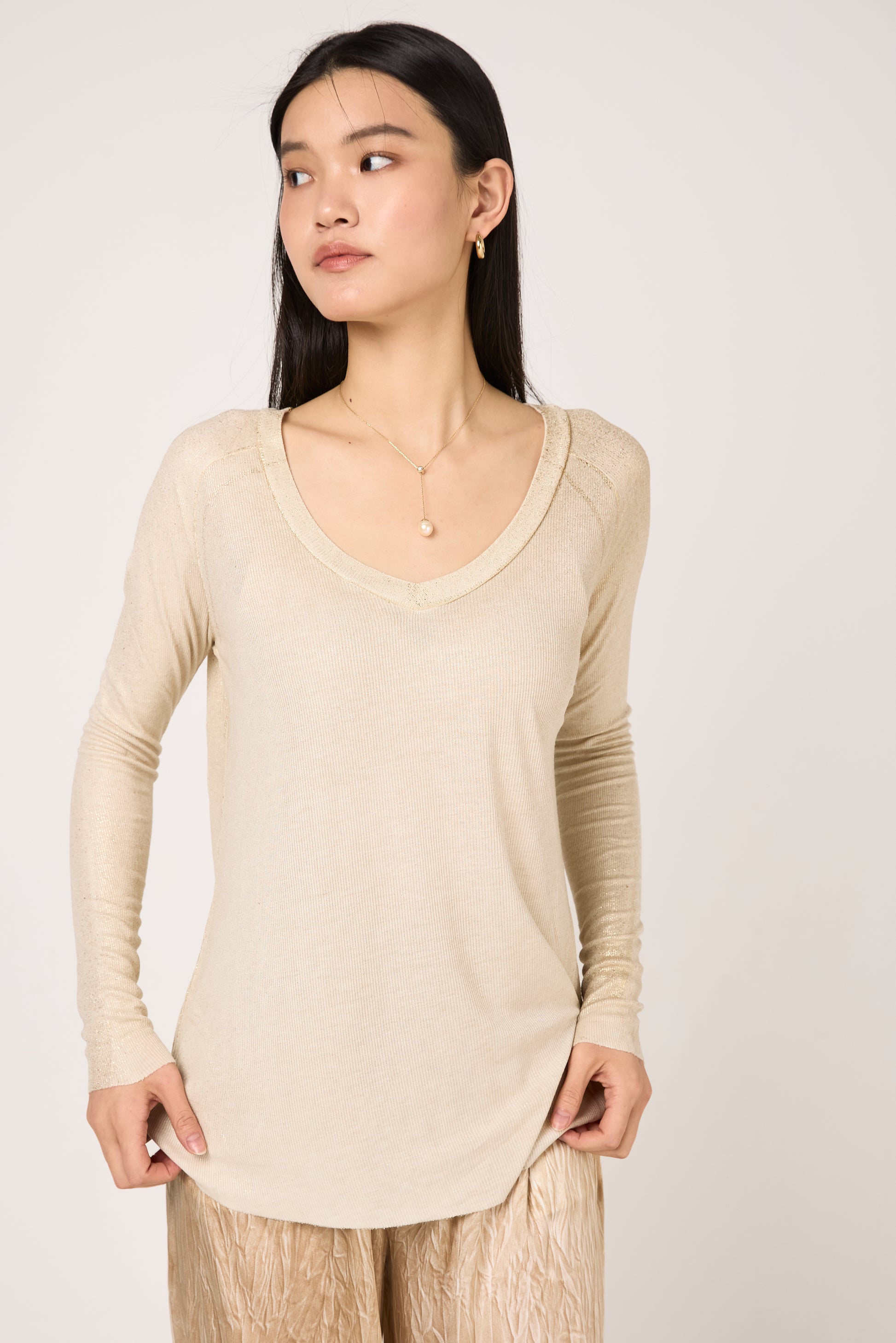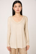 The AVANT TOI Laminated Ribbed Long Sleeves T-Shirt in Vaniglia is a modern essential, expertly crafted in Italy from a fine ribbed knit. This V-neck silhouette features a unique microlamina finish, adding a subtle metallic shimmer that catches the light with every movement. The hand-painted Vaniglia tones blend seamlessly with the lamination. With its slim fit and refined ribbed texture, this long-sleeve t-shirt is a luxurious upgrade to a classic wardrobe staple.Ā