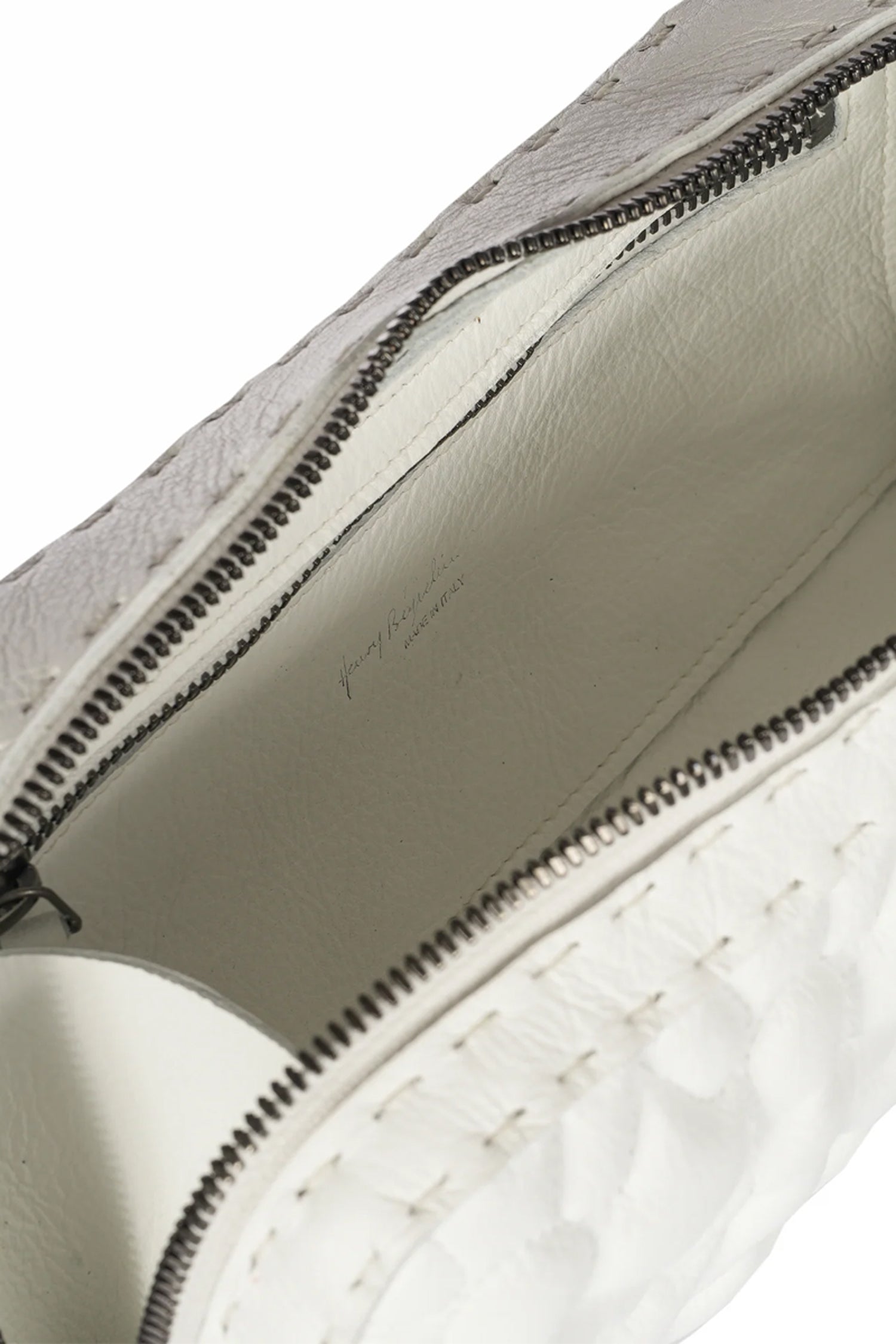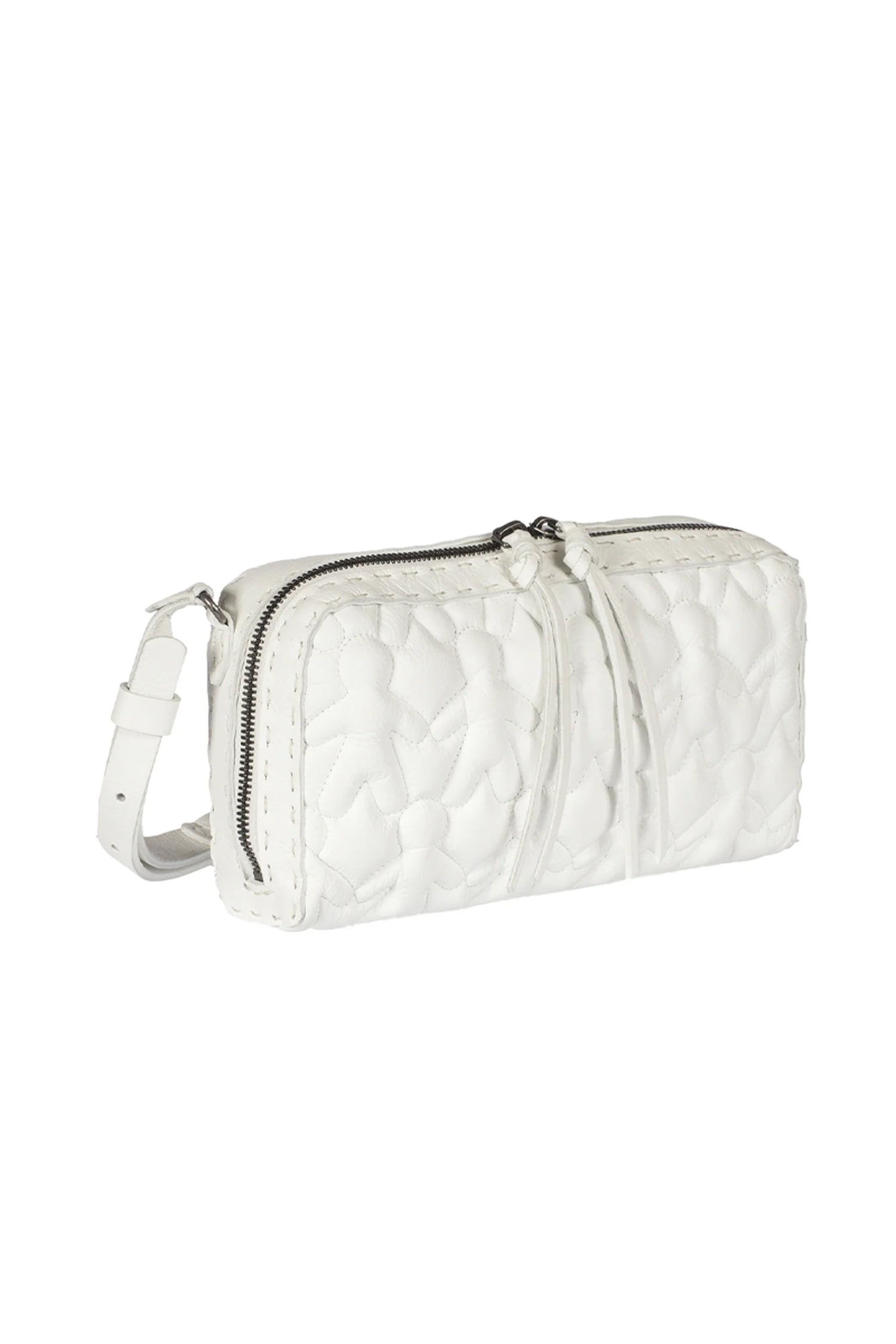 HENRY BEGUELIN Leather Box Bag in Bovino Onimo Trapuntato Gesso. Mini bag in quilted calf leather with adjustable and removable cross-body strap in ivory. Featuring two-way, zip-around closure with leather pulls. Hand-stitching details and logo pattern design.