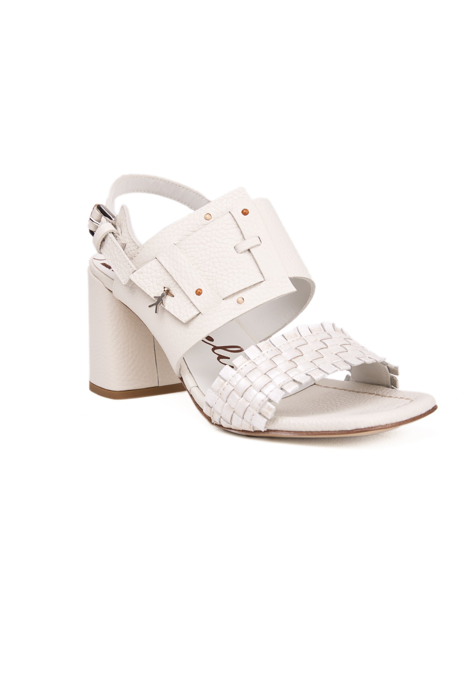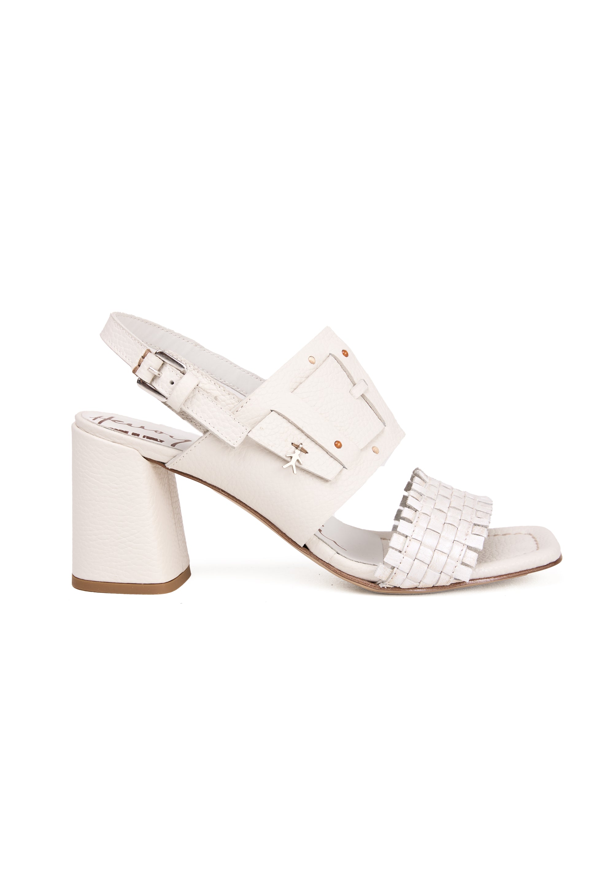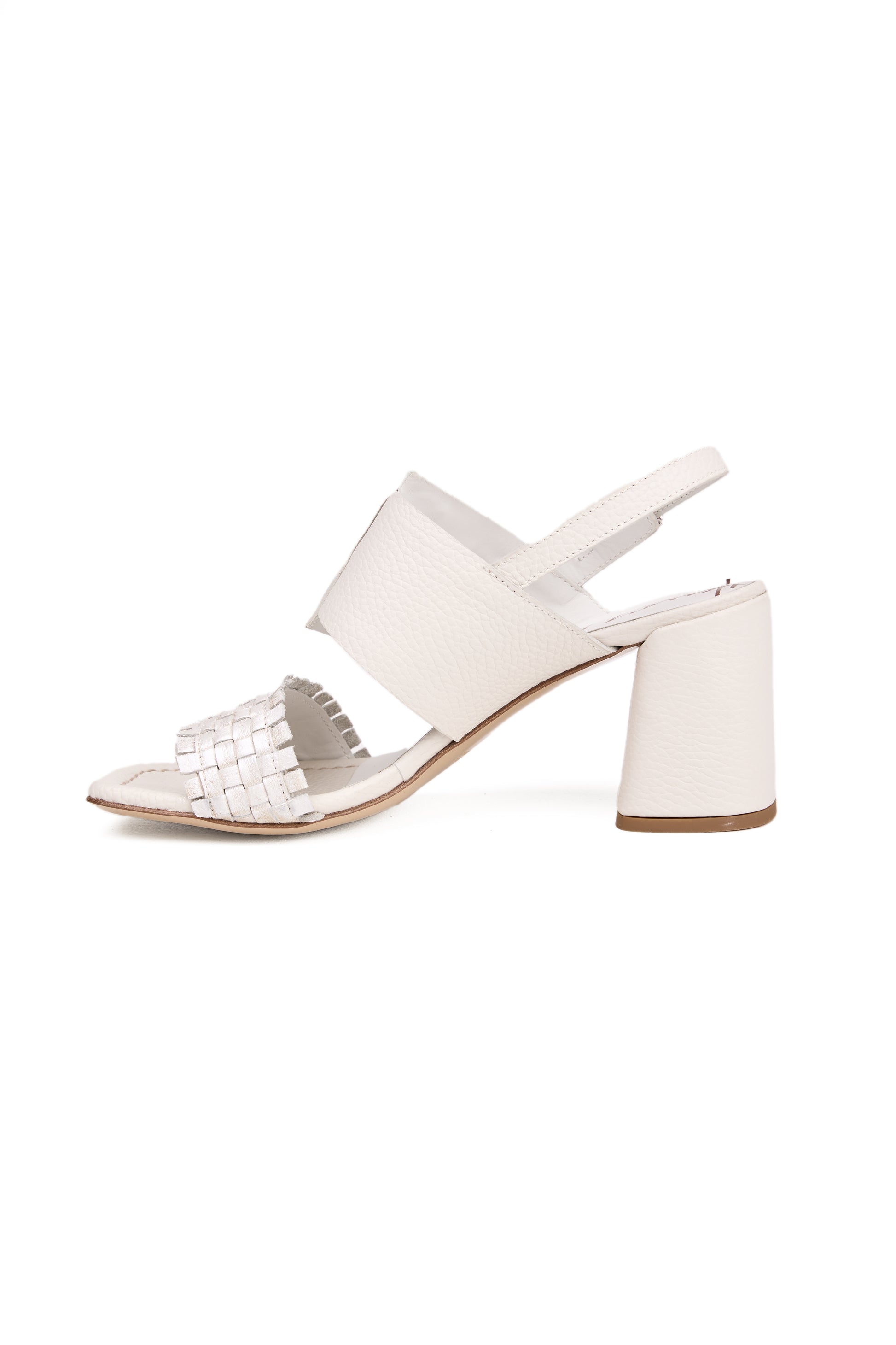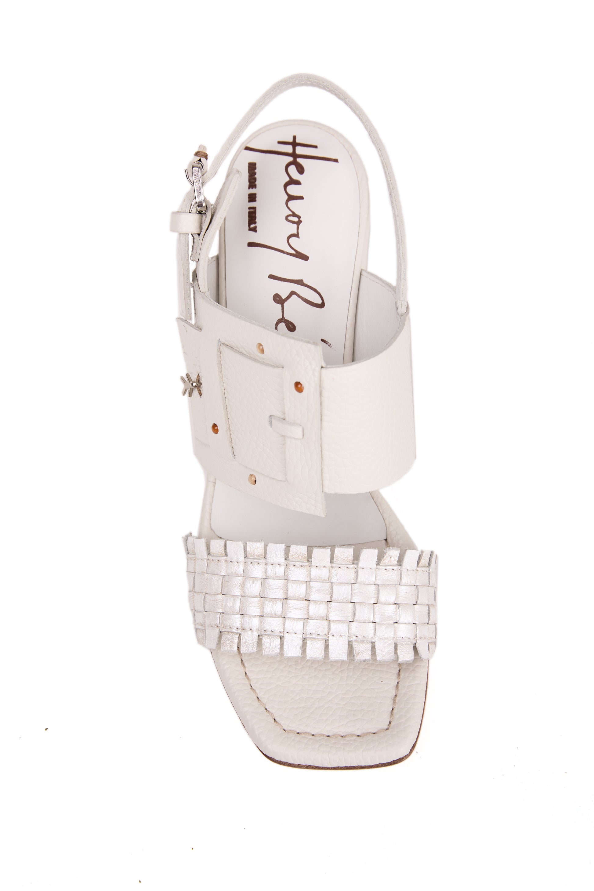 HENRY BEGUELIN Leather Heel Sandal in Gesso Bianco. Classic slingback heeled sandal handcrafted with printed muflon and calfskin leather. Featuring woven and beading details, block heels, and a slightly squared toe. Elevated and versatile look designed for style and comfort.