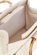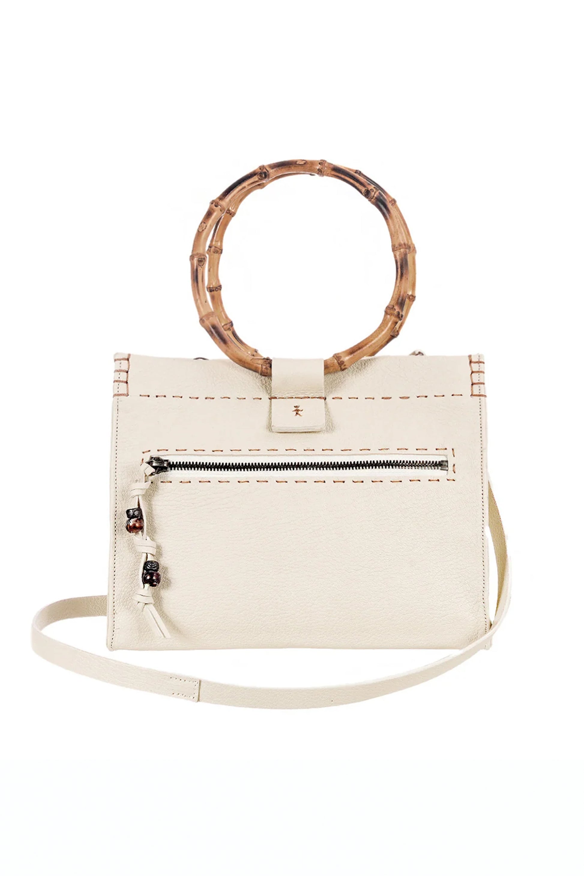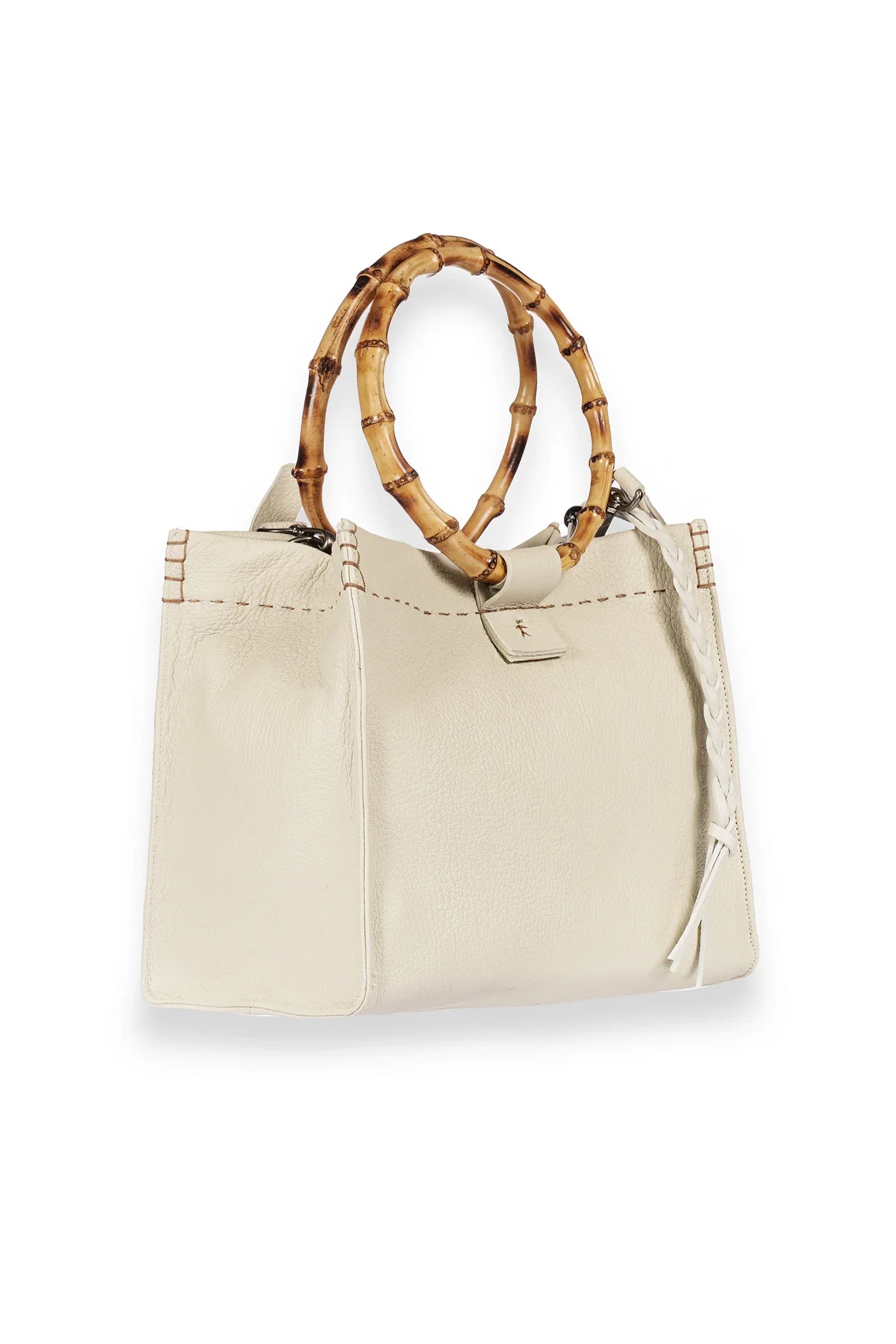 The HENRY BEGUELIN Leather Shopping Bambu Bag in Martellato Gesso features a structured silhouette and hand-stitched detailing. Designed with a distinctive bamboo handle and a detachable shoulder strap for versatile wear. Made in Italy of quality woven calfskin leather, finished with a front zip pocket and a secure snap top closure.