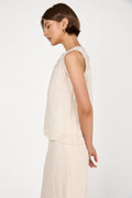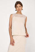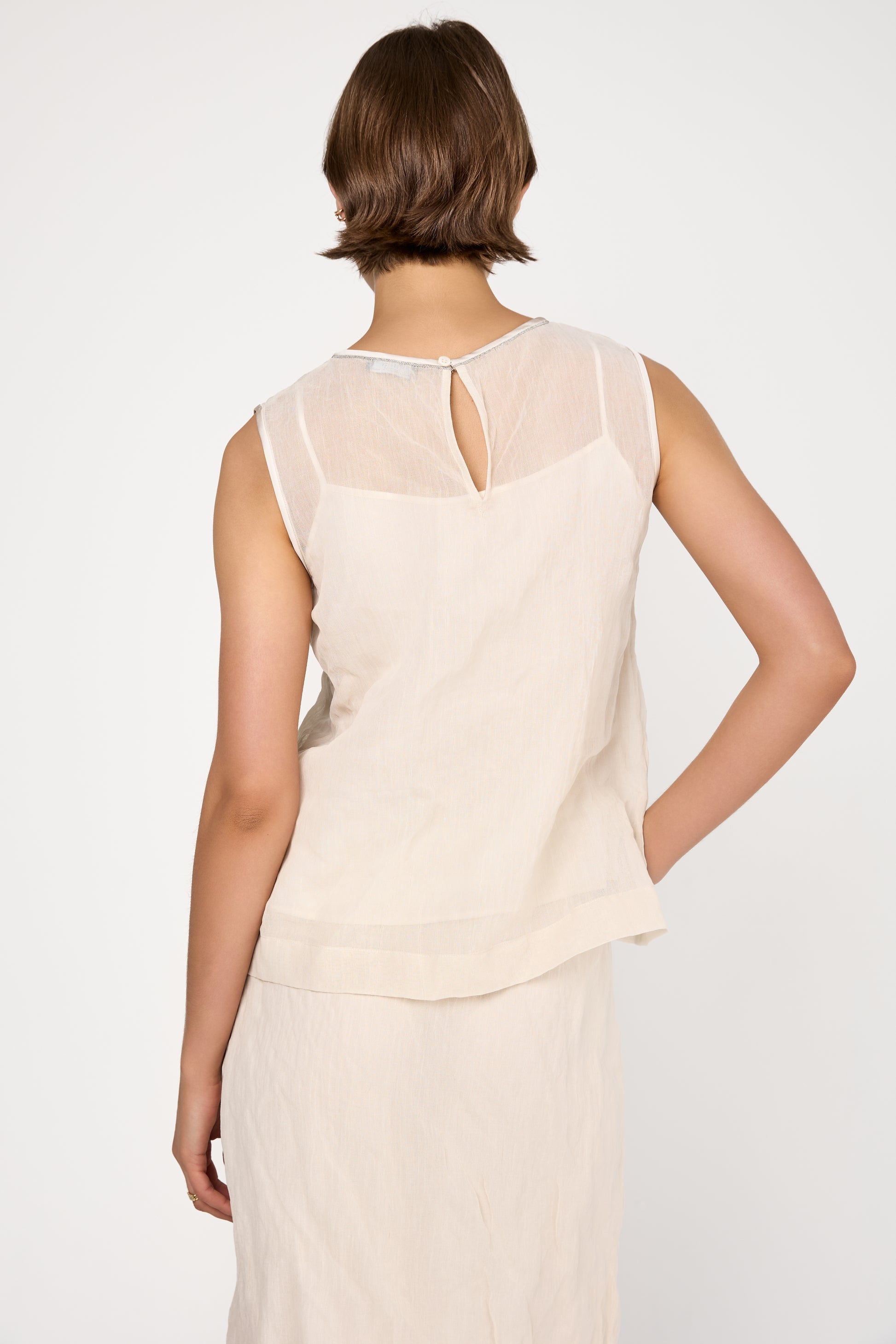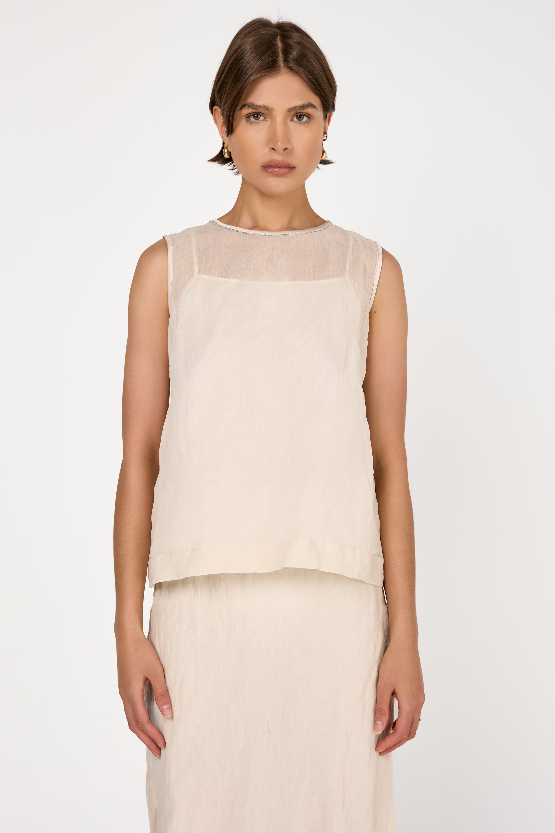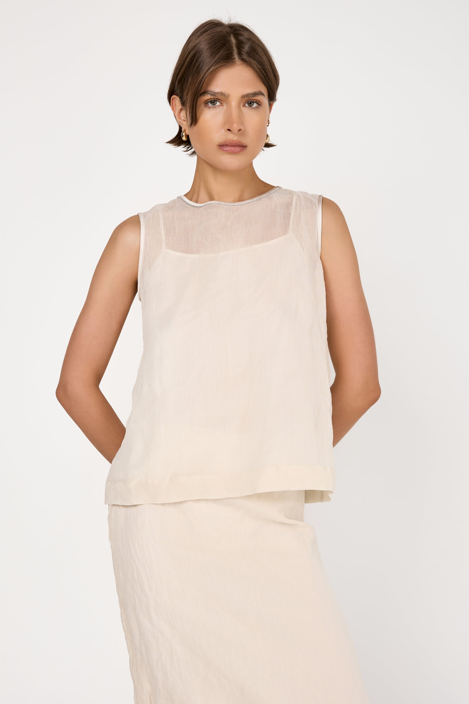 The PESERICO Lined Crushed Organza Top in Almond White, a delicate interplay of texture and light, is crafted in Italy from lightweight metallic cotton organza. It has a crinkled texture that adds a distinctive touch, while the sheer fabric is beautifully balanced by a discreet slip top for an effortlessly sophisticated look. The sleeveless, crew neck silhouette offers a modern, boxy fit, creating a relaxed yet polished aesthetic.Ā