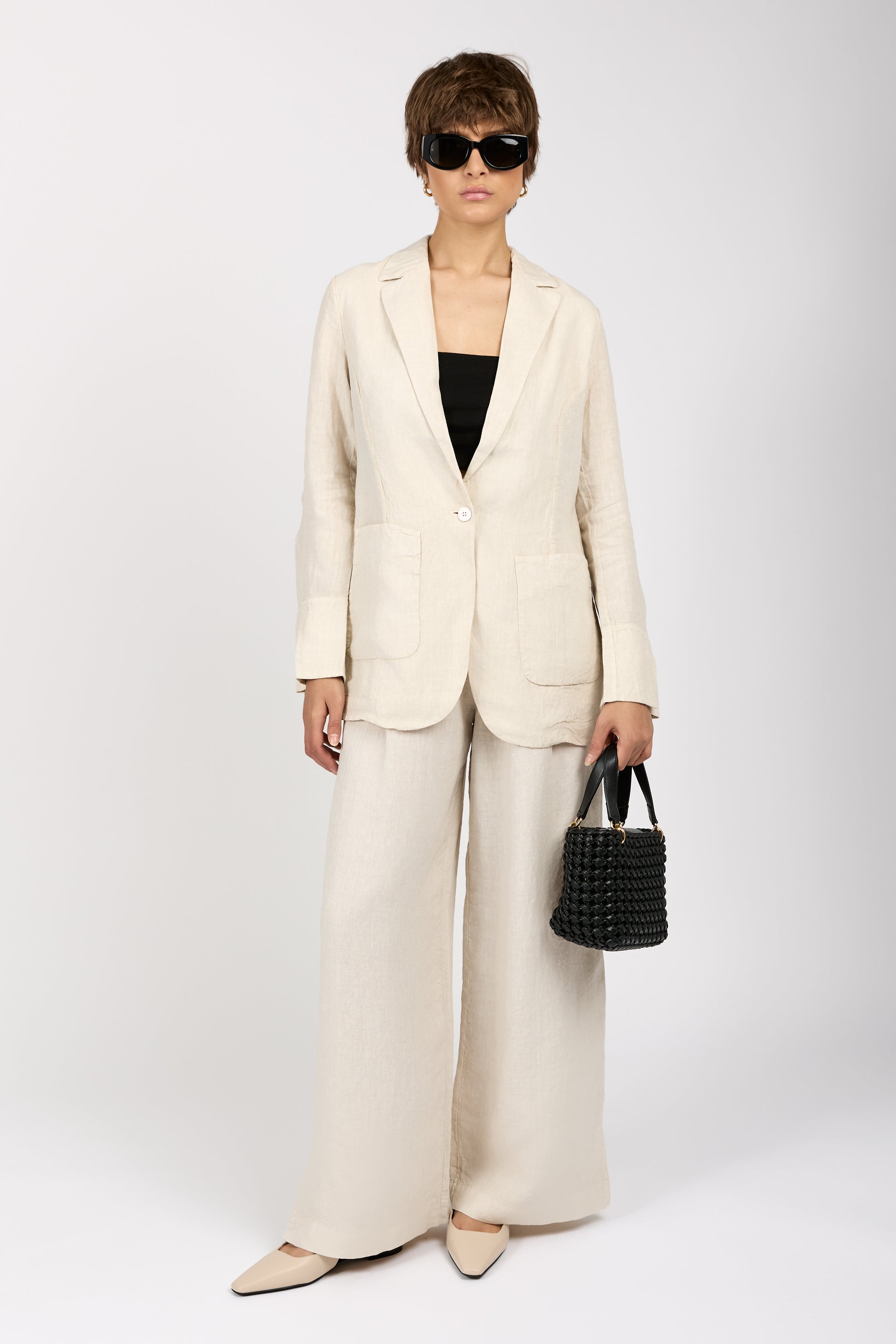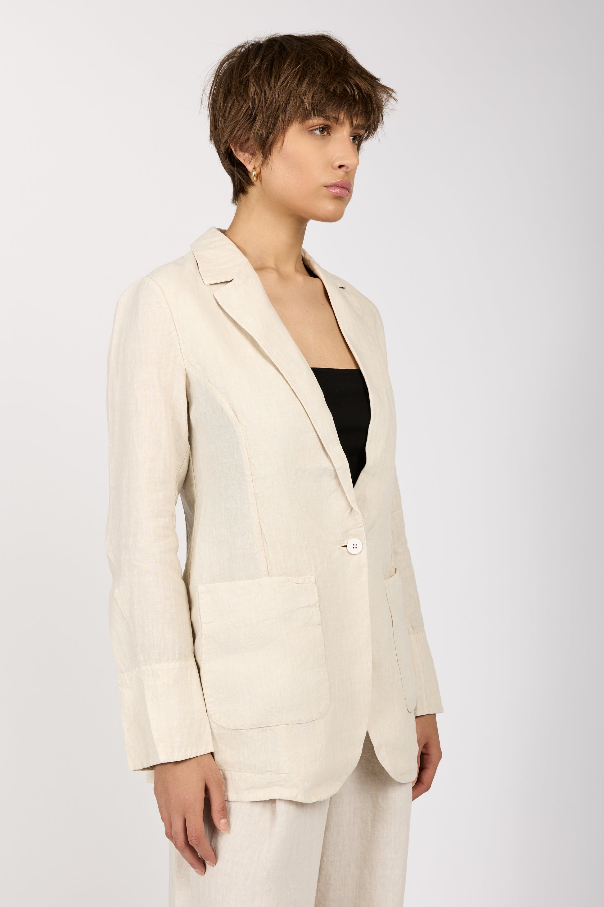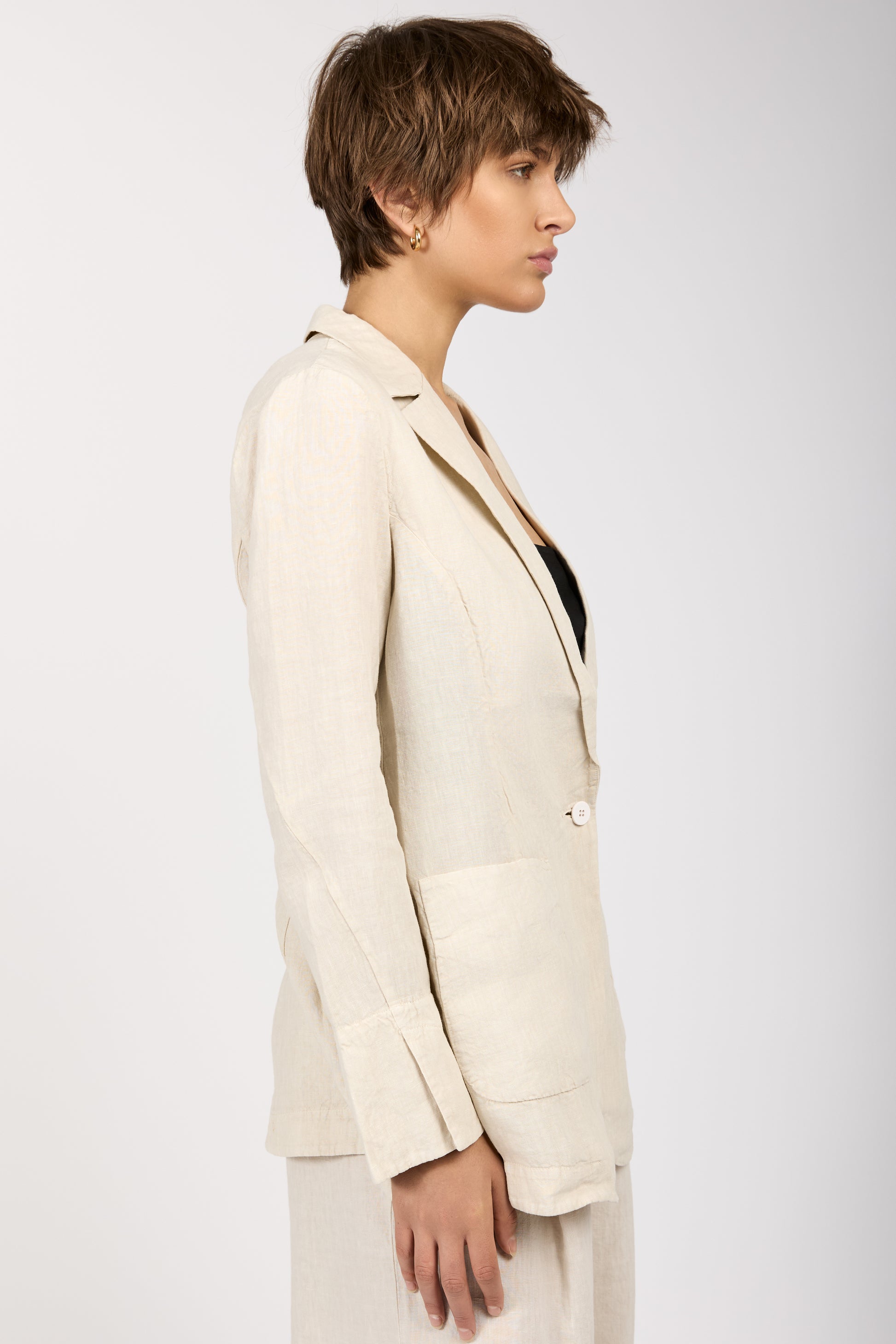 The TANDEM Linen Blazer Jacket in Sand is the perfect mix of comfort and sophistication. It's made from lightweight, breathable linen, so it's great for layering or wearing on its own. The neutral Sand tone makes it super versatile and easy to style for any occasion, whether it's casual or professional.