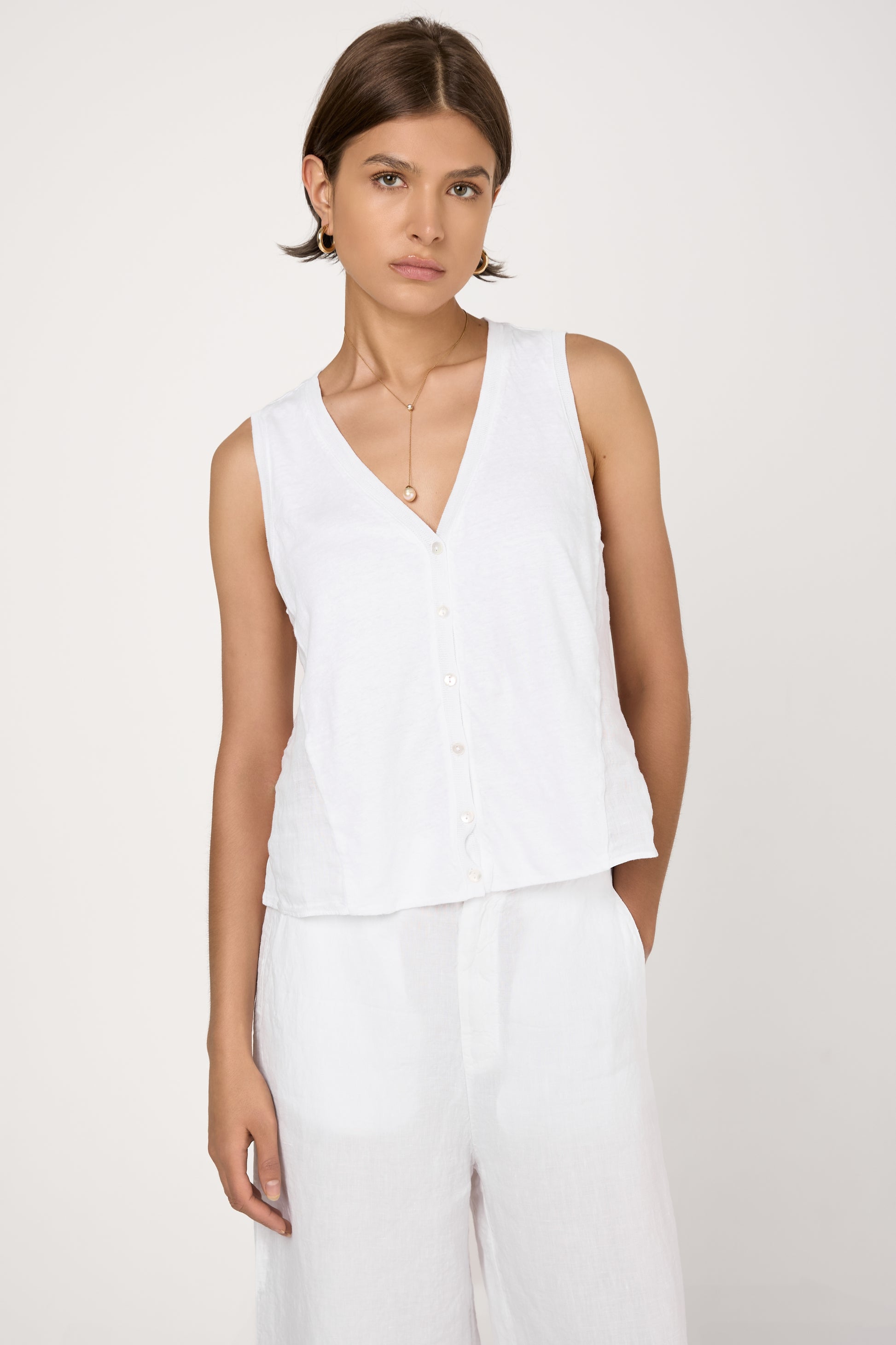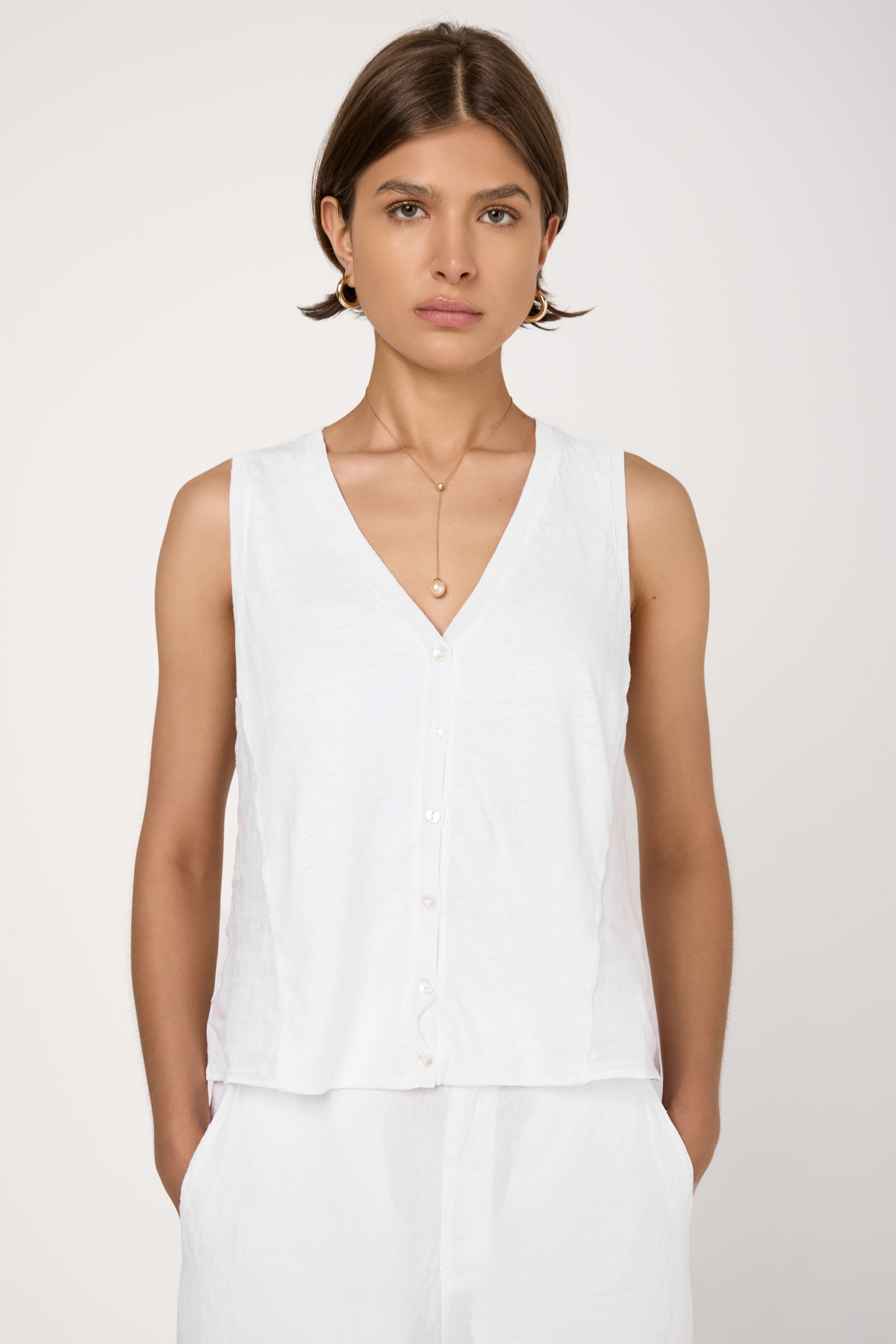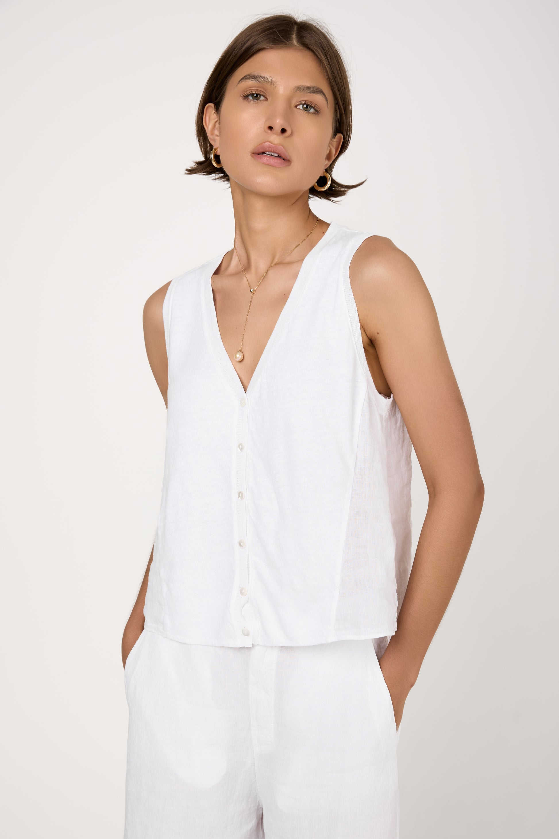 The TRANSIT Linen Jersey Vest in White is crafted in Italy from a breathable linen blend and garment-dyed for a softly textured finish. Designed with a relaxed comfort fit, it features ribbed knit trims at the armholes, neckline, and front for subtle structure. The elongated back adds fluidity and dimension, while the button-down front offers versatile styling.