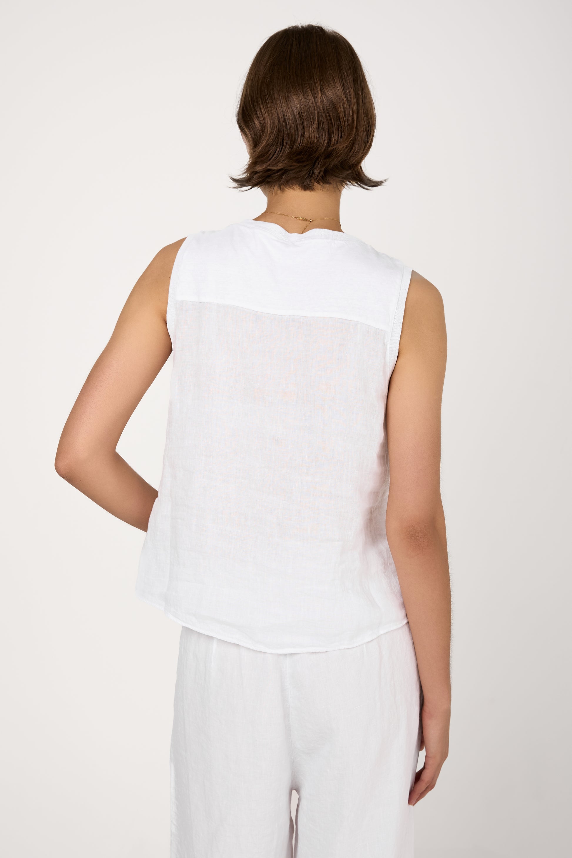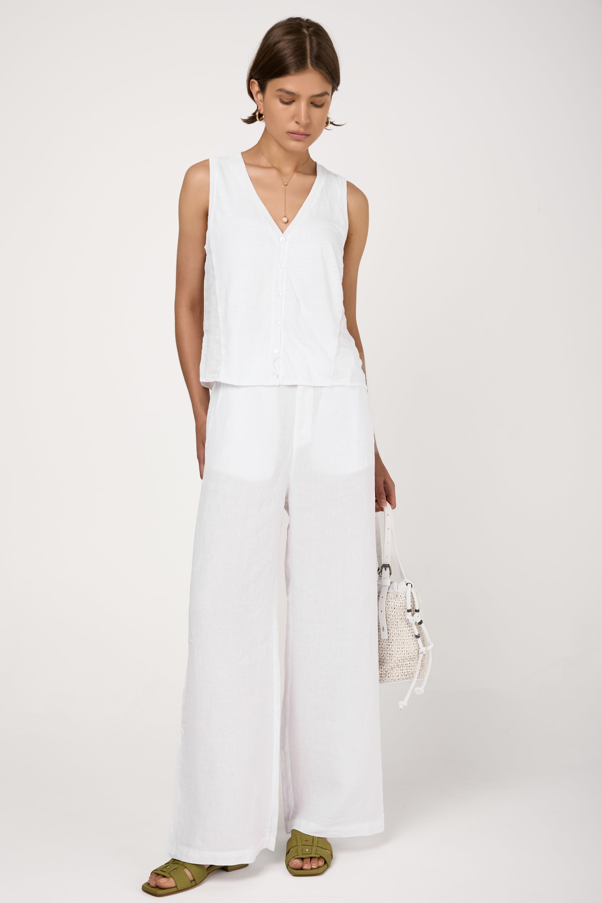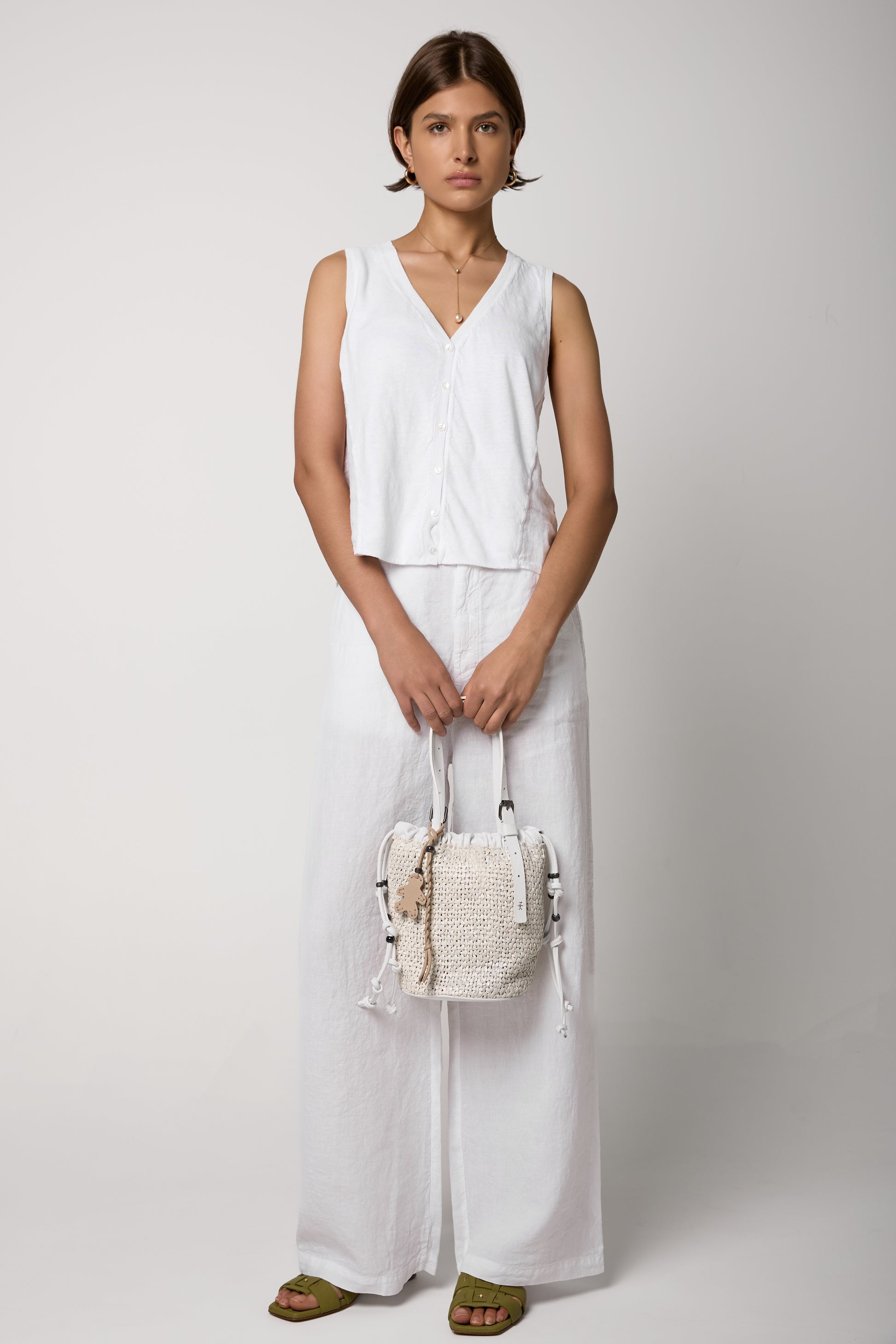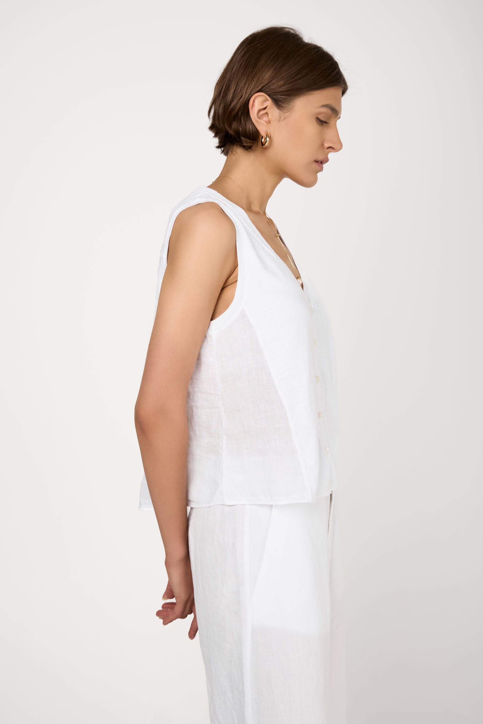 The TRANSIT Linen Jersey Vest in White is crafted in Italy from a breathable linen blend and garment-dyed for a softly textured finish. Designed with a relaxed comfort fit, it features ribbed knit trims at the armholes, neckline, and front for subtle structure. The elongated back adds fluidity and dimension, while the button-down front offers versatile styling.