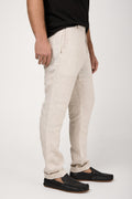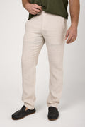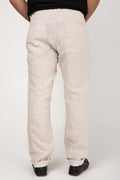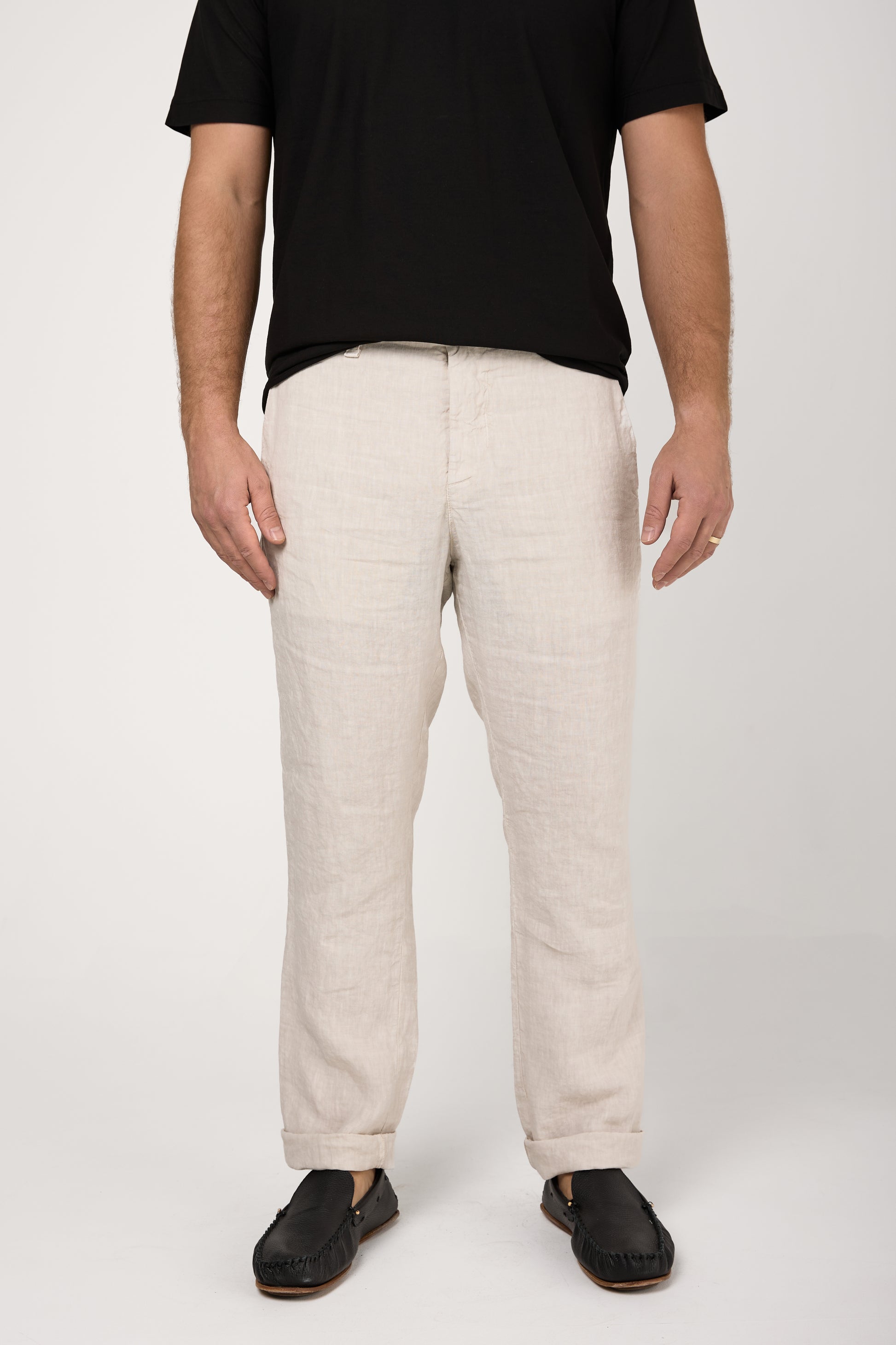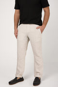 The TRANSIT Linen Trousers in Stone are designed in a regular fit and crafted in Italy from premium linen. They feature belt loops, a button closure with cotton fibre buttons, and front side-seam pockets. The back is refined with yoke-aligned pockets and subtle stitched detailing, enhancing the minimalist silhouette.