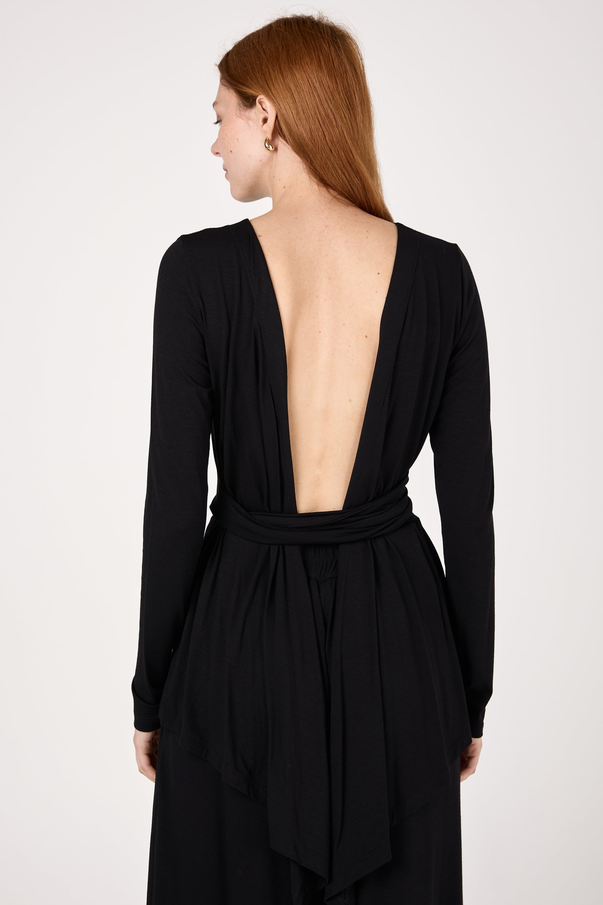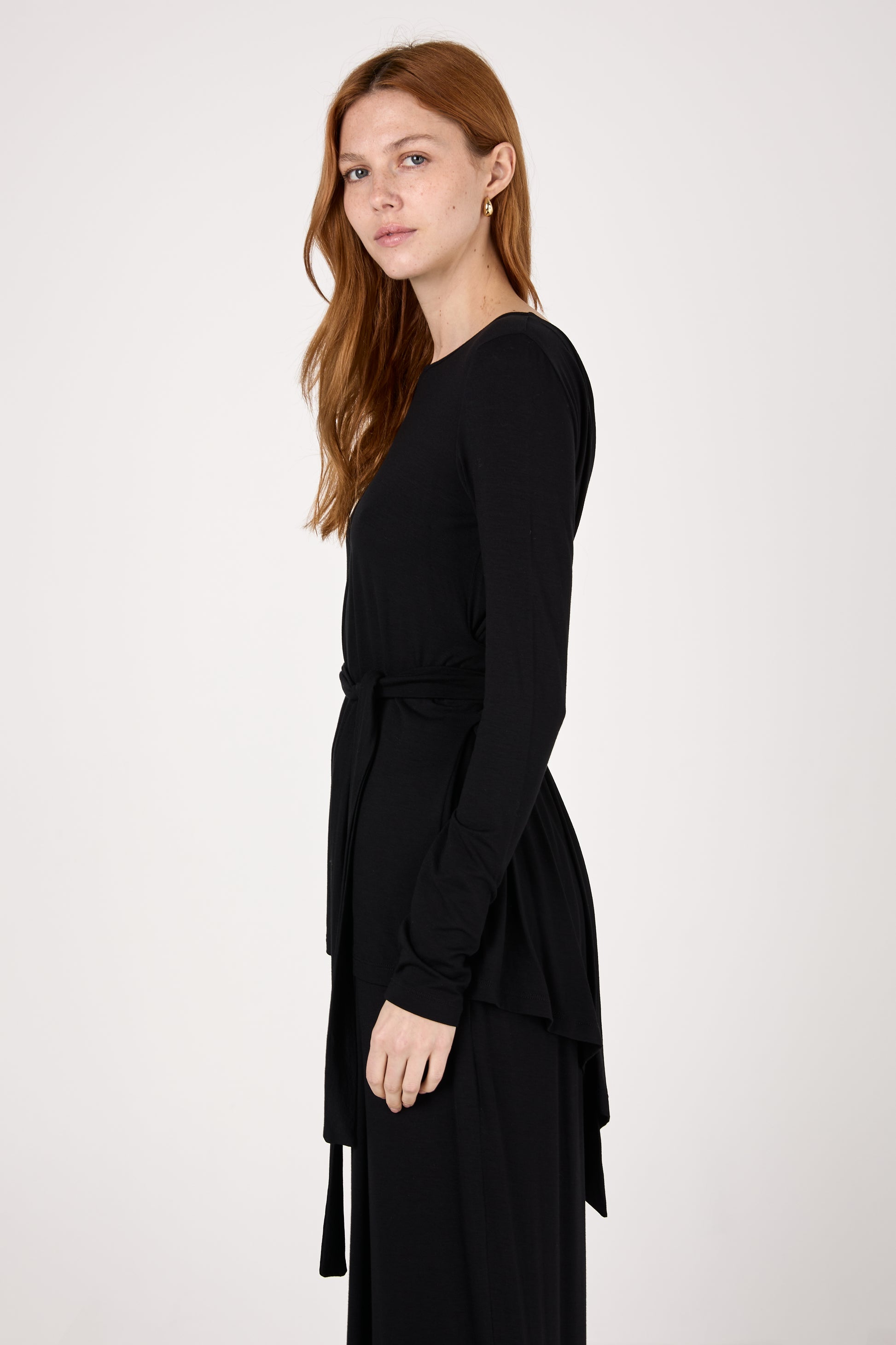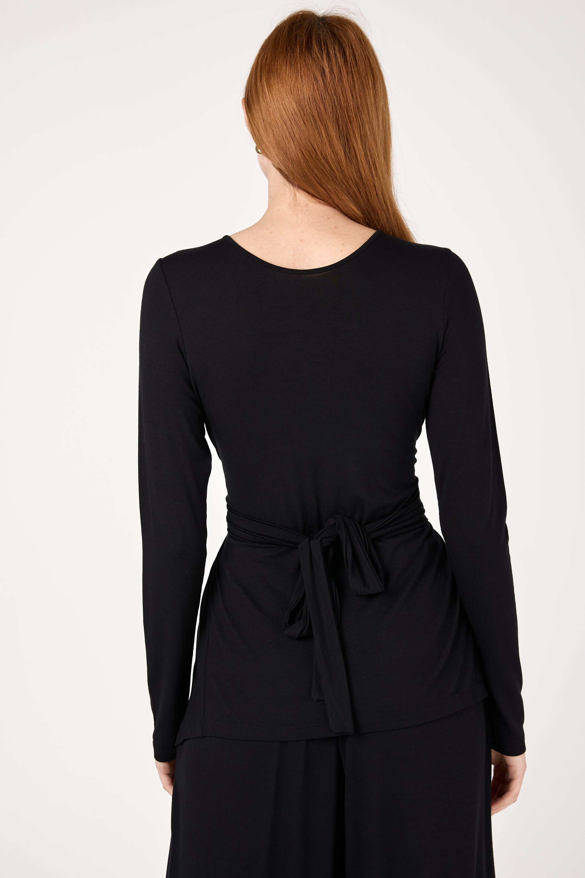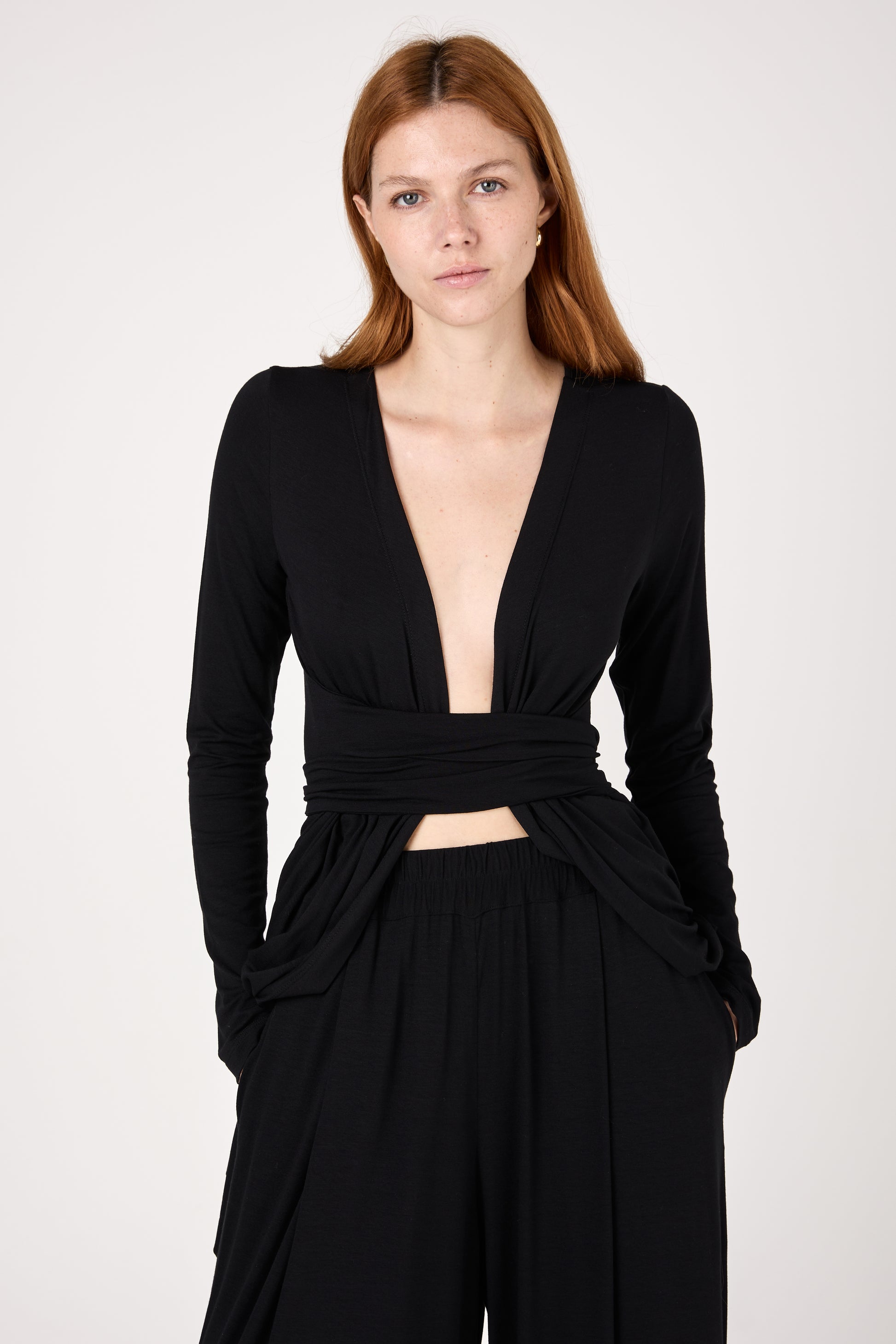GENTRYPORTOFINO Long Sleeve Viscose Top in Nero. Versatile wrap top designed with a V neckline and long sleeves. Its slimming silhouette, enhanced by an adjustable waist tie, allows for a customizable flattering fit. Perfect balance between classic style and modern elegance.