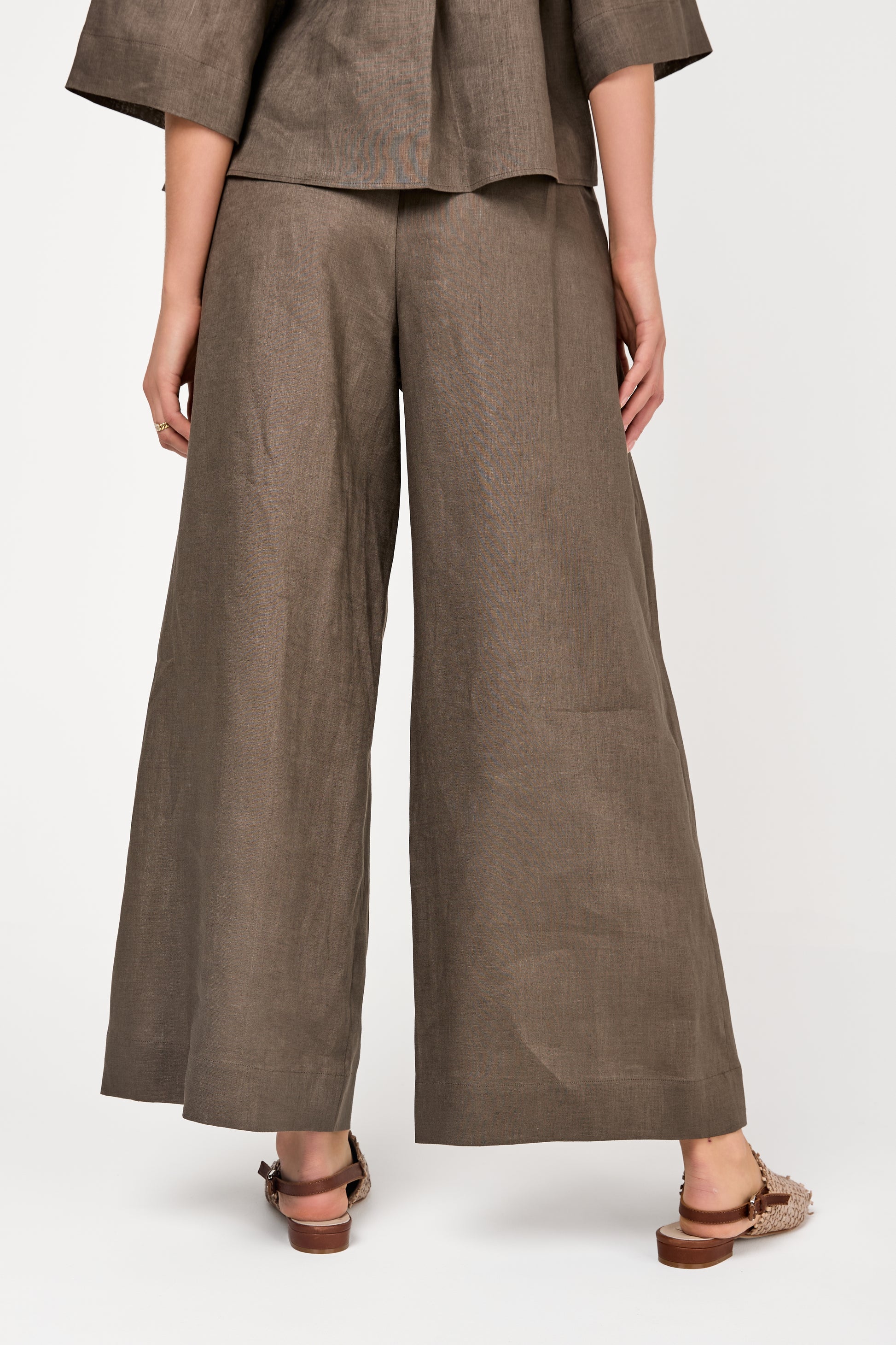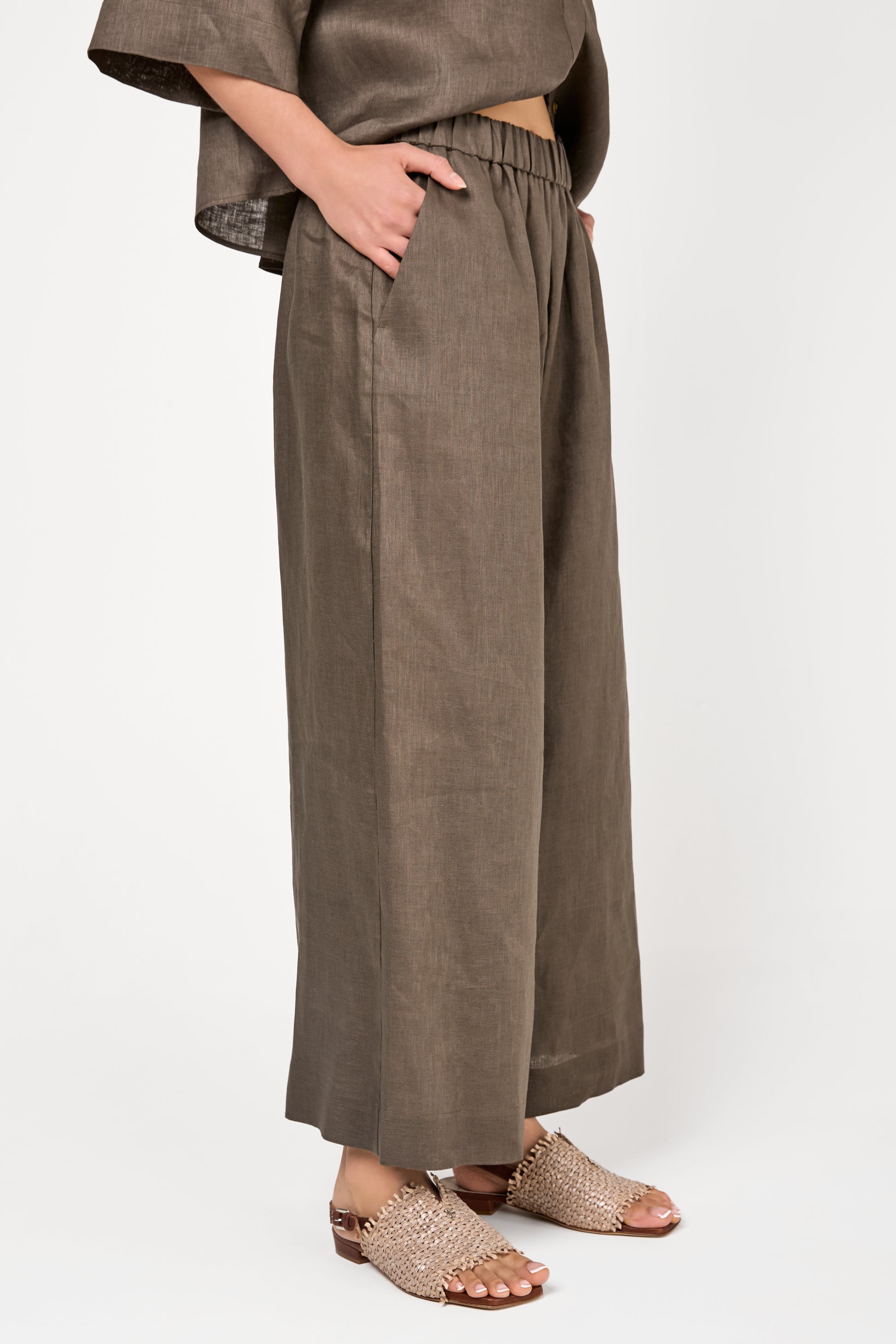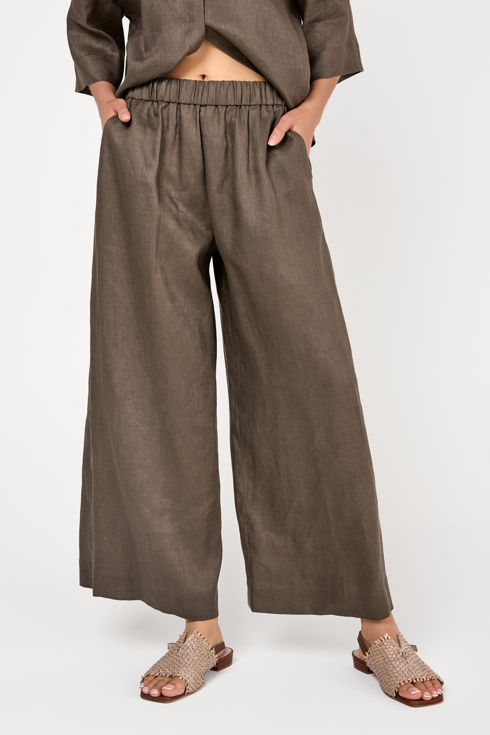 The MAX MARA Minnie Linen Wide Trouser in Dark Green, crafted from 100% pure linen, offer effortless style and breathability. Featuring a comfortable elastic waistband, it provides a perfect fit while maintaining a relaxed, sophisticated silhouette. The rich dark green hue makes them a versatile staple for any wardrobe.