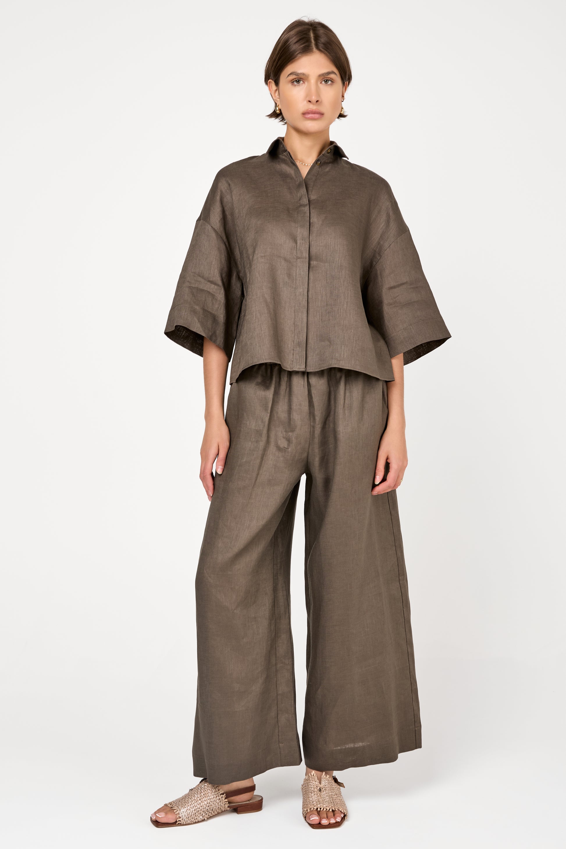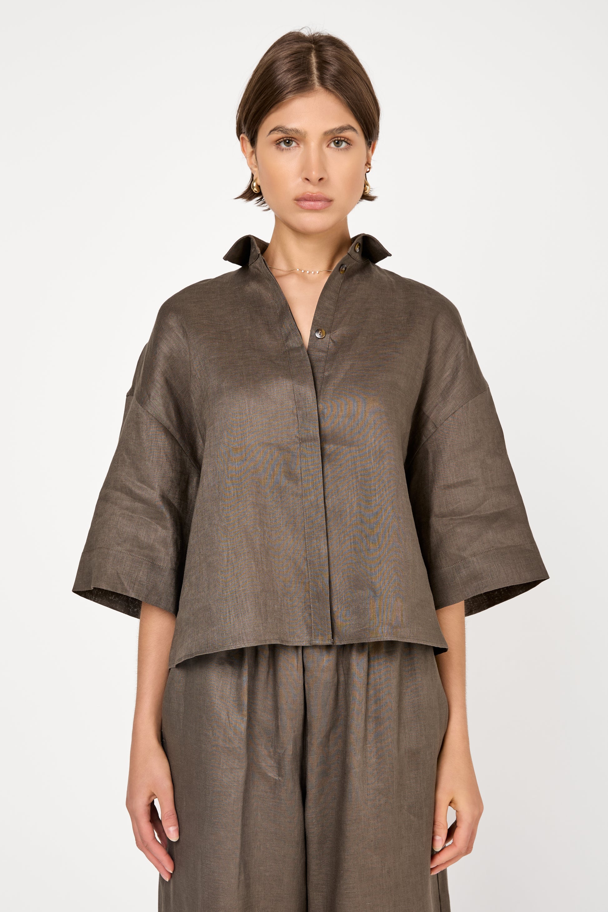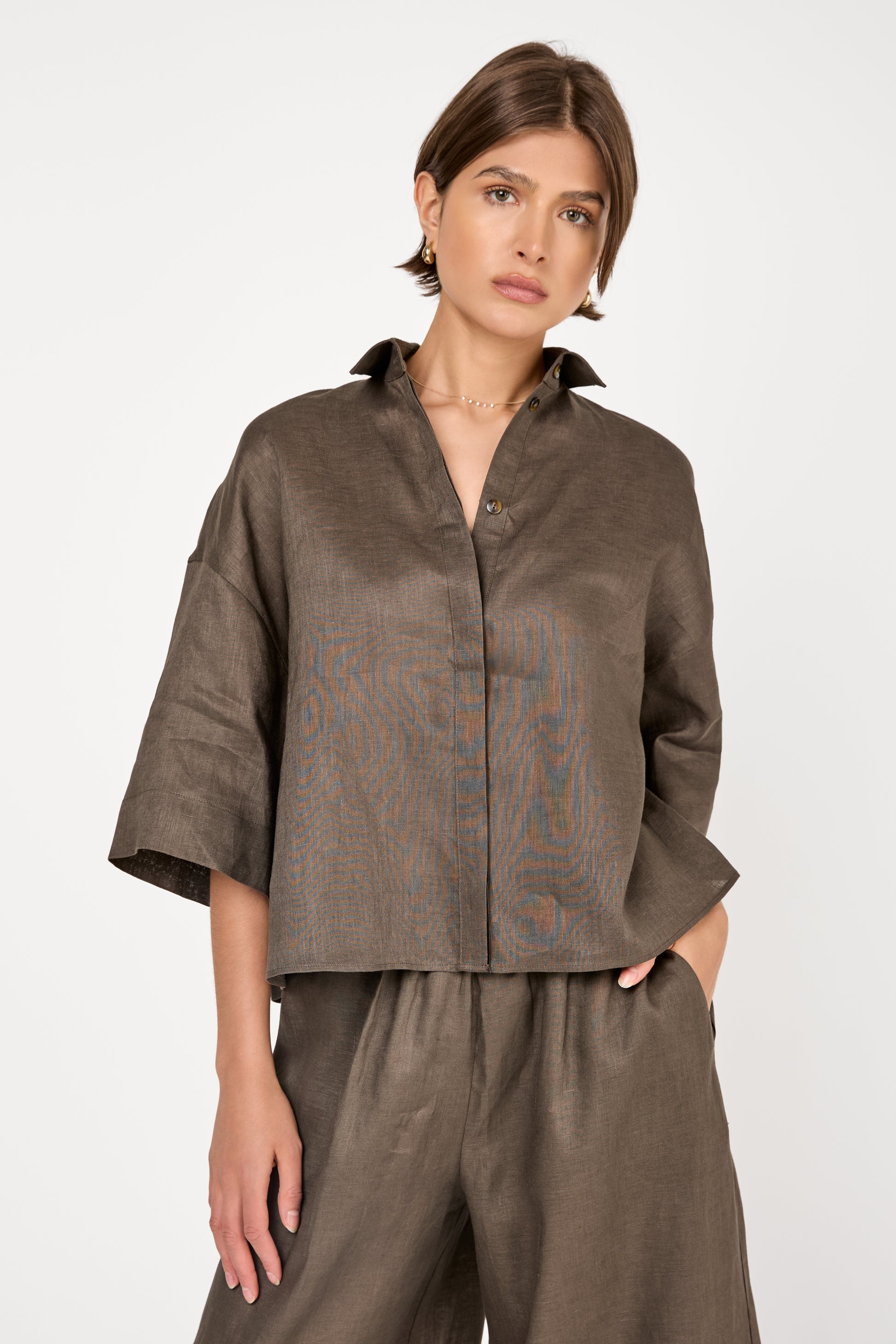 The MAX MARA Mirano Linen Shirt in Dark Green is crafted from 100% pure linen, blending effortless style with breathable comfort. Featuring a structured collar, 3/4-length sleeves, and a hidden button placket, it exudes understated elegance. The dark green hue adds a touch of sophistication.