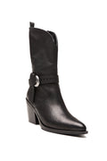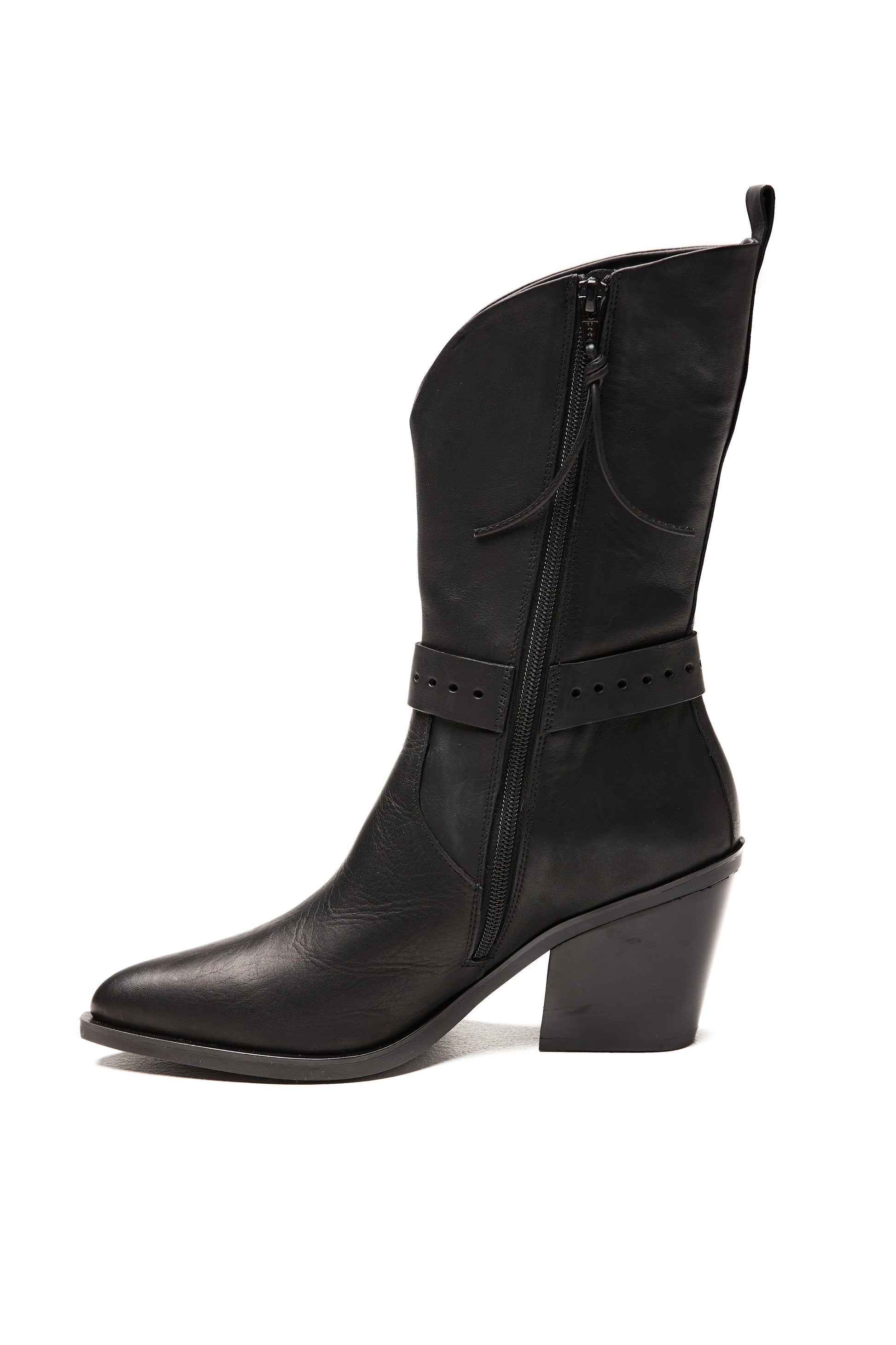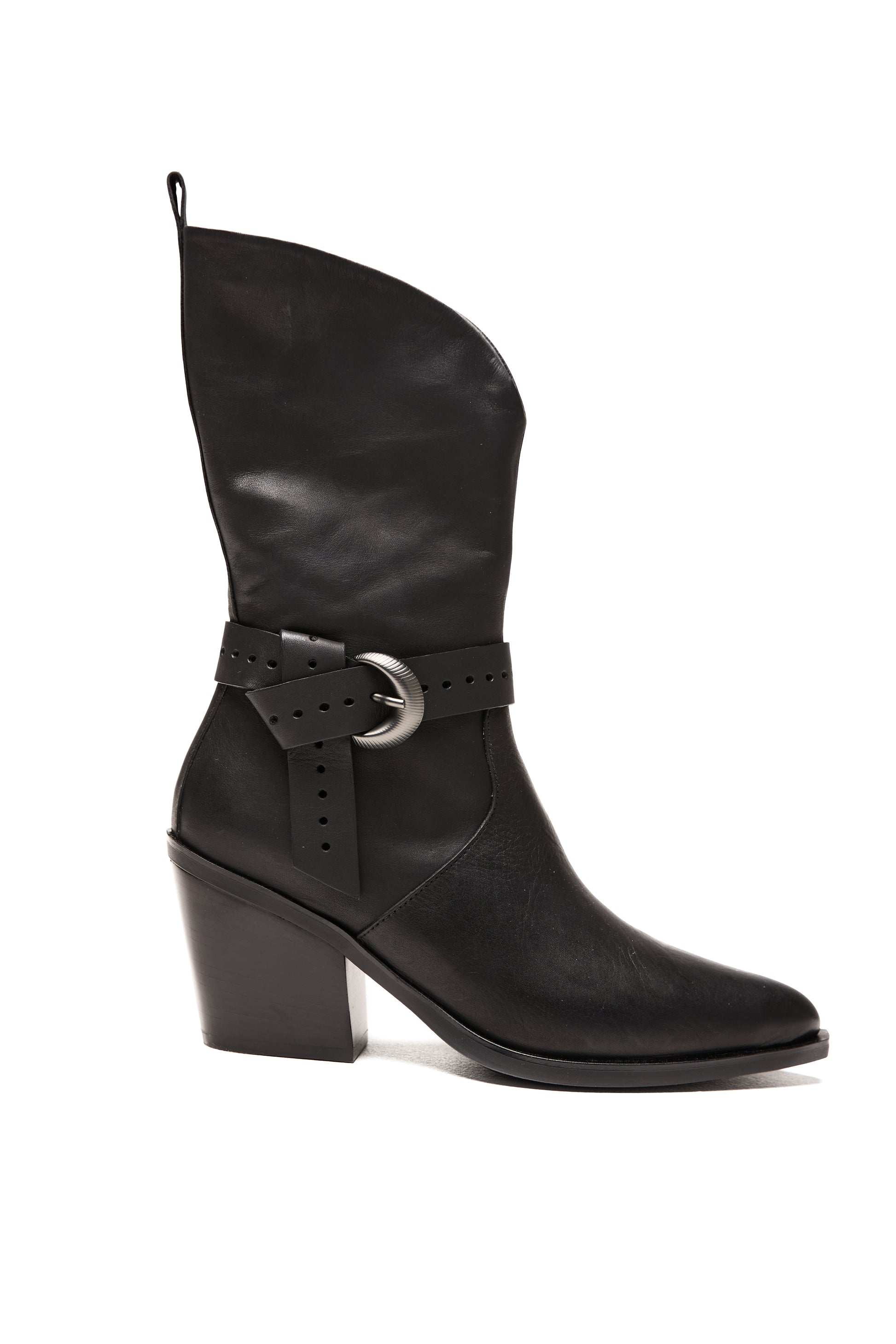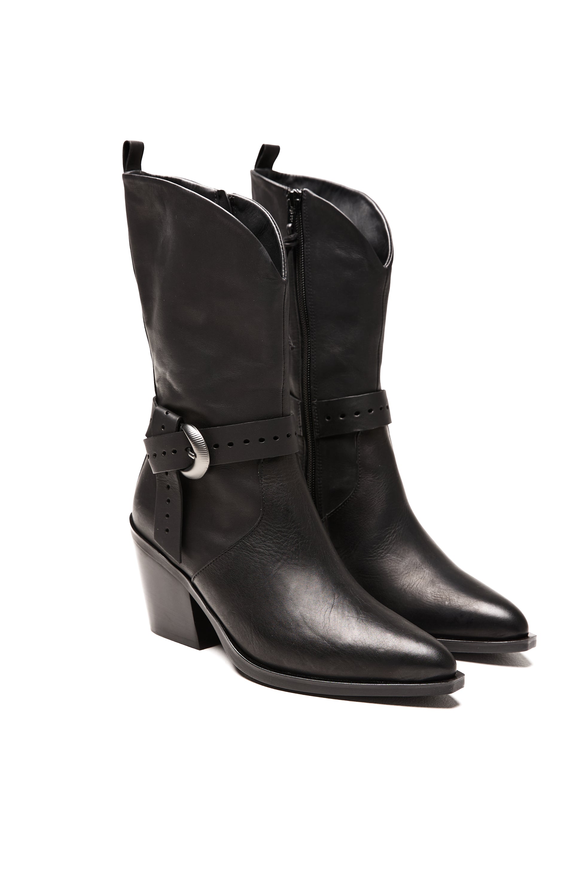 The HENRY BEGUELIN Norton Leather Ankle Boot in Nero is handcrafted in Italy from supple Norton leather. This Texan-inspired design, featuring a slightly higher shaft, is detailed with a sleek side zipper and a decorative leather strap with a bold buckle that adds a touch of modern character. Set on a comfortable heel and finished with a durable rubber sole, this boot perfectly balances confident style with everyday comfort.Ā