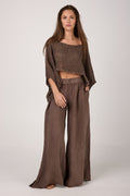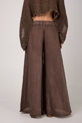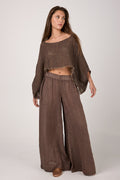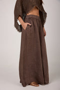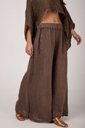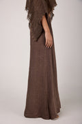 BOTTEGA DI BRUNELLA Pantalone Canova Filo Louvre Linen Pant in Carrubo. Fluid pull-on pant crafted from natural biodegradable linen with gold metallic threads. Designed with a relaxed silhouette, an elasticated waist, side pockets, and on-trend wide legs for an elegant Mediterranean look.Ā
