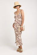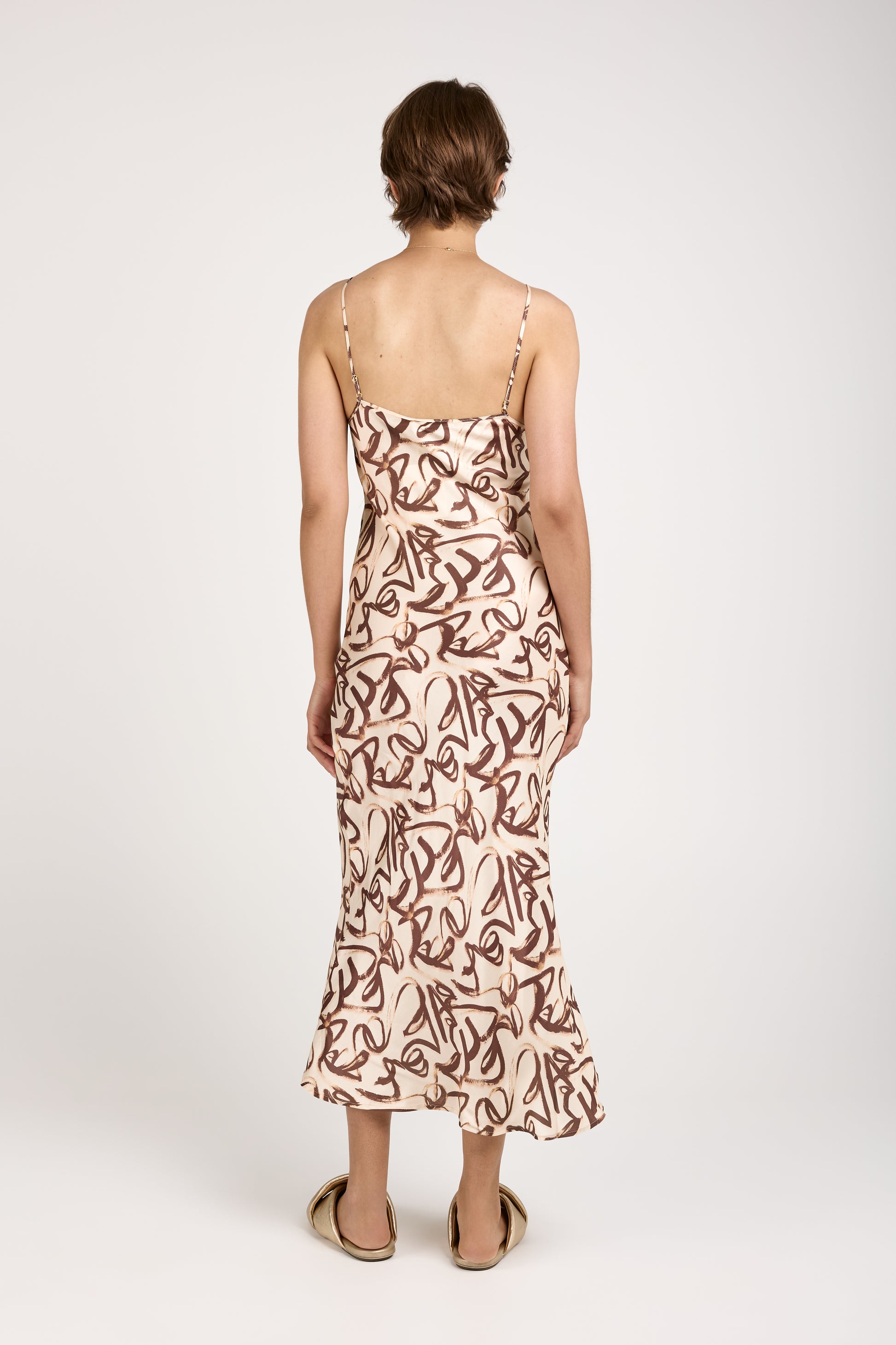 The AERON Prima Maxi Dress in Sienna features an elegant bias-cut design with an abstract print. Crafted from a luxurious silk-viscose blend, this dress offers fluidity and modern style, perfect for formal events or elevated casual wear.