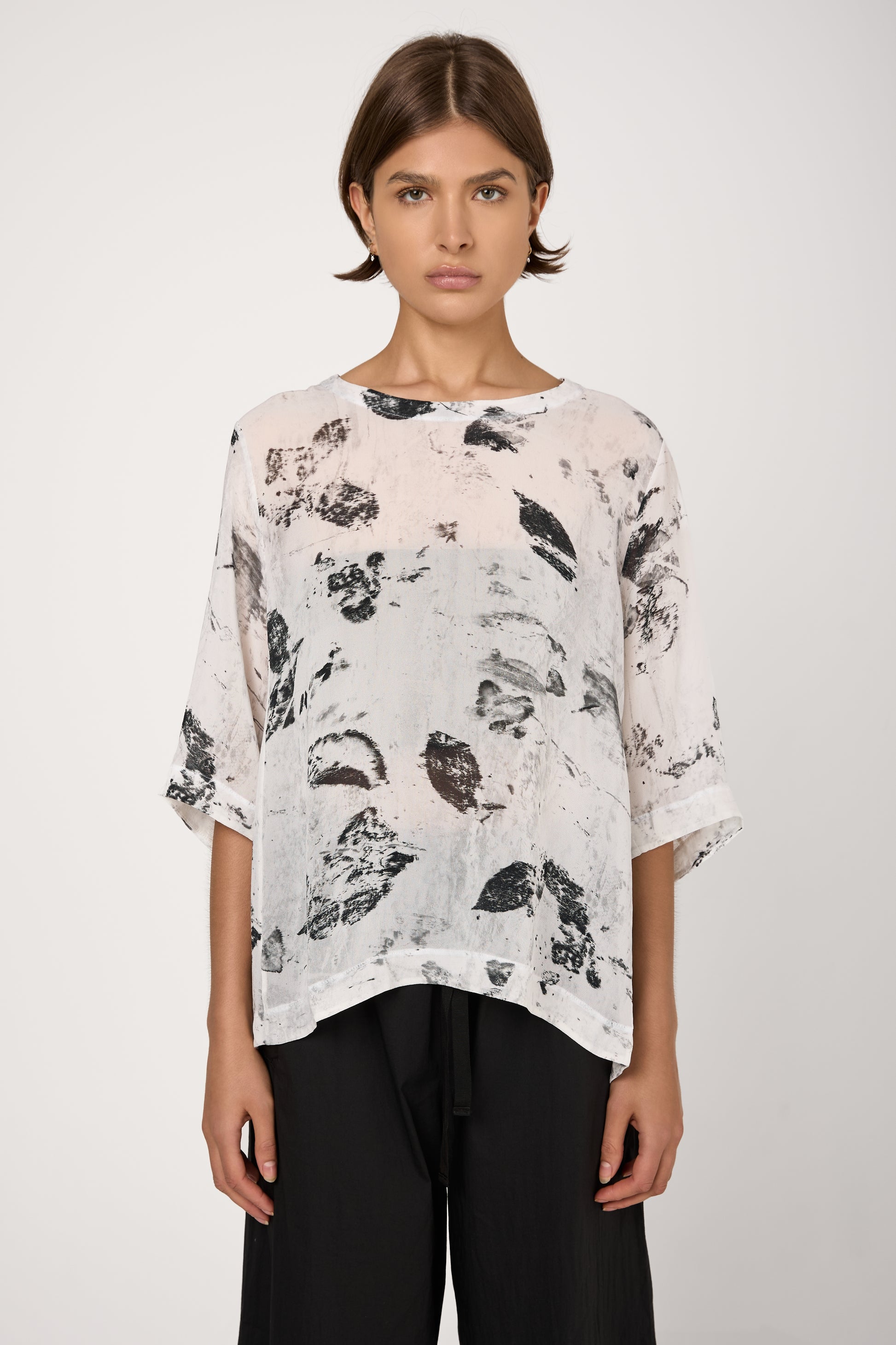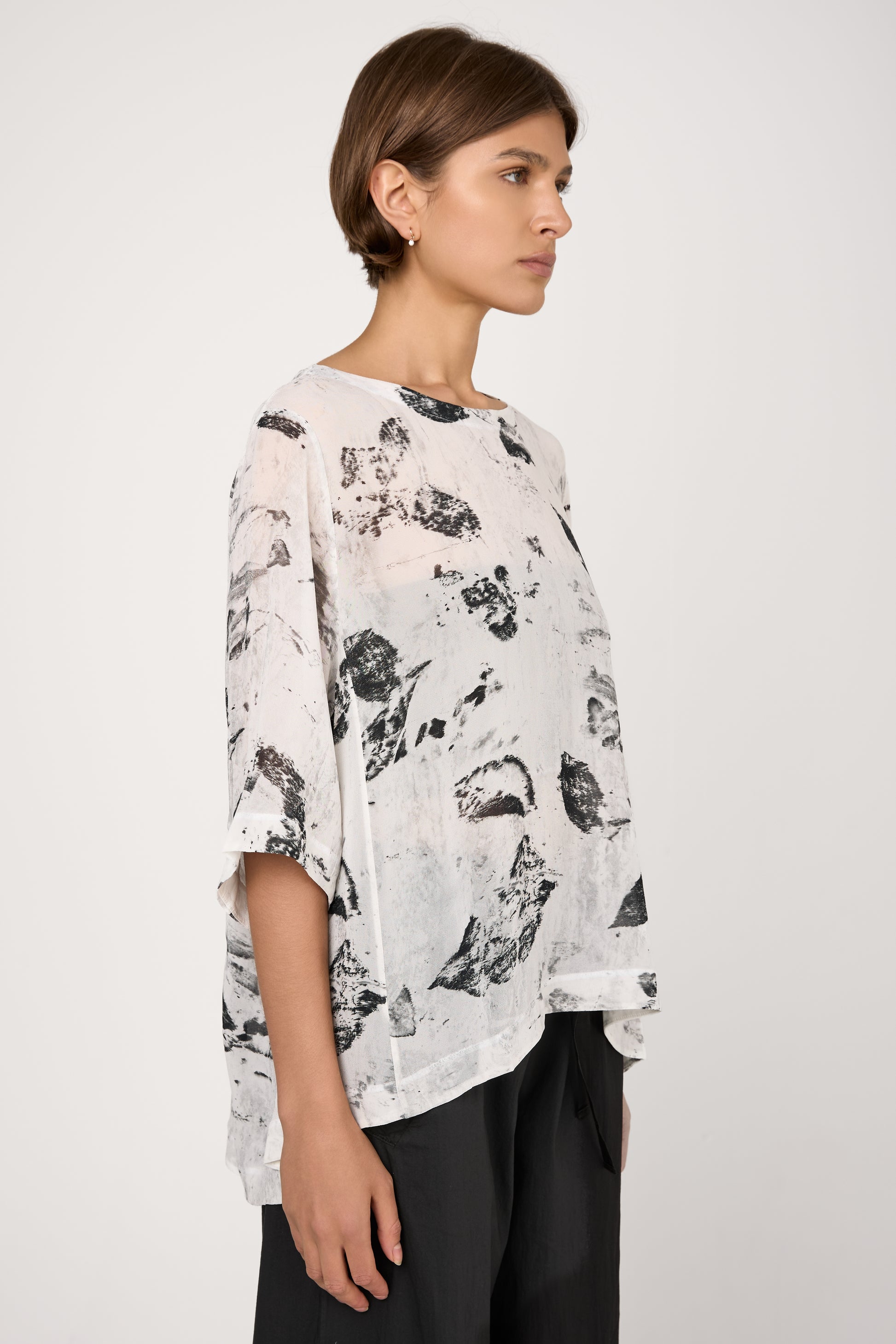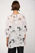 The TRANSIT Printed Viscose Georgette Shirt in White is crafted in Italy from sheer viscose georgette with a soft, washed finish. The flared silhoeutte and wide elbow-length sleeves create gentle movement, while the round neckline and back button closure add understated elegance.