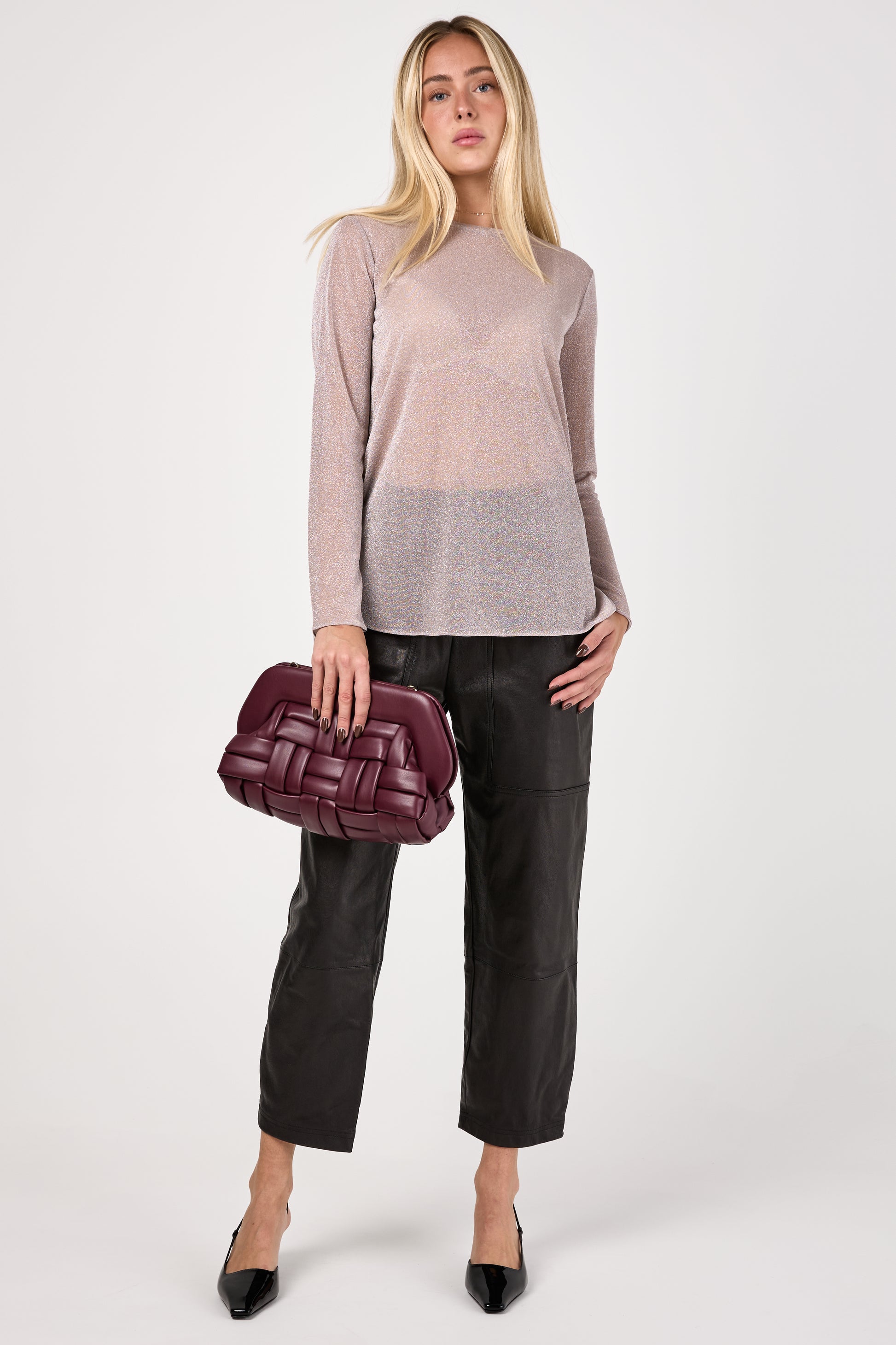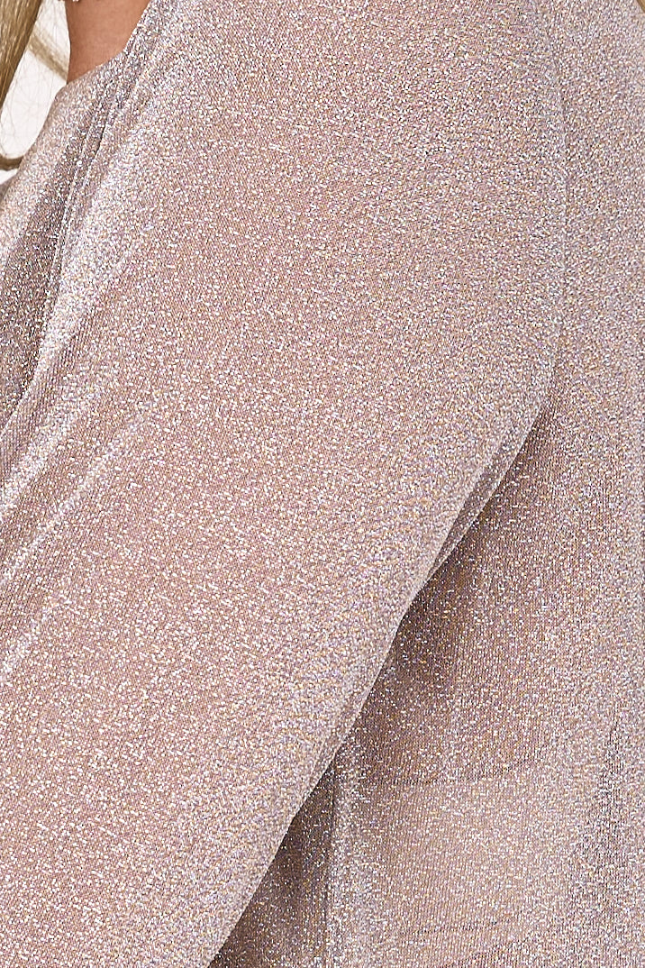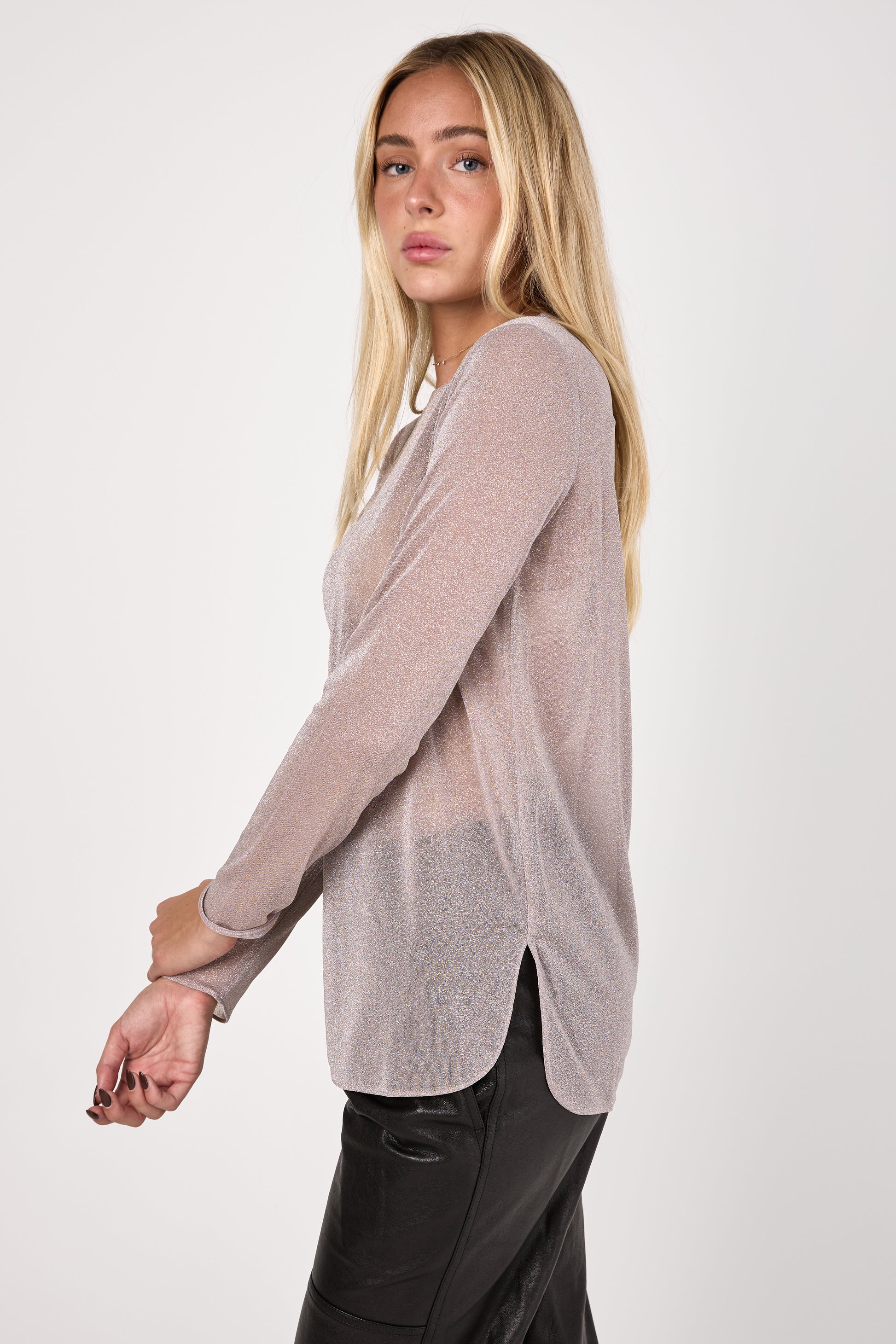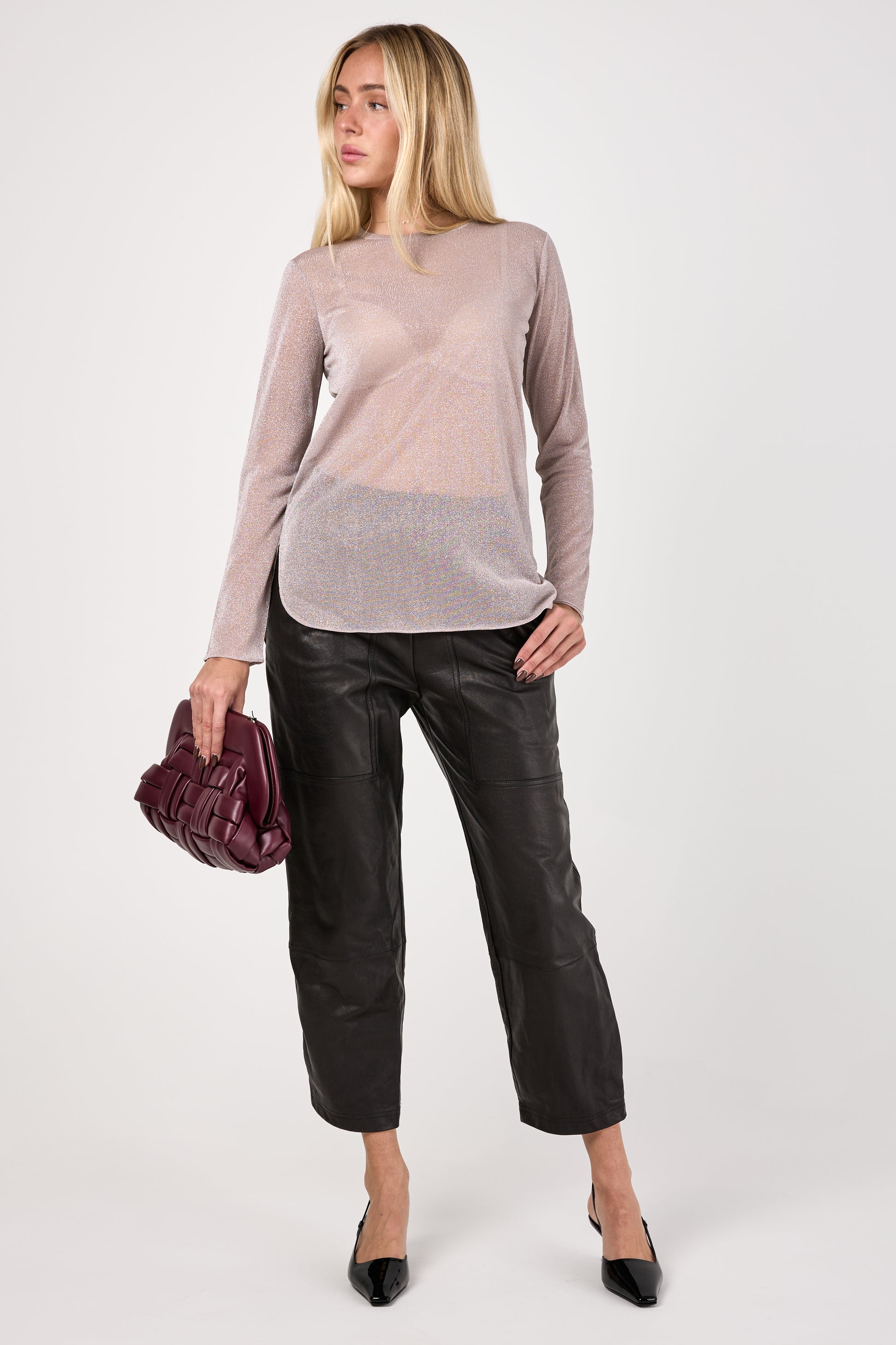 The MAX MARA Prugna Knit Top in Powder Lurex brings subtle glamour to any look. Made from soft lurex jersey, this top features a rounded hem, side slits, and a see-through effect that adds a hint of shine. The straight-cut design and long sleeves make it versatile and chic, perfect for day-to-night styling.