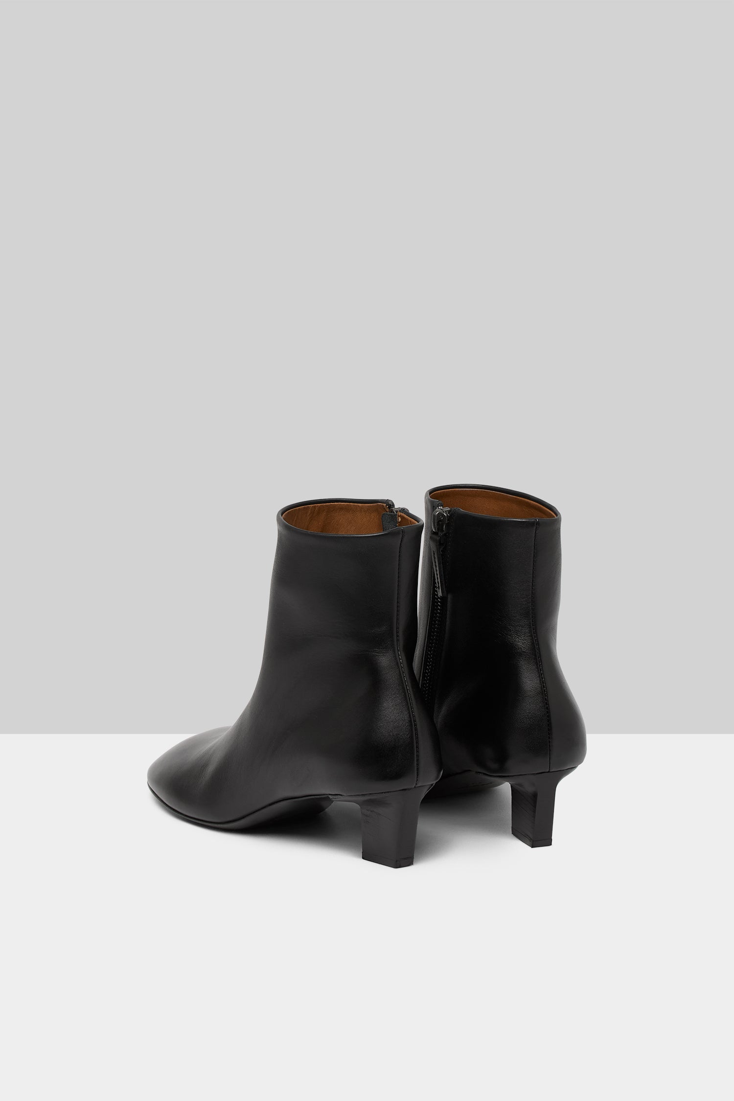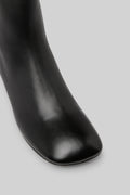 The MARSÈLL Quama Leather Ankle Boot in Black is handcrafted in Italy from supple black leather. It features a subtly squared toe with rounded edges and a low block heel for understated sophistication. A concealed inner side zip preserves the clean silhouette, while the soft leather lining offers lasting comfort throughout the day.