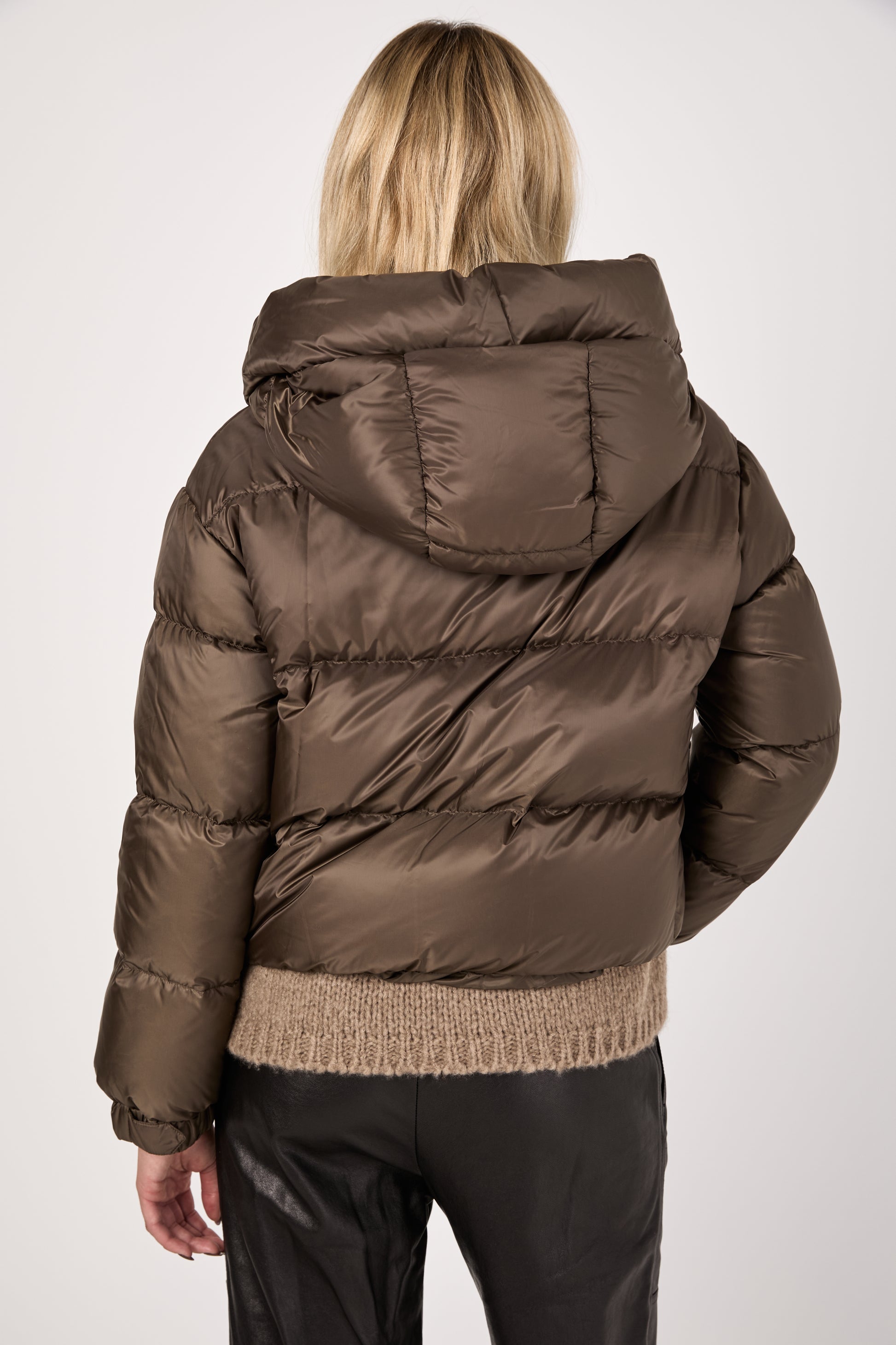 MAX MARA THE CUBE Seie Quilted Jacket in Brown Green. Luxurious must-have cropped puffer jacket from The Cube Collection. Boasting a non-detachable drawstring hood, welt pockets, front zip fastening with leather slider and long sleeves with adjustable elastic cuffs. Filled with virgin goose-down for warmth and comfort. Water repellent and easy to pack.