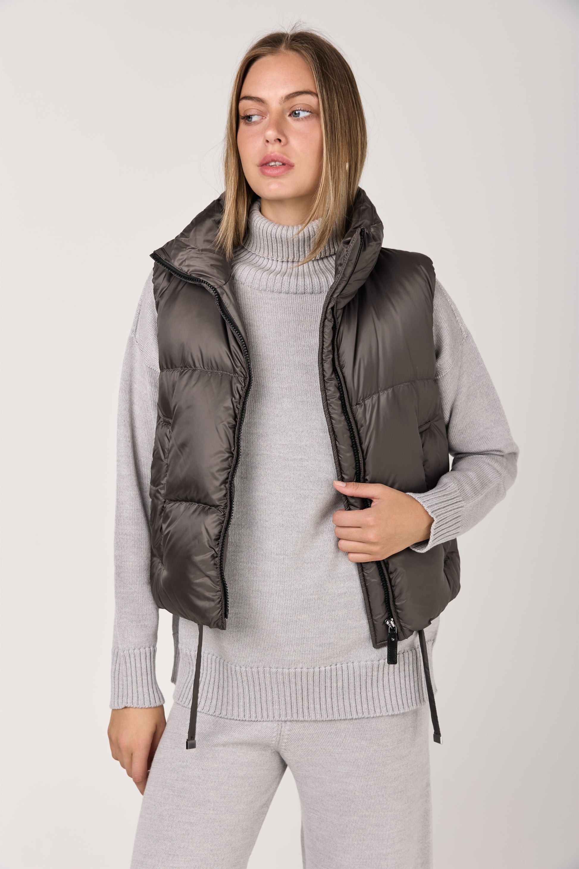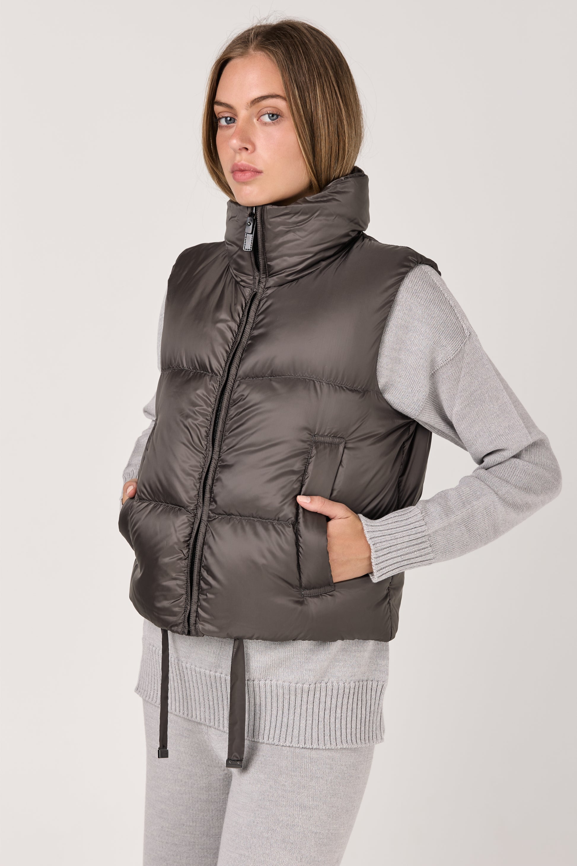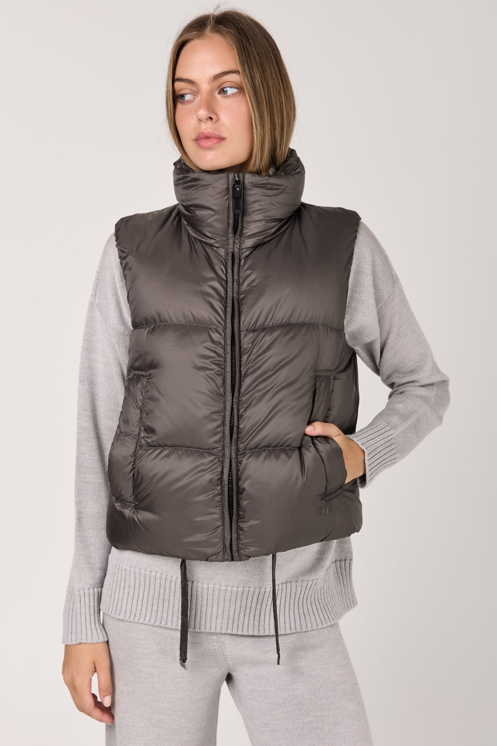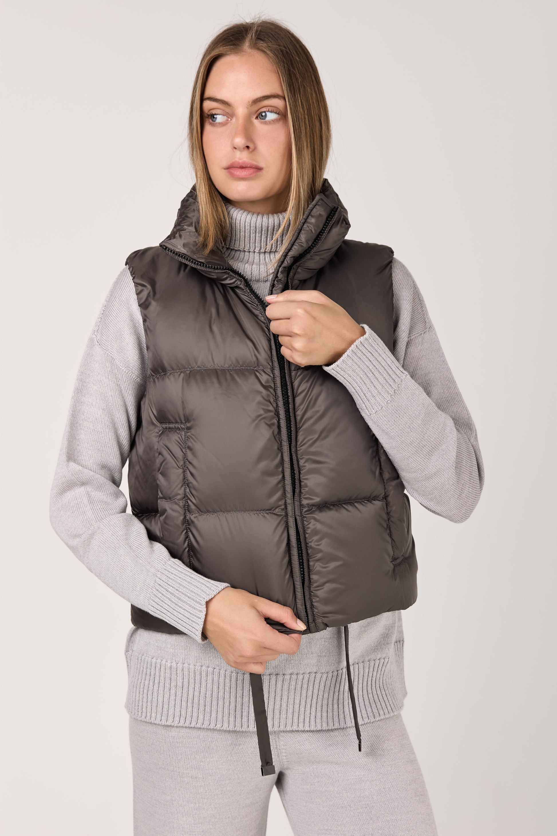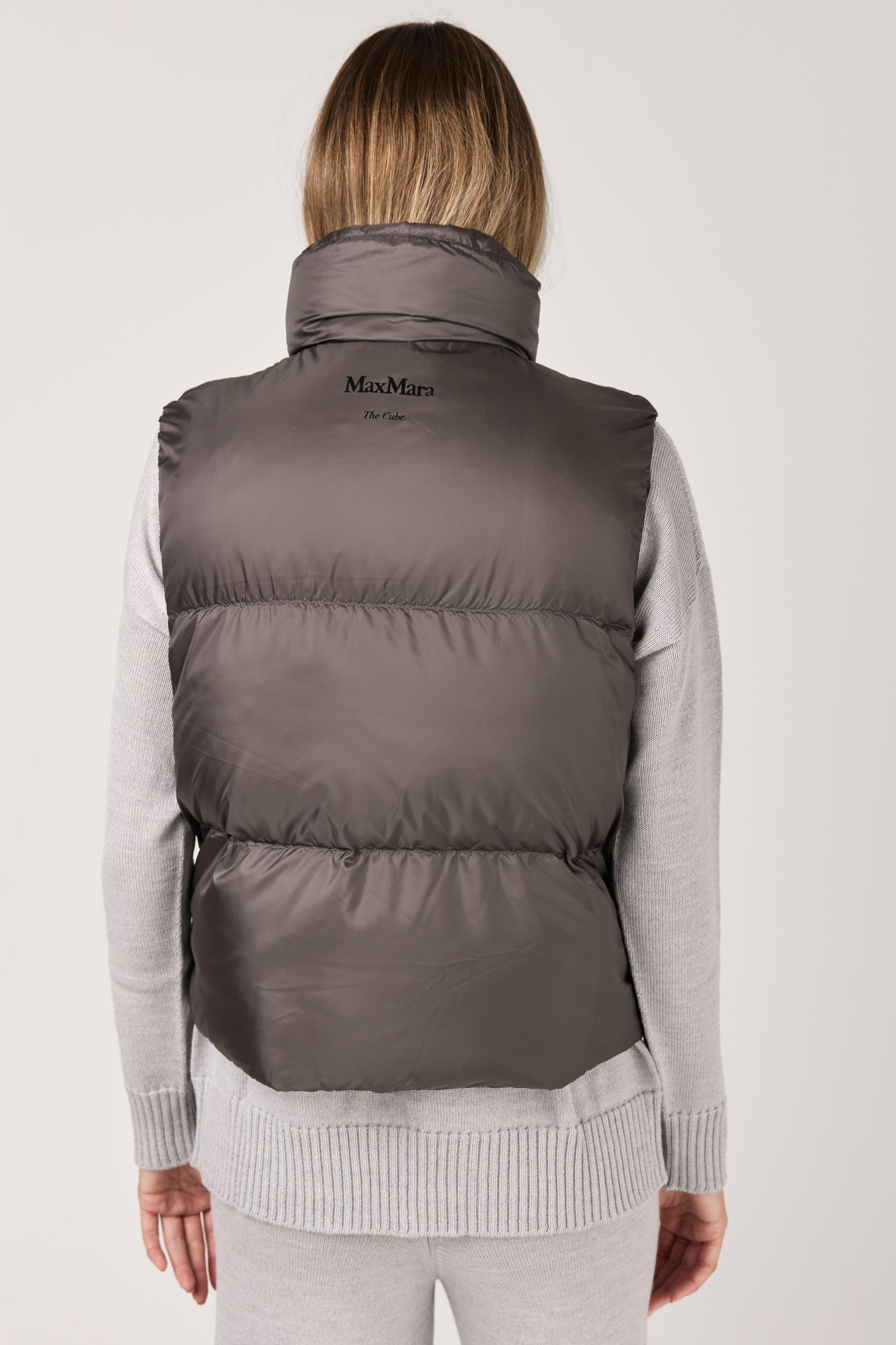 The MAX MARA THE CUBE Seismall Puffer Waistcoat in Medium Grey is crafted in water-repellent technical canvas with a cropped, modern silhouette. Light yet insulating, it is padded with premium virgin goose-down for exceptional warmth without bulk. Designed with meticulous attention to detail, this waistcoat features a full-length zip fastening, a high neck, welt side pockets and an adjustable drawstring hem. Finished in a versatile medium grey, it pairs effortlessly with elevated casual or layered everyday looks.Ā