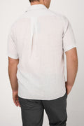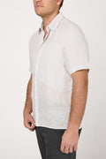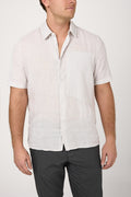 The TRANSIT Short Sleeve Linen Shirt in Ice, crafted in Italy, is cut from a breathable linen-cotton blend with a relaxed silhouette. Featuring a clean point collar and front button fastening, it's elevated by a unique trapezium-shaped yoke and a discreet central vent at the back for added movement. A side-entry chest pocket lends contemporary utility, while the garment-dyed ice hue offers a cool, refined finish.Ā